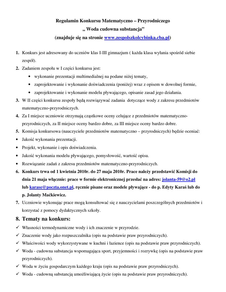 Regulamin Konkursu Matematyczno – Przyrodniczego „ Woda cudowna substancja” (znajduje się na stronie www.zespolszkolcybinka.cba.pl) 1. Konkurs jest adresowany do uczniów klas I-III gimnazjum ( każda klasa wyłania spośród siebie zespół). 2. Zadaniem zespołu w I części konkursu jest: • wykonanie prezentacji multimedialnej na podane niżej tematy, • zaprojektowanie i wykonanie doświadczenia (poniżej) wraz z opisem w dowolnej formie, • zaprojektowanie i wykonanie modelu pływającego, opisanie zasad jego działania. 3. W II części konkursu zespoły będą rozwiązywać zadania dotyczące wody z zakresu przedmiotów matematyczno-przyrodniczych. 4. Za I miejsce uczniowie otrzymają cząstkowe oceny celujące z przedmiotów matematycznoprzyrodniczych, za II miejsce oceny bardzo dobre, za III miejsce oceny bardzo dobre. 5. Komisja konkursowa (nauczyciele przedmiotów matematyczno – przyrodniczych) będzie oceniać: • Jakość wykonania prezentacji. • Projekt, wykonanie i opis doświadczenia. • Jakość wykonania modelu pływającego, pomysłowość, wartość opisu. • Rozwiązanie zadań z zakresu przedmiotów matematyczno-przyrodniczych. 6. Konkurs trwa od 1 kwietnia 2010r. do 27 maja 2010r. Prace należy przedstawić Komisji do dnia 21 maja włącznie: prace w formie elektronicznej przesłać na adres: [email protected] lub [email protected], ręcznie pisane oraz modele pływające - do p. Edyty Karaś lub do p. Jolanty Maćkiewicz. 7. Uczniowie wykonując prace mogą konsultować się z nauczycielami poszczególnych przedmiotów i korzystać z pomocy dydaktycznych szkoły. 8. Tematy na konkurs: Własności termodynamiczne wody i ich znaczenie w przyrodzie. Znaczenie wody jako rozpuszczalnika (opis na podstawie praw przyrodniczych). Właściwości wody wykorzystywane w kuchni i łazience (opis na podstawie praw przyrodniczych). Woda - cudowna substancja wspomagająca sport, przyjemności i rozrywkę (opis na podstawie praw przyrodniczych). Woda w życiu gospodarczym każdego kraju (opis na podstawie praw przyrodniczych). Woda - cudowną substancją umożliwiającą życie (opis na podstawie praw przyrodniczych). Obieg wody w przyrodzie. Stany skupienia wody (opis na podstawie praw przyrodniczych). Kwaśne deszcze – przyczyny ich występowania i ich wpływ na środowisko. Skutki zanieczyszczeń wód. Skuteczność własnych działań w zakresie odnowy czystości wód. Miejscowości wypoczynkowe nad Bałtykiem. Jeziora i rzeki w gminie Cybinka. Katastrofy wodne spowodowane przez człowieka. Rodzaje elektrowni wodnych na świecie. Woda w liczbach. Wszystkie zagadnienia powinny być tak opracowane, aby w pracach znalazły się wszelkie możliwe prawa przyrodnicze . Doświadczenia: Badanie warunków występowania dyfuzji w wodzie. Wyhodowanie kryształów cukru - szczegółowy opis przebiegu eksperymentu. Woda jako rozpuszczalnik - badanie jakościowe i ilościowe. Właściwe gospodarowanie wodą ( jak można oszczędzać wodę). W jaki sposób rośliny pobierają wodę? Czy w wydychanym powietrzu jest woda? Wodna lupa. Stany skupienia wody. Badanie wybranych trzech właściwości wody. Badanie stanu czystości wody w zbiornikach wodnych w naszych okolicach. Wyznaczenie prędkości wypływu wody z kranu. Wyznaczenie ciepła właściwego wody i ciepła topnienia lodu. Co ma pływać, nie utonie – czyli co słychać u Archimedesa? (kilka doświadczeń dokumentujących warunki pływania) Opis doświadczeń powinien zawierać przebieg doświadczenia, obserwacje oraz wnioski. UWAGA! Wybór prac i doświadczeń do wykonania – według kolejności zgłaszania się zespołów klasowych (u p. J. Maćkiewicz)