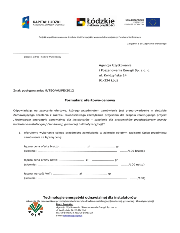 Projekt współfinansowany ze środków Unii Europejskiej w ramach Europejskiego Funduszu Społecznego Załącznik 1 do Zapytania ofertowego ........................................................ pieczęć, adres i nazwa Wykonawcy Agencja Użytkowania i Poszanowania Energii Sp. z o. o. ul. Kwidzyńska 14 91-334 Łódź Znak postępowania: 9/TEO/AUiPE/2012 Formularz ofertowo-cenowy Odpowiadając na zapytanie ofertowe, którego przedmiotem zamówienia jest przeprowadzenie w siedzibie Zamawiającego szkolenia z zakresu równościowego zarządzania projektem dla zespołu realizującego projekt „Technologie energetyki odnawialnej dla instalatorów – szkolenia dla pracowników przedsiębiorstw branży budowlano-instalacyjnej (sanitarnej, grzewczej i klimatyzacyjnej)”. 1. oferujemy wykonanie całego przedmiotu zamówienia w zakresie objętym zapisami Opisu przedmiotu zamówienia za łączną cenę: łączna cena oferty brutto: ......................... zł ...................... gr (słownie: ................................................................................ łączna cena oferty netto: ......................... zł ...................... gr (słownie: ................................................................................. łączna wartość VAT: ......................... zł ......../100 brutto) ......../100 netto) ...................... gr (słownie: .......................................................................................... ......../100) Technologie energetyki odnawialnej dla instalatorów szkolenia dla pracowników przedsiębiorstw branży budowlano-instalacyjnej (sanitarnej, grzewczej i klimatyzacyjnej) Biuro Projektu: Agencja Użytkowania i Poszanowania Energii Sp. z o. o. ul. Kwidzyńska 14, 91-334 Łódź tel. (42) 640 60 14, fax (42) 640 65 38 e-mail: [email protected] Projekt współfinansowany ze środków Unii Europejskiej w ramach Europejskiego Funduszu Społecznego w tym: stawka brutto za 1 godzinę szkoleniową: .......................... zł ...................... gr (słownie: ................................................................................ stawka netto za 1 godzinę szkoleniową: .......................... zł ...................... gr (słownie: ................................................................................ stawka VAT za 1 godzinę szkoleniową: .......................... zł ......../100 brutto) ......../100 netto) ...................... gr (słownie: ................................................................................ ......../100) 2. Oświadczamy, że posiadamy niezbędną wiedzę i doświadczenie oraz potencjał techniczny, a także dysponujemy zasobami zdolnymi do wykonania zamówienia. 3. Oświadczamy, że oferta cenowa zawiera wszystkie koszty wykonania zamówienia, które poniesie Zamawiający i w toku realizacji zamówienia nie ulegnie zmianie. 4. Oświadczamy, że otrzymaliśmy od Zamawiającego wszystkie niezbędne informacje dotyczące niniejszego zamówienia. 5. Oświadczamy, że zapoznaliśmy się z zamówieniem ofertowym i akceptujemy określone w nim warunki i zasady postępowania. 6. Oświadczamy, że w przypadku wyboru naszej oferty wyrażamy zgodę na podpisanie umowy w terminie maksymalnie 5 dni roboczych od momentu powiadomienia przez Zamawiającego o wyborze oferty oraz na realizację złożonego zamówienia w terminie do 14 dni roboczych od dnia przyjęcia zamówienia. 7. Oświadczamy, że wzór umowy stanowiący załącznik 3 do zapytania ofertowego został przez nas zaakceptowany i zobowiązujemy się w przypadku wyboru naszej oferty do zawarcia umowy na wymienionych w nim warunkach, w miejscu i terminie wyznaczonym przez Zamawiającego. 8. Oświadczamy, że nie jesteśmy powiązani z Zamawiającym lub osobami upoważnionymi do zaciągania zobowiązań w imieniu Zamawiającego lub osobami wykonującymi w imieniu Zamawiającego czynności związane z przygotowaniem i przeprowadzeniem procedury wyboru Wykonawcy osobowo lub kapitałowo, w szczególności poprzez: 1. uczestnictwo w spółce jako wspólnik spółki cywilnej lub spółki osobowej; 2. posiadanie udziałów lub co najmniej 10% akcji; 3. pełnienie funkcji członka organu nadzorczego lub zarządzającego, prokurenta, pełnomocnika; 4. pozostawanie w związku małżeńskim, w stosunku pokrewieństwa lub powinowactwa w linii prostej, pokrewieństwa lub powinowactwa w linii bocznej do drugiego stopnia lub w Technologie energetyki odnawialnej dla instalatorów szkolenia dla pracowników przedsiębiorstw branży budowlano-instalacyjnej (sanitarnej, grzewczej i klimatyzacyjnej) Biuro Projektu: Agencja Użytkowania i Poszanowania Energii Sp. z o. o. ul. Kwidzyńska 14, 91-334 Łódź tel. (42) 640 60 14, fax (42) 640 65 38 e-mail: [email protected] stosunku Projekt współfinansowany ze środków Unii Europejskiej w ramach Europejskiego Funduszu Społecznego przysposobienia, opieki lub kurateli. 9. Osoba do kontaktu: ....................................... tel. ...................... e-mail ............... 10. Nasza oferta wraz z załącznikami zawiera .............. kolejno ponumerowanych stron. .................................................... miejscowość, data ........................................................... podpis i pieczęć imienna osoby upoważnionej Technologie energetyki odnawialnej dla instalatorów szkolenia dla pracowników przedsiębiorstw branży budowlano-instalacyjnej (sanitarnej, grzewczej i klimatyzacyjnej) Biuro Projektu: Agencja Użytkowania i Poszanowania Energii Sp. z o. o. ul. Kwidzyńska 14, 91-334 Łódź tel. (42) 640 60 14, fax (42) 640 65 38 e-mail: [email protected]