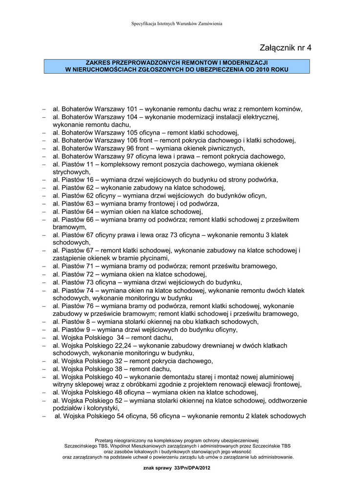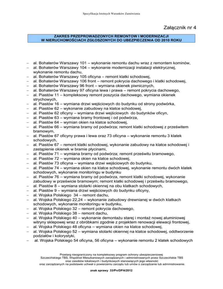Specyfikacja Istotnych Warunków Zamówienia Załącznik nr 4 ZAKRES PRZEPROWADZONYCH REMONTOW I MODERNIZACJI W NIERUCHOMOŚCIACH ZGŁOSZONYCH DO UBEZPIECZENIA OD 2010 ROKU al. Bohaterów Warszawy 101 – wykonanie remontu dachu wraz z remontem kominów, al. Bohaterów Warszawy 104 – wykonanie modernizacji instalacji elektrycznej, wykonanie remontu dachu, al. Bohaterów Warszawy 105 oficyna – remont klatki schodowej, al. Bohaterów Warszawy 106 front – remont pokrycia dachowego i klatki schodowej, al. Bohaterów Warszawy 96 front – wymiana okienek piwnicznych, al. Bohaterów Warszawy 97 oficyna lewa i prawa – remont pokrycia dachowego, al. Piastów 11 – kompleksowy remont poszycia dachowego, wymiana okienek strychowych, al. Piastów 16 – wymiana drzwi wejściowych do budynku od strony podwórka, al. Piastów 62 – wykonanie zabudowy na klatce schodowej, al. Piastów 62 oficyny – wymiana drzwi wejściowych do budynków oficyn, al. Piastów 63 – wymiana bramy frontowej i od podwórza, al. Piastów 64 – wymian okien na klatce schodowej, al. Piastów 66 – wymiana bramy od podwórza; remont klatki schodowej z prześwitem bramowym, al. Piastów 67 oficyny prawa i lewa oraz 73 oficyna – wykonanie remontu 3 klatek schodowych, al. Piastów 67 – remont klatki schodowej, wykonanie zabudowy na klatce schodowej i zastąpienie okienek w bramie płycinami, al. Piastów 71 – wymiana bramy od podwórza; remont prześwitu bramowego, al. Piastów 72 – wymiana okien na klatce schodowej, al. Piastów 73 oficyna – wymiana drzwi wejściowych do budynku, al. Piastów 74 – wymiana okien na klatce schodowej, wykonanie remontu dwóch klatek schodowych, wykonanie monitoringu w budynku al. Piastów 76 – wymiana bramy od podwórza, remont klatki schodowej, wykonanie zabudowy w prześwicie bramowym; remont klatki schodowej i prześwitu bramowego, al. Piastów 8 – wymiana stolarki okiennej na obu klatkach schodowych, al. Piastów 9 – wymiana drzwi wejściowych do budynku oficyny, al. Wojska Polskiego 34 – remont dachu, al. Wojska Polskiego 22,24 – wykonanie zabudowy drewnianej w dwóch klatkach schodowych, wykonanie monitoringu w budynku, al. Wojska Polskiego 32 – remont pokrycia dachowego, al. Wojska Polskiego 38 – remont dachu, al. Wojska Polskiego 40 – wykonanie demontażu starej i montaż nowej aluminiowej witryny sklepowej wraz z obróbkami zgodnie z projektem renowacji elewacji frontowej, al. Wojska Polskiego 48 oficyna – wymiana okien na klatce schodowej, al. Wojska Polskiego 52 – wymiana stolarki okiennej na klatce schodowej, oddtworzenie podziałów i kolorystyki, al. Wojska Polskiego 54 oficyna, 56 oficyna – wykonanie remontu 2 klatek schodowych Przetarg nieograniczony na kompleksowy program ochrony ubezpieczeniowej Szczecińskiego TBS, Wspólnot Mieszkaniowych zarządzanych i administrowanych przez Szczecińskie TBS oraz zasobów lokalowych i budynkowych stanowiących jego własność oraz zarządzanych na podstawie uchwał o powierzeniu zarządu lub umów o zarządzanie lub administrowanie. znak sprawy 33/Pn/DPA/2012 Specyfikacja Istotnych Warunków Zamówienia ul. Bogusława 12 – wykonanie nowej bramy frontowej i przeniesienie istniejącej w miejsce bramy od podwórza, wykonanie remontu prześwitu bramowego, ul. Bohaterów Getta Warszawskiego 9-10 – remont pokrycia dachowego, ul. Bohaterów Getta Warszawskiego 1 oficyna, ul. Żółkiewskiego 2 oficyna, ul. Ściegiennego 61 oficyna – wykonanie remontu 3 klatek schodowych ul. Bohaterów Getta Warszawskiego 11 – prace remontowo-budowlane, polegające na wymianie stolarki okiennej na klatce schodowej, ul. Bohaterów Getta Warszawskiego 12 – wykonanie remontu prześwitu bramowego, ul. Bohaterów Getta Warszawskiego 13 oficyna na wprost i lewa - remont pokrycia dachowego, ul. Bohaterów Getta Warszawskiego 14 – wymian okien na klatce schodowej, ul. Bohaterów Getta Warszawskiego 14 – wymiana bramy wejściowej na podwórze, ul. Bohaterów Getta Warszawskiego 17 front – wykonanie zabudowy w prześwicie bramowym, ul. Bohaterów Getta Warszawskiego 18 – wykonanie monitoringu w budynku, wykonanie bramy frontowej, ul. Bohaterów Getta Warszawskiego 19 – wykonanie remontu prześwitu bramowego w budynku, ul. Bohaterów Getta Warszawskiego 2 oficyna – wykonanie izolacji poziomej, ul. Bohaterów Getta warszawskiego 5 – wykonanie zabudowy na klatce schodowej, ul. Bolesława Krzywoustego 25 – kompleksowy remont poszycia dachowego, ul. Bolesława Krzywoustego 26 – wymiana skorodowanych oraz montaż brakujących okienek piwnicznych, ul. Bolesława Krzywoustego 27 – wykonanie i montaż zabudowy drewnianej na klatce schodowej od prześwitu bramowego do pierwszego piętra budynku, wykonanie remontu balkonów, ul. Bolesława Śmiałego 14 a,b,c,d – wykonanie remontu 4 klatek schodowych, ul. Bolesława Śmiałego 15 – wykonanie remontu klatki schodowej, ul. Bolesława Śmiałego 18 – remont balkonów, izolacja pionowa przeciwwilgociowa, ocieplenie i wzmocnienie stropu poddasza, wymiana skorodowanych i montaż brakujących okienek piwnicznych, ul. Bolesława Śmiałego 19 – wykonanie remontu dachu budynku, wykonania wymianę poziomu kanalizacyjnego w piwnicy oraz pionów wodno-kanalizacyjnych kuchennego i łazienkowych w pionie lokali nr 1,3,5,7, ul. Bolesława Śmiałego 20 – wykonanie remontu dachu, ul. Bolesława Śmiałego 20 oficyna – wymiana bramy wejściowej do budynku, ul. Bolesława Śmiałego 22 – kompleksowy remont poszycia dachowego, wymiana bram wejściowych do budynku, ul. Bolesława Śmiałego 34 front – Wwymiana stolarki okiennej na klatce schodowej budynku frontowego, wykonanie remontu klatki schodowej wraz z prześwitem bramowym, ul. Bolesława Śmiałego 39 - Żółkiewskiego 4 – wykonanie remontu prześwitu bramowego, wykonanie bramy drewnianej prowadzącej z prześwitu na podwórze budynku, wymiana drzwi wejściowych do budynku, prace remontowo-budowlane pol