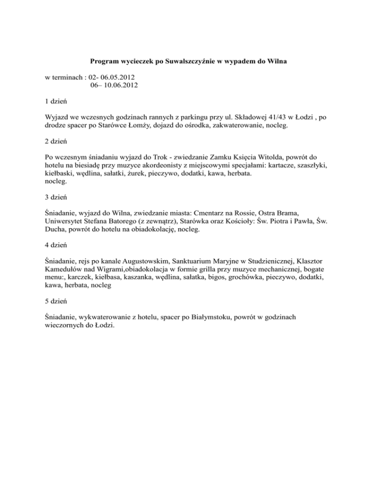 Program wycieczek po Suwalszczyźnie w wypadem do Wilna w terminach : 02- 06.05.2012 06– 10.06.2012 1 dzień Wyjazd we wczesnych godzinach rannych z parkingu przy ul. Składowej 41/43 w Łodzi , po drodze spacer po Starówce Łomży, dojazd do ośrodka, zakwaterowanie, nocleg. 2 dzień Po wczesnym śniadaniu wyjazd do Trok - zwiedzanie Zamku Księcia Witolda, powrót do hotelu na biesiadę przy muzyce akordeonisty z miejscowymi specjałami: kartacze, szaszłyki, kiełbaski, wędlina, sałatki, żurek, pieczywo, dodatki, kawa, herbata. nocleg. 3 dzień Śniadanie, wyjazd do Wilna, zwiedzanie miasta: Cmentarz na Rossie, Ostra Brama, Uniwersytet Stefana Batorego (z zewnątrz), Starówka oraz Kościoły: Św. Piotra i Pawła, Św. Ducha, powrót do hotelu na obiadokolację, nocleg. 4 dzień Śniadanie, rejs po kanale Augustowskim, Sanktuarium Maryjne w Studzienicznej, Klasztor Kamedułów nad Wigrami,obiadokolacja w formie grilla przy muzyce mechanicznej, bogate menu:, karczek, kiełbasa, kaszanka, wędlina, sałatka, bigos, grochówka, pieczywo, dodatki, kawa, herbata, nocleg 5 dzień Śniadanie, wykwaterowanie z hotelu, spacer po Białymstoku, powrót w godzinach wieczornych do Łodzi.
