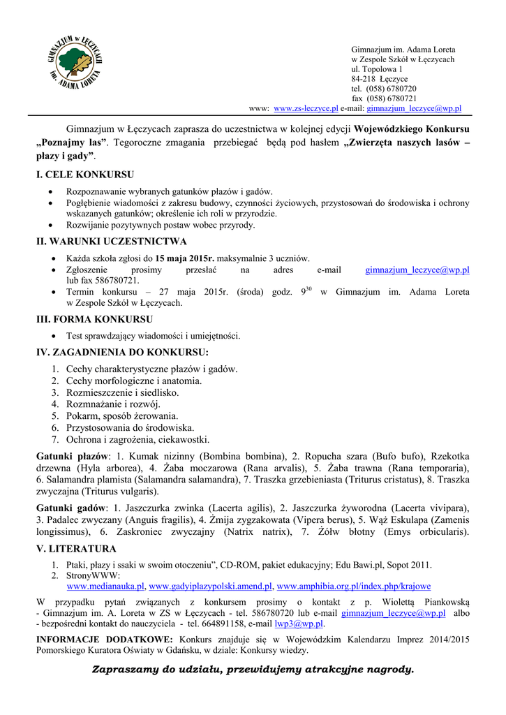 Gimnazjum im. Adama Loreta w Zespole Szkół w Łęczycach ul. Topolowa 1 84-218 Łęczyce tel. (058) 6780720 fax (058) 6780721 www: www.zs-leczyce.pl e-mail: [email protected] Gimnazjum w Łęczycach zaprasza do uczestnictwa w kolejnej edycji Wojewódzkiego Konkursu „Poznajmy las”. Tegoroczne zmagania przebiegać będą pod hasłem „Zwierzęta naszych lasów – płazy i gady”. I. CELE KONKURSU Rozpoznawanie wybranych gatunków płazów i gadów. Pogłębienie wiadomości z zakresu budowy, czynności życiowych, przystosowań do środowiska i ochrony wskazanych gatunków; określenie ich roli w przyrodzie. Rozwijanie pozytywnych postaw wobec przyrody. II. WARUNKI UCZESTNICTWA Każda szkoła zgłosi do 15 maja 2015r. maksymalnie 3 uczniów. Zgłoszenie prosimy przesłać na adres e-mail [email protected] lub fax 586780721. Termin konkursu – 27 maja 2015r. (środa) godz. 930 w Gimnazjum im. Adama Loreta w Zespole Szkół w Łęczycach. III. FORMA KONKURSU Test sprawdzający wiadomości i umiejętności. IV. ZAGADNIENIA DO KONKURSU: 1. 2. 3. 4. 5. 6. 7. Cechy charakterystyczne płazów i gadów. Cechy morfologiczne i anatomia. Rozmieszczenie i siedlisko. Rozmnażanie i rozwój. Pokarm, sposób żerowania. Przystosowania do środowiska. Ochrona i zagrożenia, ciekawostki. Gatunki płazów: 1. Kumak nizinny (Bombina bombina), 2. Ropucha szara (Bufo bufo), Rzekotka drzewna (Hyla arborea), 4. Żaba moczarowa (Rana arvalis), 5. Żaba trawna (Rana temporaria), 6. Salamandra plamista (Salamandra salamandra), 7. Traszka grzebieniasta (Triturus cristatus), 8. Traszka zwyczajna (Triturus vulgaris). Gatunki gadów: 1. Jaszczurka zwinka (Lacerta agilis), 2. Jaszczurka żyworodna (Lacerta vivipara), 3. Padalec zwyczany (Anguis fragilis), 4. Żmija zygzakowata (Vipera berus), 5. Wąż Eskulapa (Zamenis longissimus), 6. Zaskroniec zwyczajny (Natrix natrix), 7. Żółw błotny (Emys orbicularis). V. LITERATURA 1. Ptaki, płazy i ssaki w swoim otoczeniu”, CD-ROM, pakiet edukacyjny; Edu Bawi.pl, Sopot 2011. 2. StronyWWW: www.medianauka.pl, www.gadyiplazypolski.amend.pl, www.amphibia.org.pl/index.php/krajowe W przypadku pytań związanych z konkursem prosimy o kontakt z p. Wiolettą Piankowską - Gimnazjum im. A. Loreta w ZS w Łęczycach - tel. 586780720 lub e-mail [email protected] albo - bezpośredni kontakt do nauczyciela - tel. 664891158, e-mail [email protected]. INFORMACJE DODATKOWE: Konkurs znajduje się w Wojewódzkim Kalendarzu Imprez 2014/2015 Pomorskiego Kuratora Oświaty w Gdańsku, w dziale: Konkursy wiedzy. Zapraszamy do udziału, przewidujemy atrakcyjne nagrody.