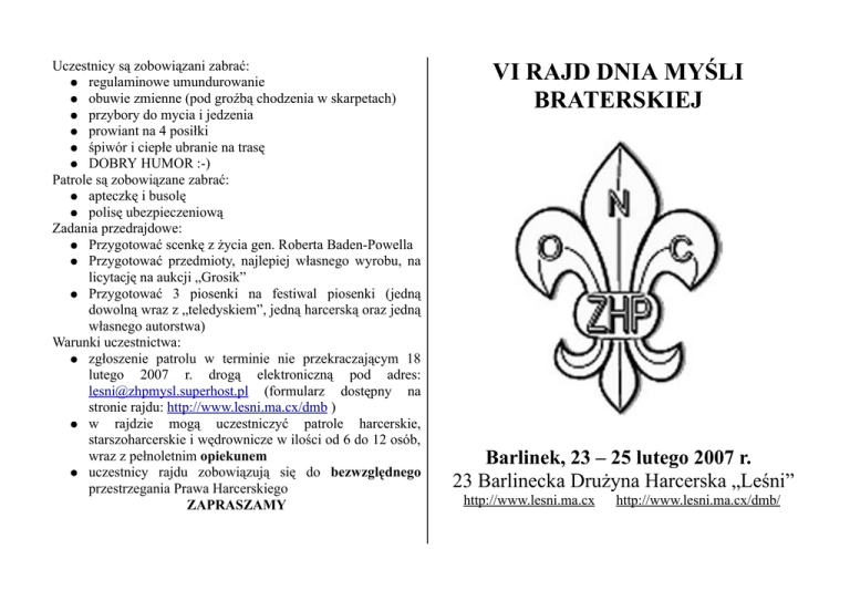 Uczestnicy są zobowiązani zabrać: ● regulaminowe umundurowanie ● obuwie zmienne (pod groźbą chodzenia w skarpetach) ● przybory do mycia i jedzenia ● prowiant na 4 posiłki ● śpiwór i ciepłe ubranie na trasę ● DOBRY HUMOR :-) Patrole są zobowiązane zabrać: ● apteczkę i busolę ● polisę ubezpieczeniową Zadania przedrajdowe: ● Przygotować scenkę z życia gen. Roberta Baden-Powella ● Przygotować przedmioty, najlepiej własnego wyrobu, na licytację na aukcji „Grosik” ● Przygotować 3 piosenki na festiwal piosenki (jedną dowolną wraz z „teledyskiem”, jedną harcerską oraz jedną własnego autorstwa) Warunki uczestnictwa: ● zgłoszenie patrolu w terminie nie przekraczającym 18 lutego 2007 r. drogą elektroniczną pod adres: [email protected] (formularz dostępny na stronie rajdu: http://www.lesni.ma.cx/dmb ) ● w rajdzie mogą uczestniczyć patrole harcerskie, starszoharcerskie i wędrownicze w ilości od 6 do 12 osób, wraz z pełnoletnim opiekunem ● uczestnicy rajdu zobowiązują się do bezwzględnego przestrzegania Prawa Harcerskiego ZAPRASZAMY VI RAJD DNIA MYŚLI BRATERSKIEJ Barlinek, 23 – 25 lutego 2007 r. 23 Barlinecka Drużyna Harcerska „Leśni” http://www.lesni.ma.cx http://www.lesni.ma.cx/dmb/ REGULAMIN V RAJDU DNIA MYŚLI BRATERSKIEJ PROGRAM RAJDU PIĄTEK od 18:00 – zakwaterowanie Termin rajdu: 23 – 25 lutego 2007 r. Organizator: 23 Barlinecka Drużyna Harcerska „Leśni” 19:00 – apel rozpoczynający kolacja Komenda rajdu: 20:00 – świeczkowisko Komendant: Jakub Syroka HO tel.: 509910821 e-mail: [email protected] 21:00 – aukcja „Grosik” CISZA NOCNA Z-ca komendanta: pwd. Anna Stefańska – ds. nie robienia niczego tel.: 605916212 SOBOTA 6:45 – pobudka i zaprawa poranna oraz Żaneta Medyńska i Marta Rogozińska śniadanie Baza rajdu: Zespół Szkół Ponadgimnazjalnych Nr 1 7:45 – odprawa dowódców patroli w Barlinku, ul. Szosowa 2b, Barlinek 8:00 – rozpoczęcie biegu harcerskiego Cele rajdu: BIEG HARCERSKI ● uczczenie Dnia Myśli Braterskiej 14:00-15:00 – powrót z trasy i obiad (orientacyjnie) 16:00 – konkurs scenki o B-P ● współzawodnictwo patroli 17:00 – festiwal piosenki harcerskiej z niespodzianką ● dobra zabawa :-) 19:00 – konkurs kadryla Organizatorzy zapewniają: 19:30 – kolacja ● dwa noclegi 20:00 – świeczkowisko ● obiad w sobotę quiz wiedzy różnej i innej ● herbatę podczas pobytu w bazie 23:00 – idziemy na WInO ??? ● nagrody dla patroli po powrocie CISZA NOCNA NIEDZIELA Wpisowe wynosi: 10 zł (opiekunowie patroli są zwolnieni) 8:00-9:00 – pobudka i śniadanie 9:00 – apel końcowy 9:15-10:00 – sprzątanie i wyjazd