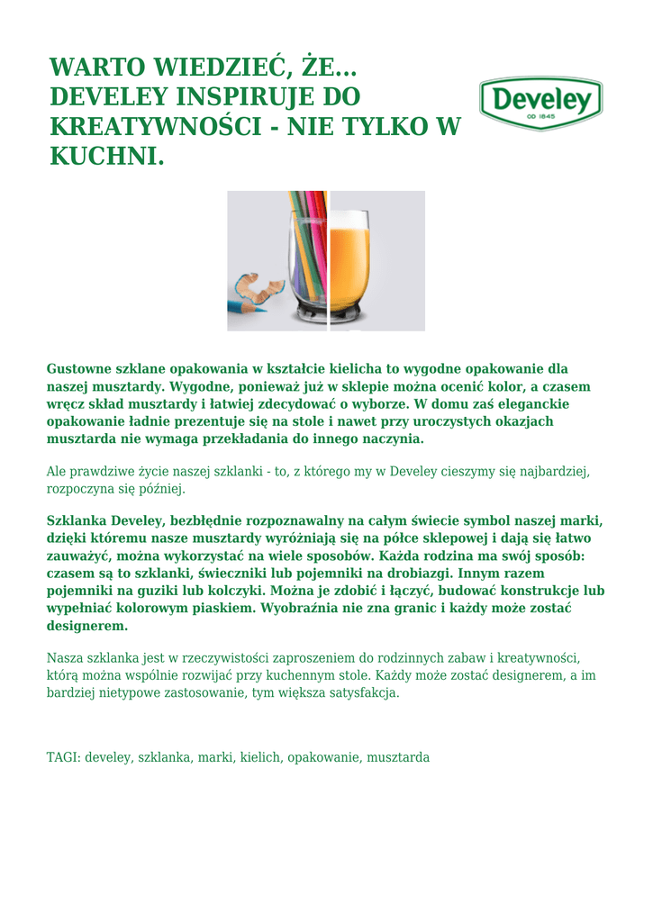 WARTO WIEDZIEĆ, ŻE... DEVELEY INSPIRUJE DO KREATYWNOŚCI - NIE TYLKO W KUCHNI. Gustowne szklane opakowania w kształcie kielicha to wygodne opakowanie dla naszej musztardy. Wygodne, ponieważ już w sklepie można ocenić kolor, a czasem wręcz skład musztardy i łatwiej zdecydować o wyborze. W domu zaś eleganckie opakowanie ładnie prezentuje się na stole i nawet przy uroczystych okazjach musztarda nie wymaga przekładania do innego naczynia. Ale prawdziwe życie naszej szklanki - to, z którego my w Develey cieszymy się najbardziej, rozpoczyna się później. Szklanka Develey, bezbłędnie rozpoznawalny na całym świecie symbol naszej marki, dzięki któremu nasze musztardy wyróżniają się na półce sklepowej i dają się łatwo zauważyć, można wykorzystać na wiele sposobów. Każda rodzina ma swój sposób: czasem są to szklanki, świeczniki lub pojemniki na drobiazgi. Innym razem pojemniki na guziki lub kolczyki. Można je zdobić i łączyć, budować konstrukcje lub wypełniać kolorowym piaskiem. Wyobraźnia nie zna granic i każdy może zostać designerem. Nasza szklanka jest w rzeczywistości zaproszeniem do rodzinnych zabaw i kreatywności, którą można wspólnie rozwijać przy kuchennym stole. Każdy może zostać designerem, a im bardziej nietypowe zastosowanie, tym większa satysfakcja. TAGI: develey, szklanka, marki, kielich, opakowanie, musztarda