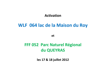Activation WLF 064 lac de la Maison du Roy et FFF 052 Parc Naturel Régional du QUEYRAS les 17 & 18 juillet 2012 Pour y parvenir, passage par le Massif des Ecrins, le lac de Serre-Ponçon, le Fort Mont Dauphin classé au Patrimoine mondial de l’UNESCO, Ville Vieille et son Fort QUEYRAS DFCF 05001 (XIIe) Après GUILLESTRE, nous gravissons une route dite ‘’en contrebas’’ (inaugurée seulement en novembre 1911) si étroite par endroits que deux voitures ne peuvent se croiser, d’autant moins que parfois la paroi rocheuse n’a pas été taillée à la verticale mais en voûte Nous arrivons, enfin ! au hameau dit ‘’La Maison du Roy’’. La photo ci-après nous montre une vue des années 1900. Ce hameau de quelques maisons, au Moyen Âge s’appelait ‘’Maleffosse’’, puis ‘’Ponct de la Pierre’’ avant de devenir ‘’La Maison du Roy’’ en souvenir d’une hypothétique visite du Roi Louis XIII se rendant en Piémont ou plutôt des privilèges accordés à ‘’l’aubergiste’ Gérard, ses enfants et successeurs’’. La Maison du Roy Le GUIL Vers Château QUEYRAS Le même lieu que la diapo d’avant mais en 2012 FFF 52 Parc Naturel QUEYRAS Maison du Roy en 2012 au bord du lac de barrage WLF 064 lac de Maison du Roy