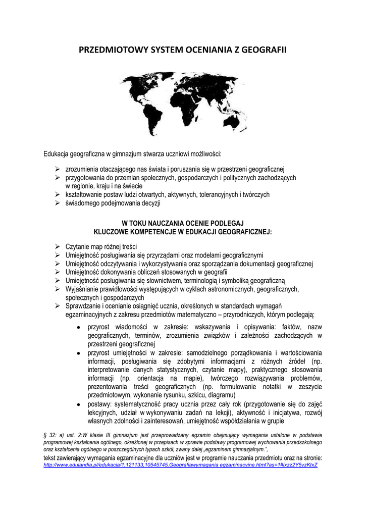 PRZEDMIOTOWY SYSTEM OCENIANIA Z GEOGRAFII Edukacja geograficzna w gimnazjum stwarza uczniowi możliwości: zrozumienia otaczającego nas świata i poruszania się w przestrzeni geograficznej przygotowania do przemian społecznych, gospodarczych i politycznych zachodzących w regionie, kraju i na świecie kształtowanie postaw ludzi otwartych, aktywnych, tolerancyjnych i twórczych świadomego podejmowania decyzji W TOKU NAUCZANIA OCENIE PODLEGAJ KLUCZOWE KOMPETENCJE W EDUKACJI GEOGRAFICZNEJ: Czytanie map różnej treści Umiejętność posługiwania się przyrządami oraz modelami geograficznymi Umiejętność odczytywania i wykorzystywania oraz sporządzania dokumentacji geograficznej Umiejętność dokonywania obliczeń stosowanych w geografii Umiejętność posługiwania się słownictwem, terminologią i symboliką geograficzną Wyjaśnianie prawidłowości występujących w cyklach astronomicznych, geograficznych, społecznych i gospodarczych Sprawdzanie i ocenianie osiągnięć ucznia, określonych w standardach wymagań egzaminacyjnych z zakresu przedmiotów matematyczno – przyrodniczych, którym podlegają: przyrost wiadomości w zakresie: wskazywania i opisywania: faktów, nazw geograficznych, terminów, zrozumienia związków i zależności zachodzących w przestrzeni geograficznej przyrost umiejętności w zakresie: samodzielnego porządkowania i wartościowania informacji, posługiwania się zdobytymi informacjami z różnych źródeł (np. interpretowanie danych statystycznych, czytanie mapy), praktycznego stosowania informacji (np. orientacja na mapie), twórczego rozwiązywania problemów, prezentowania treści geograficznych (np. formułowanie notatki w zeszycie przedmiotowym, wykonanie rysunku, szkicu, diagramu) postawy: systematyczność pracy ucznia przez cały rok (przygotowanie się do zajęć lekcyjnych, udział w wykonywaniu zadań na lekcji), aktywność i inicjatywa, rozwój własnych zdolności i zainteresowań, umiejętność współdziałania w grupie § 32: a) ust. 2:W klasie III gimnazjum jest przeprowadzany egzamin obejmujący wymagania ustalone w podstawie programowej kształcenia ogólnego, określonej w przepisach w sprawie podstawy programowej wychowania przedszkolnego oraz kształcenia ogólnego w poszczególnych typach szkół, zwany dalej „egzaminem gimnazjalnym.”, tekst zawierający wymagania egzaminacyjne dla uczniów jest w programie nauczania przedmiotu oraz na stronie: http://www.edulandia.pl/edukacja/1,121133,10545745,Geografiawymagania egzaminacyjne.html?as=1#ixzz2Y5vzKtxZ 1. Na lekcjach geografii obowiązują następujące formy sprawdzania wiedzy i umiejętności: a) formy ustne: odpowiedzi i wypowiedzi b) formy pisemne: prace klasowe, sprawdziany, zadania i ćwiczenia wykonane w klasie, domu, inne c) czytanie mapy – w różnych formach: pisemnej lub ustnej Wiedzę i umiejętności ucznia ocenia się na poziomach: podstawowym – obejmuje on poziom konieczny i podstawowy, pozwalający wystawić ocenę 2 lub 3 (treści i umiejętności najbardziej przystępne, najprostsze i najbardziej uniwersalne, niezbędne na danym i wyższych etapach kształcenia, bezpośrednio użyteczne w pozaszkolnej działalności, obejmują te elementy treści, które mogą świadczyć o możliwości opanowania, przy odpowiednim nakładzie pracy, pozostałych elementów tej treści. Elementy są najłatwiejsze, najczęściej stosowane, praktyczne, niewymagające większych modyfikacji, niezbędne do uczenia się ogółu podstawowych wiadomości i umiejętności) ponadpodstawowym – obejmującym poziom rozszerzający, dopełniający i wykraczający, odpowiadający ocenom 4, 5 i 6 (umiarkowanie przystępne, bardziej złożone i mniej typowe, przydatne ale nie niezbędne na danym i wyższych etapach kształcenia, trudne do opanowania, pośrednio użyteczne w pozaszkolnej działalności ucznia, obejmują wiadomości i umiejętności z wybranej dziedziny geografii, wykraczające trudnością poza poziom rozszerzony, złożone i oryginalne, twórcze naukowo, wąsko specjalistyczne) szczegółowe wymagania na poszczególne stopnie zawiera plan dydaktyczny dla określonych klas - dostępny w pracowni geograficznej u nauczyciela przedmiotu 2. Kryteria oceniania. Ocenianie bieżące wiedzy i umiejętności dokonywane jest systematycznie w różnych formach w warunkach zapewniających obiektywność oceny. a) w ocenianiu stosuje się ocenę „wagową” Waga 1 – indywidualna i grupowa praca na lekcji, ćwiczenia, zadania, aktywność, wypowiedzi Waga 2 – sprawdziany, projekt edukacyjny, diagnozy wewnątrzszkolne, diagnozy zewnętrzne, stosowanie umiejętności w praktyce, zadania egzaminacyjne Waga 3 – praca klasowa, konkurs b) przy odpowiedzi ustnej i pisemnej ocenie podlegają: poziom merytoryczny (umiejętność doboru i zakres treści, wyjaśnianie zjawisk i procesów, poprawne stosowanie terminów i nazw geograficznych) poprawność stylistyczna, kultura wypowiedzi przy pracach pisemnych bierze się pod uwagę: dobór i zakres treści, samodzielność wykonanej pracy, dokładność rysunków, wykresów, map i konstrukcję pracy c) przy ocenie prac wykonanych w domu (prezentacja, referat, zadanie domowe) bierze się pod uwagę: zrozumienie tematu, stopień zaangażowania i możliwości ucznia wartość merytoryczną treści, poprawność językową, - ortografia, styl konstrukcję pracy i jej szatę graficzną dokładność i estetykę wykonania oryginalność i pomysłowość, samodzielność i wykorzystanie różnych źródeł informacji, sposób prezentacji (selekcję materiału rzeczowego, logiczne wiązanie faktów, dostrzeganie związków przyczynowo skutkowych, własne refleksje) c) sprawdzian trwa od 10 do 30 min. i jest pisemną formą ocenienia podstawowych umiejętności geograficznych określonych wymaganiami podstawy programowej dla gimnazjum (krótkie formy, tzw. kartkówki z trzech ostatnich tematów nie wymagają zapowiadania) d) praca klasow