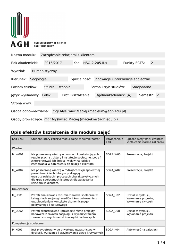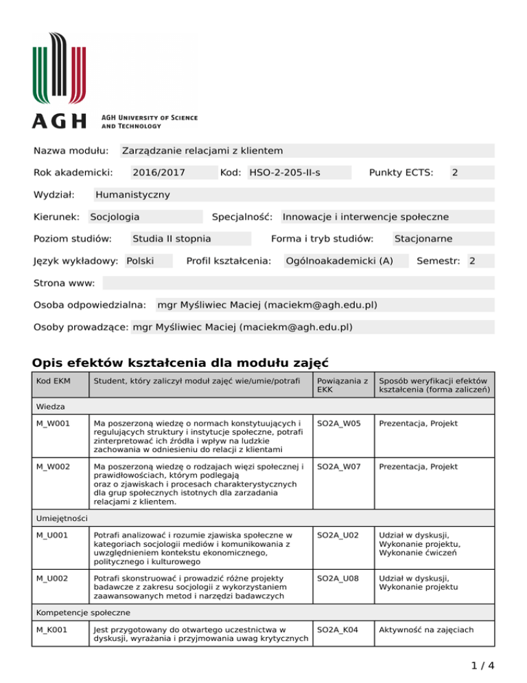 Nazwa modułu: Zarządzanie relacjami z klientem Rok akademicki: Wydział: Kierunek: 2016/2017 Kod: HSO-2-205-II-s Punkty ECTS: 2 Humanistyczny Socjologia Poziom studiów: Specjalność: Studia II stopnia Język wykładowy: Polski Innowacje i interwencje społeczne Forma i tryb studiów: Profil kształcenia: Stacjonarne Ogólnoakademicki (A) Semestr: 2 Strona www: Osoba odpowiedzialna: mgr Myśliwiec Maciej ([email protected]) Osoby prowadzące: mgr Myśliwiec Maciej ([email protected]) Opis efektów kształcenia dla modułu zajęć Kod EKM Student, który zaliczył moduł zajęć wie/umie/potrafi Powiązania z EKK Sposób weryfikacji efektów kształcenia (forma zaliczeń) M_W001 Ma poszerzoną wiedzę o normach konstytuujących i regulujących struktury i instytucje społeczne, potrafi zinterpretować ich źródła i wpływ na ludzkie zachowania w odniesieniu do relacji z klientami SO2A_W05 Prezentacja, Projekt M_W002 Ma poszerzoną wiedzę o rodzajach więzi społecznej i prawidłowościach, którym podlegają oraz o zjawiskach i procesach charakterystycznych dla grup społecznych istotnych dla zarzadania relacjami z klientem. SO2A_W07 Prezentacja, Projekt M_U001 Potrafi analizować i rozumie zjawiska społeczne w kategoriach socjologii mediów i komunikowania z uwzględnieniem kontekstu ekonomicznego, politycznego i kulturowego SO2A_U02 Udział w dyskusji, Wykonanie projektu, Wykonanie ćwiczeń M_U002 Potrafi skonstruować i prowadzić różne projekty badawcze z zakresu socjologii z wykorzystaniem zaawansowanych metod i narzędzi badawczych SO2A_U08 Udział w dyskusji, Wykonanie projektu SO2A_K04 Aktywność na zajęciach Wiedza Umiejętności Kompetencje społeczne M_K001 Jest przygotowany do otwartego uczestnictwa w dyskusji, wyrażania i przyjmowania uwag krytycznych 1/4 Karta modułu - Zarządzanie relacjami z klientem M_K002 Jest przygotowany do uczestnictwa w zespołach badawczych, oraz współdziałania w grupie i pełnienia różnych ról w tychże SO2A_K05 Aktywność na zajęciach Matryca efektów kształcenia w odniesieniu do form zajęć Konwersatori um Zajęcia seminaryjne Zajęcia praktyczne Zajęcia terenowe Zajęcia warsztatowe Ma poszerzoną wiedzę o normach konstytuujących i regulujących struktury i instytucje społeczne, potrafi zinterpretować ich źródła i wpływ na ludzkie zachowania w odniesieniu do relacji z klientami - - - + - - - - - - - M_W002 Ma poszerzoną wiedzę o rodzajach więzi społecznej i prawidłowościach, którym podlegają oraz o zjawiskach i procesach charakterystycznych dla grup społecznych istotnych dla zarzadania relacjami z klientem. - - - + - - - - - - - M_U001 Potrafi analizować i rozumie zjawiska społeczne w kategoriach socjologii mediów i komunikowania z uwzględnieniem kontekstu ekonomicznego, politycznego i kulturowego - - - + - - - - - - - M_U002 Potrafi skonstruować i prowadzić różne projekty badawcze z zakresu socjologii z wykorzystaniem zaawansowanych metod i narzędzi badawczych - - - + - - - - - - - - - - + - - - - - - - E-learning Ćwiczenia projektowe M_W001 Inne Ćwiczenia laboratoryjne Forma zajęć Ćwiczenia audytoryjne Student, który zaliczył moduł zajęć wie/umie/potrafi Wykład Kod EKM Wiedza Umiejętności Kompetencje społeczne M_K001 Jest przygotowany do otwartego uczestnictwa w dyskusji, wyrażania i przyjmowania uwag krytycznych 2/4 Karta modułu - Zarządzanie relacjami z klientem M_K002 Jest przygotowany do uczestnictwa w zespołach badawczych, oraz współdziałania w grupie i pełnienia różnych ról w tychże - - - + - - - - - - - Treść modułu zajęć (program wykładów i pozostałych zajęć) Ćwiczenia projektowe MODUŁ KOMUNIKACYJNY. ZARZĄDZANIE RELACJAMI Z KLIENTEM Przedmiot Zarządzanie relacjami z klientem ma dostarczyć Studentom wiedzy z zakresu kreowania i zarządzania procesem budowy relacji pomiędzy zespołem obsługującym klienta a klientem. Jego celem jest zapoznanie Studentów z technikami i metodami skutecznego i efektywnego komunikowania, nawiązywania relacji, prezentacji, zarządzania projektami, negocjacji i rozwiązywania konfliktów. Sposób obliczania oceny końcowej Ocena końcowa obejmuje: aktywny udział w zajęciach 20% wykonanie projektu 80% Wymagania wstępne i dodatkowe brak Zalecana literatura i pomoce naukowe Zalecana literatura: Adler R., Rosenfeld L.B., Proctor II R.F. (2011), Relacje interpersonalne. Proces porozumiewania się, Dom Wydawniczy Rebis, Poznań Gorman T., 2009, Perswazja. Droga do osiągnięcia celów, One Press, Warszawa 2009. Lewicki R., Saunders D., Barry B., Minton J., 2005, Zasady negocjacji. Kompendium wiedzy dla trenerów i menedżerów, Rebis, Poznań Publikacje naukowe osób prowadzących zajęcia związane z tematyką modułu Nie podano dodatkowych publikacji Informacje dodatkowe MODUŁ KOMUNIKACYJNY Zasadniczym celem modułu jest rozwinięcie kompetencji komunikacyjnych Studentów i Studentek niezbędnych do realizacji zadań związanych z projektowaniem i wdrażaniem innowacji (informowaniem, budową wizerunku, negocjacjom, zarządzaniem relacjami z klientem, a także budowaniem relacji w zespole). Program modułu komunikacyjnego konstytuują zatem zajęcia praktyczne, osadzone w adekwatnym kontekście teoretycznym związanym z kluczowymi procesami charakterystycznymi dla współczesnego zmediatyzowanego społeczeństwa, w którym kompetencje komunikacyjne stanowią podstawę skutecznych innowacji we wszystkich sferach życia społecznego i gospodarczego. 3/4 Karta modułu - Zarządzanie relacjami z klientem Nakład pracy studenta (bilans punktów ECTS) Forma aktywności studenta Obciążenie studenta Wykonanie projektu 20 godz Udział w ćwiczeniach projektowych 28 godz Dodatkowe godziny kontaktowe z nauczycielem 2 godz Sumaryczne obciążenie pracą studenta 50 godz Punkty ECTS za moduł 2 ECTS 4/4