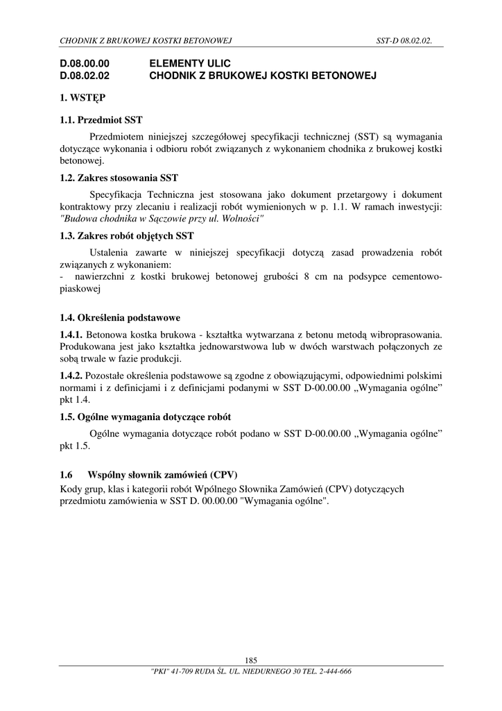 CHODNIK Z BRUKOWEJ KOSTKI BETONOWEJ D.08.00.00 D.08.02.02 SST-D 08.02.02. ELEMENTY ULIC CHODNIK Z BRUKOWEJ KOSTKI BETONOWEJ 1. WSTĘP 1.1. Przedmiot SST Przedmiotem niniejszej szczegółowej specyfikacji technicznej (SST) są wymagania dotyczące wykonania i odbioru robót związanych z wykonaniem chodnika z brukowej kostki betonowej. 1.2. Zakres stosowania SST Specyfikacja Techniczna jest stosowana jako dokument przetargowy i dokument kontraktowy przy zlecaniu i realizacji robót wymienionych w p. 1.1. W ramach inwestycji: "Budowa chodnika w Sączowie przy ul. Wolności" 1.3. Zakres robót objętych SST Ustalenia zawarte w niniejszej specyfikacji dotyczą zasad prowadzenia robót związanych z wykonaniem: - nawierzchni z kostki brukowej betonowej grubości 8 cm na podsypce cementowopiaskowej 1.4. Określenia podstawowe 1.4.1. Betonowa kostka brukowa - kształtka wytwarzana z betonu metodą wibroprasowania. Produkowana jest jako kształtka jednowarstwowa lub w dwóch warstwach połączonych ze sobą trwale w fazie produkcji. 1.4.2. Pozostałe określenia podstawowe są zgodne z obowiązującymi, odpowiednimi polskimi normami i z definicjami i z definicjami podanymi w SST D-00.00.00 „Wymagania ogólne” pkt 1.4. 1.5. Ogólne wymagania dotyczące robót Ogólne wymagania dotyczące robót podano w SST D-00.00.00 „Wymagania ogólne” pkt 1.5. 1.6 Wspólny słownik zamówień (CPV) Kody grup, klas i kategorii robót Wpólnego Słownika Zamówień (CPV) dotyczących przedmiotu zamówienia w SST D. 00.00.00 "Wymagania ogólne". 185 "PKI" 41-709 RUDA ŚL. UL. NIEDURNEGO 30 TEL. 2-444-666 SPECYFIKACJE TECHNICZNE SST- D 08.00.00 2. MATERIAŁY 2.1. Ogólne wymagania dotyczące materiałów Ogólne wymagania dotyczące materiałów, ich pozyskiwania i składowania, podano w SST D-00.00.00 „Wymagania ogólne” pkt 2. 2.2. Betonowa kostka brukowa - wymagania 2.2.1. Aprobata techniczna Warunkiem dopuszczenia do stosowania betonowej kostki brukowej w budownictwie drogowym jest posiadanie aprobaty technicznej, wydanej przez uprawnioną jednostkę. 2.2.2. Wygląd zewnętrzny Struktura wyrobu powinna być zwarta, bez rys, pęknięć, plam i ubytków. Powierzchnia górna kostek powinna być równa i szorstka, a krawędzie kostek równe i proste, wklęśnięcia nie powinny przekraczać 2 mm dla kostek o grubości 80 mm. 2.2.3. Kształt, wymiary i kolor kostki brukowej Do wykonania nawierzchni chodnika stosuje się betonową kostkę brukową o grubości 80 mm. Kostki o takiej grubości są produkowane w kraju. Tolerancje wymiarowe wynoszą: − na długości ± 3 mm, − na szerokości ± 3 mm, − na grubości ± 5 mm. Kolory kostek produkowanych aktualnie w kraju to: szary, ceglany, klinkierowy, grafitowy i brązowy. 2.2.4. Cechy fizykomechaniczne betonowych kostek brukowych Betonowe kostki brukowe powinny mieć cechy fizykomechaniczne określone w tablicy 1. Tablica 1. Cechy fizykomechaniczne betonowych kostek brukowych Lp. 1 Cechy Wartość Wytrzymałość na ściskanie po 28 dniach, MPa, co najmniej a) średnia z sześciu kostek b) najmniejsza pojedynczej kostki 80 70 2 Nasiąkliwość wodą wg PN-B-06250 [2], %, nie więcej niż 5 3 Odporność na zamrażanie, po 50 cyklach zamrażania, wg PN-B-06250 [2]: a) pęknięcia próbki b) strata masy, %, nie więcej niż c) obniżenie wytrzymałości na ściskanie w stosunku do wytrzymałości próbek nie zamrażanych, %, nie więcej niż brak 5 20 4 Ścieralność na tarczy Boehmego wg PN-B-04111 [1], mm, nie więcej niż 186 "PKI" 41-709 RUDA ŚL. UL. NIEDURNEGO 30 TEL. 2-444-666 4 CHODNIK Z BRUKOWEJ KOSTKI BETONOWEJ SST-D 08.02.02. 2.3. Materiały do produkcji betonowych kostek brukowych 2.3.1. Cement Do produkcji kostki brukowej należy stosować cement portlandzki, bez dodatków, klasy nie niższej niż „32,5”. Zaleca się stosowanie cementu o jasnym kolorze. Cement powinien odpowiadać wymaganiom PN-B-19701 [4]. 2.3.2. Kruszywo do betonu Należy stosować kruszywa mineralne odpowiadające wymaganiom PN-B-06712 [3]. Uziarnienie kruszywa powinno być ustalone w recepcie laboratoryjnej mieszanki betonowej, przy założonych parametrach wymaganych dla produkowanego wyrobu. 2.3.3. Woda Woda powinna być odmiany „1” i odpowiadać wymaganiom PN-B-32250 [5]. 2.3.4. Dodatki Do produkcji kostek brukowych stosuje się dodatki w postaci plastyfikatorów i barwników, zgodnie z receptą laboratoryjną. Plastyfikatory zapewniają gotowym wyrobom większą wytrzymałość, mniejszą nasiąkliwość i większą odporność na niskie temperatury i działanie soli. Stosowane barwniki powinny zapewnić kostce trwałe wybarwienie. Powinny to być barwniki nieorganiczne. 3. SPRZĘT 3.1. Ogólne wymagania dotyczące sprzętu Ogólne wymagania dotyczące sprzętu podano w SST D-00.00.00 „Wymagania ogólne” pkt 3. 3.2. Sprzęt do wykonania chodnika z kostki brukowej Małe powierzchnie chodnika z kostki brukowej wykonuje się ręcznie. Jeśli powierzchnie są duże, a kostki brukowe mają jednolity kształt i kolor, można stosować mechaniczne urządzenia układające. Urządzenie składa się z wózka i chwytaka sterowanego hydraulicznie, służącego do przenoszenia z palety warstwy kostek na miejsce ich ułożenia. Do zagęszczenia nawierzchni stosuje się wibratory płytowe z osłoną z tworzywa sztucznego. 4. TRANSPORT 4.1. Ogólne wymagania dotyczące transportu Ogólne wymagania dotyczące transportu podano w SST D-00.00.00 „Wymagania ogólne” pkt 4. 4.2. Transport betonowych kostek brukowych Uformowane w czasie produkcji kostki betonowe układane są warstwowo na palecie. Po uzyskaniu wytrzymałości betonu min. 0,7 wytrzymałości projektowanej, kostki przewożone są na stanowisko, gdzie specjalne urządzenie pakuje je w folię i spina taśmą stalową, co gwarantuje transport samochodami w nienaruszonym stanie. 187 "PKI" 41-709 RUDA ŚL. UL. NIEDURNEGO 30 TEL. 2-444-666 SPECYFIKACJE TECHNICZNE SST- D 08.00.00 Kostki betonowe można również 