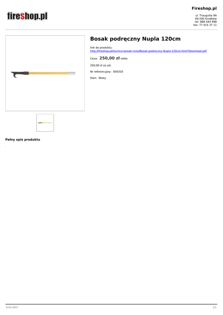 Fireshop.pl ul. Traugutta 9A 49-200 Grodków tel: 888 444 998 fax: 77 415 37 11 Bosak podręczny Nupla 120cm link do produktu: http://fireshop.pl/tlumice-bosaki-inne/Bosak-podreczny-Nupla-120cm.html?download.pdf Cena: 250,00 zł netto 250,00 zł za szt. Nr referencyjny: 050310 Stan: Nowy Pełny opis produktu . 8-03-2017 1/1