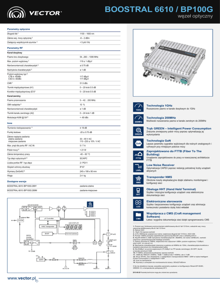 BOOSTRAL 6610 / BP100G węzeł optyczny Parametry optyczne Długość fali 1 1100 – 1600 nm Zakres wej. mocy optycznej 2 -8 – 2 dBm Zastępczy współczynnik szumów 3 < 5 pA/√Hz Parametry RF Kanał dosyłowy 54...260 – 1006 МHz Pasmo toru dosyłowego Max. poziom wyjściowy 4 Nierównomierność charakterystyki 119 ± 1 dBµV 5 ± 0.75 dB Nachylenie charakterystyki 5 ± 1 dB Poziom wyjściowy typ.6: CTB ≤ -60dBc CSO ≤ -60dBc 117 dBµV 117 dBµV CNR 7 51.5 dBc Tłumiki międzystopniowe (A1) 0 – 20 krok 0.5 dB Korektor międzystopniowy (E1)8 0 – 20 krok 0.5 dB Kanał zwrotny Pasmo przenoszenia 5 – 42... 200 МHz OMI nadajnika 9 10 % Nierównomierność charakterystyki ± 1 dB Tłumiki kanału zwrotnego (A2) 0 – 24 krok 1 dB Modulacja HUM @ 5A10 < -60 dBc Technologia 1GHz Rozszerzone pasmo w kanale dosyłowym do 1GHz Technologia 200MHz MoŜliwość rozszerzenia pasma w kanale zwrotnym do 200MHz Inne Tłumienie niedopasowania 11 ≥ 18 dB Tryb GREEN – Intelligent Power Consumption Punkty testowe -20 ± 0.75 dB Zakres napięcia zasilania: zdalne zasilanie miejscowe zasilanie Znacznie zmniejszony pobór mocy poprzez optymalizację jej wykorzystania 30 – 65 V AC 110 –230 ± 10% V AC Technologia GaN Max. prąd dla portu RF / AC IN 5/7A Pobór mocy12 < 21 W Zakres temperatury pracy -40 – 60 °C Typ złącz optycznych13 SC/APC Liczba portów RF / typ złącz 2 / PG11 Stopień ochrony obudowy IP 67 Wymiary (SxGxW)14 245 x 199 x 90 mm Waga 2.4 kg Lepsze parametry sygnałów wyjściowych dla nośnych analogowych i cyfrowych przy mniejszym poborze mocy Zaprojektowano do FTTB (Fiber To The Building) Urządzenie zaprojektowane do pracy w nowoczesnej architekturze FTTB Low Noise Receiver Optymalizacja CAPEX poprzez redukcję potrzebnej liczby urządzeń aktywnych Transponder NMS ObniŜone koszty eksploatacyjne dzięki zdalnemu monitoringowi i konfiguracji sieci Dostępne wersje BOOSTRAL 6610 /BP100G 289Y zasilanie zdalne BOOSTRAL 6610 /BP100G 289M zasilanie miejscowe Obsługa HHT (Hand Held Terminal) Szybka i intuicyjna konfiguracja urządzeń oraz elektroniczna dokumentacja sieci Elektroniczne sterowanie Szybka i bezprzerwowa konfiguracja urządzeń oraz eliminacja konieczności posiadania duŜej ilości wkładek Współpraca z CMS (Craft management Software) Łatwa i wygodna dokumentacja sieci dzięki oprogramowaniu CMS 1. Poziom wyj. limitowany wzmocnieniem zdefiniowany dla dł. fali 1310nm, wskaźnik wej. mocy optycznej skalibrowany dla dł. fali 1310nm 2. Zakres AGC 3. <5pA/√Hz typowa wartość 4. 4.0% OMI/kanał, pojedyncza nośna; wejściowa długość fali 1310nm, AGC=ON 5. Pomiar 10MHz powyŜej częstotliwości granicznej filtra DF oraz z wkładką ATG 0 6. Wg EN 50083-3, 9dB nachylenie charakterystyki 85 –862MHz ,42 nośne CENELEC, wartość mierzona i gwarantowana dla kaŜdego produktu 7. Pasmo szumów=4.75MHz, wejściowa moc optyczna=-3dBm, poziom wyjściowy 112dBµV, AGC=OFF, A1=A2=E1=0 8. Nachylenie charakterystyki mierzone w paśmie od 40MHz do 1GHz, charakterystyka korektora o kształcie odwrotnym do charakterystyki kabla 9. Dla 65dBµV na porcie wejściowym (75.5dBµV na TP kanału zwrotnego), IS=OFF, tłumik w kanale zwrotnym=0dB 10. f>15MHz, temperatura pokojowa, typowa wartość 11. 18dB dla 7MHz≤f ≤ 40MHz, 18dB -1.5dB/oct dla f >40MHz, ale ≤ 11dB 12. Sinus 30VAC, bez obsadzenia; z nadajnikiem i transponderem NMS < 26W w trybie Intelligent Power Consumption z nadajnikiem <16W 13. Inne na zamówienie 14. Wymiary z uchwytami do montowania do ściany: 263x227x90mm O ile nie określono inaczej, wszystkie parametry uzyskano w konfiguracji z filtrami DF 65/85 ; GREEN =0; w temperaturze pokojowej 25°C 2013-08-26 Parametry techniczne mogą ulec zmianie bez uprzedzenia. www.vector.pl