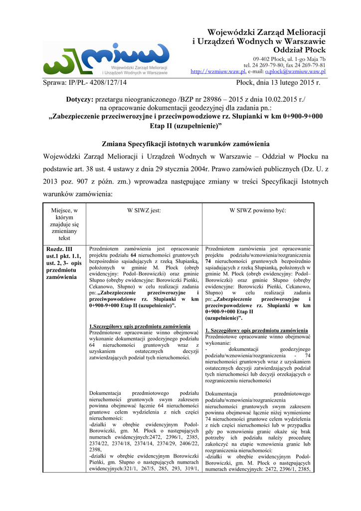 Wojewódzki Zarząd Melioracji i Urządzeń Wodnych w Warszawie Oddział Płock 09-402 Płock, ul. 1-go Maja 7b tel. 24 269-79-80, fax 24 269-79-81 http://wzmiuw.waw.pl, e-mail: [email protected] Sprawa: IP/PŁ- 4208/127/14 Płock, dnia 13 lutego 2015 r. Dotyczy: przetargu nieograniczonego /BZP nr 28986 – 2015 z dnia 10.02.2015 r./ na opracowanie dokumentacji geodezyjnej dla zadania pn.: „Zabezpieczenie przeciwerozyjne i przeciwpowodziowe rz. Słupianki w km 0+900-9+000 Etap II (uzupełnienie)” Zmiana Specyfikacji istotnych warunków zamówienia Wojewódzki Zarząd Melioracji i Urządzeń Wodnych w Warszawie – Oddział w Płocku na podstawie art. 38 ust. 4 ustawy z dnia 29 stycznia 2004r. Prawo zamówień publicznych (Dz. U. z 2013 poz. 907 z późn. zm.) wprowadza następujące zmiany w treści Specyfikacji Istotnych warunków zamówienia: Miejsce, w którym znajduje się zmieniany tekst W SIWZ jest: W SIWZ powinno być: Rozdz. III ust.1 pkt. 1.1, ust. 2, 3- opis przedmiotu zamówienia Przedmiotem zamówienia jest opracowanie projektu podziału 64 nieruchomości gruntowych bezpośrednio sąsiadujących z rzeką Słupianką, położonych w gminie M. Płock (obręb ewidencyjny: Podol–Borowiczki) oraz gminie Słupno (obręby ewidencyjne: Borowiczki Pieńki, Cekanowo, Słupno) w celu realizacji zadania pn:.„Zabezpieczenie przeciwerozyjne i przeciwpowodziowe rz. Słupianki w km 0+900-9+000 Etap II (uzupełnienie)”. Przedmiotem zamówienia jest opracowanie projektu podziału/wznowienia/rozgraniczenia 74 nieruchomości gruntowych bezpośrednio sąsiadujących z rzeką Słupianką, położonych w gminie M. Płock (obręb ewidencyjny: Podol– Borowiczki) oraz gminie Słupno (obręby ewidencyjne: Borowiczki Pieńki, Cekanowo, Słupno) w celu realizacji zadania pn:.„Zabezpieczenie przeciwerozyjne i przeciwpowodziowe rz. Słupianki w km 0+900-9+000 Etap II (uzupełnienie)”. 1.Szczegółowy opis przedmiotu zamówienia Przedmiotowe opracowanie winno obejmować wykonanie dokumentacji geodezyjnego podziału 64 nieruchomości gruntowych wraz z uzyskaniem ostatecznych decyzji zatwierdzających podział tych nieruchomości. Dokumentacja przedmiotowego podziału nieruchomości gruntowych swym zakresem powinna obejmować łącznie 64 nieruchomości gruntowe celem wydzielenia z nich części nieruchomości: -działki w obrębie ewidencyjnym PodolBorowiczki, gm. M. Płock o następujących numerach ewidencyjnych:2472, 2396/1, 2385, 2374/22, 2374/18, 2374/14, 2374/29, 2406/22, 2398, -działki w obrębie ewidencyjnym Borowiczki Pieńki, gm. Słupno o następujących numerach ewidencyjnych:321/1, 267/5, 285, 293, 319/1, 1. Szczegółowy opis przedmiotu zamówienia Przedmiotowe opracowanie winno obejmować wykonanie: dokumentacji geodezyjnego podziału/wznowienia/rozgraniczenia 74 nieruchomości gruntowych wraz z uzyskaniem ostatecznych decyzji zatwierdzających podział tych nieruchomości lub decyzji orzekających o rozgraniczeniu nieruchomości Dokumentacja przedmiotowego podziału/wznowienia/rozgraniczenia nieruchomości gruntowych swym zakresem powinna obejmować łącznie niżej wymienione 74 nieruchomości gruntowe celem wydzielenia z nich części nieruchomości lub w przypadku gdy po wznowieniu granic okaże się brak potrzeby ich podziału należy procedurę zakończyć na etapie wznowienia granic lub rozgraniczenia nieruchomości: -działki w obrębie ewidencyjnym PodolBorowiczki, gm. M. Płock o następujących numerach ewidencyjnych: 2472, 2396/1, 2385, 324/1, 330/1, 128, 129, 130, 131, 135/1, 135/2, 135/3, 135/4, 138, 150, 154, 157,178, 184, 187/1, 187/2, 193/8, 196/1, 196/2, 202, 205/2, 205/1, 208, 211, 214, 217, 219, 221, 223/2, 225, 227,18/8, 19, 20/1, 20/2, 21, 102/3, 103/1, 107/6, 109, 111, 113, 199/1, 11/1, 12/1, 17/4, -działkę w obrębie ewidencyjnym Cekanowo, gm. Słupno o numerze ewidencyjnym: 18, -działkę w obrębie ewidencyjnym Słupno, gm. Słupno o numerze ewidencyjnym: 192/1. 1.1 W ramach zamówienia należy: -opracować dokumentację geodezyjnego podziału w/w nieruchomości gruntowych zgodnie z uszczegółowieniem zawartym w załączniku nr 1 do umowy, - uzyskać ostateczne decyzje (dla każdej z działek) zatwierdzające projekt podziału, - uzyskać inne konieczne do realizacji inwestycji uzgodnienia, warunki, opinie oraz decyzje wynikające z zakresu opracowania. 2.Wykonawca zamówienia zobowiązany jest do: 1). sporządzenia wstępnej koncepcji projektu podziału nieruchomości gruntowych bezpośrednio sąsiadujących z rzeką Słupianką, którą obowiązkowo powinien przedstawić Zamawiającemu do uzgodnienia (akceptacji), 3.Wymagania odnośnie dokumentacji: 3). Dokumentację należy opracować na mapach spełniających wymagania rozporządzenia Rady Ministrów z dnia 7 grudnia 2004r w sprawie sposobu i trybu dokonywania podziałów nieruchomości (Dz. U. z 2004, Nr 268,poz. 2663 z późn. zm.). Rozdz. III opis przedmiotu zamówienia Do pkt. 1.2 dodaje się: Rozdz. XV ust. 1, 2, 11 – miejsce oraz termin składania i otwarcia ofert „Nie otwierać przed komisyjnym otwarciem ofert 18.02.2015 r. godz. 1015 ” Ofertę należy złożyć w sekretariacie WZMiUW – Oddział w Płocku – pokój nr 26 ul. 1-go Maja 7b - w terminie do dnia 18.02.2015r. do godz. 1000 Otwarcie ofert nastąpi dnia 18.02.2015r. o godz. 1015 w siedzibie Zamawiającego - sala konferencyjna 2374/22, 2374/18, 2374/14, 2374/29, 2406/22, 2398, 2406/26, 2378 -działki w obrębie ewidencyjnym Borowiczki Pieńki, gm. Słupno o następujących numerach ewidencyjnych: 321/1, 267/5, 285, 293, 319/1, 324/1, 330/1, 128, 129, 130, 131, 135/1, 135/2, 135/3, 135/4, 138, 150, 154, 157, 178, 184, 187/1, 187/2, 193/8, 196/1, 196/2, 202, 205/2, 205/1, 208, 211, 214, 217, 219, 221, 223/2, 225, 227, 18/8, 19, 20/1, 20/2, 21, 102/3, 103/1, 107/6, 109, 111, 113, 199/1, 11/1, 12/1, 17/4, -działkę w obrębie ewidencyjnym Cekanowo, gm. Słupno o numerze ewidencyjnym: 18, -działki w obrębie ewidencyjnym S