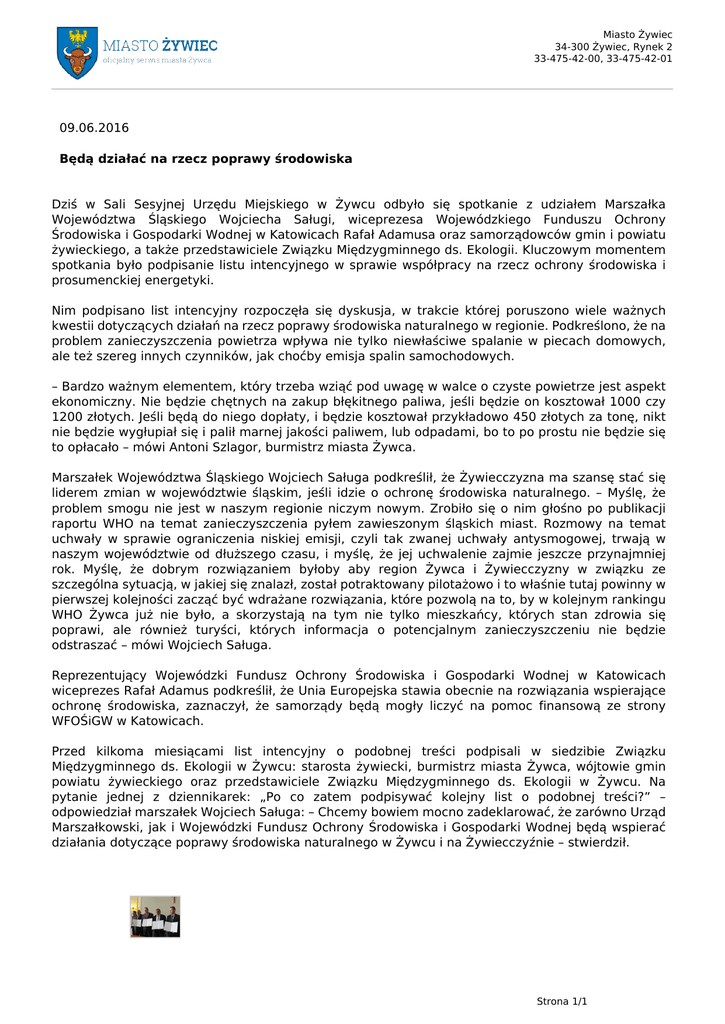 Miasto Żywiec 34-300 Żywiec, Rynek 2 33-475-42-00, 33-475-42-01 09.06.2016 Będą działać na rzecz poprawy środowiska Dziś w Sali Sesyjnej Urzędu Miejskiego w Żywcu odbyło się spotkanie z udziałem Marszałka Województwa Śląskiego Wojciecha Saługi, wiceprezesa Wojewódzkiego Funduszu Ochrony Środowiska i Gospodarki Wodnej w Katowicach Rafał Adamusa oraz samorządowców gmin i powiatu żywieckiego, a także przedstawiciele Związku Międzygminnego ds. Ekologii. Kluczowym momentem spotkania było podpisanie listu intencyjnego w sprawie współpracy na rzecz ochrony środowiska i prosumenckiej energetyki. Nim podpisano list intencyjny rozpoczęła się dyskusja, w trakcie której poruszono wiele ważnych kwestii dotyczących działań na rzecz poprawy środowiska naturalnego w regionie. Podkreślono, że na problem zanieczyszczenia powietrza wpływa nie tylko niewłaściwe spalanie w piecach domowych, ale też szereg innych czynników, jak choćby emisja spalin samochodowych. – Bardzo ważnym elementem, który trzeba wziąć pod uwagę w walce o czyste powietrze jest aspekt ekonomiczny. Nie będzie chętnych na zakup błękitnego paliwa, jeśli będzie on kosztował 1000 czy 1200 złotych. Jeśli będą do niego dopłaty, i będzie kosztował przykładowo 450 złotych za tonę, nikt nie będzie wygłupiał się i palił marnej jakości paliwem, lub odpadami, bo to po prostu nie będzie się to opłacało – mówi Antoni Szlagor, burmistrz miasta Żywca. Marszałek Województwa Śląskiego Wojciech Saługa podkreślił, że Żywiecczyzna ma szansę stać się liderem zmian w województwie śląskim, jeśli idzie o ochronę środowiska naturalnego. – Myślę, że problem smogu nie jest w naszym regionie niczym nowym. Zrobiło się o nim głośno po publikacji raportu WHO na temat zanieczyszczenia pyłem zawieszonym śląskich miast. Rozmowy na temat uchwały w sprawie ograniczenia niskiej emisji, czyli tak zwanej uchwały antysmogowej, trwają w naszym województwie od dłuższego czasu, i myślę, że jej uchwalenie zajmie jeszcze przynajmniej rok. Myślę, że dobrym rozwiązaniem byłoby aby region Żywca i Żywiecczyzny w związku ze szczególna sytuacją, w jakiej się znalazł, został potraktowany pilotażowo i to właśnie tutaj powinny w pierwszej kolejności zacząć być wdrażane rozwiązania, które pozwolą na to, by w kolejnym rankingu WHO Żywca już nie było, a skorzystają na tym nie tylko mieszkańcy, których stan zdrowia się poprawi, ale również turyści, których informacja o potencjalnym zanieczyszczeniu nie będzie odstraszać – mówi Wojciech Saługa. Reprezentujący Wojewódzki Fundusz Ochrony Środowiska i Gospodarki Wodnej w Katowicach wiceprezes Rafał Adamus podkreślił, że Unia Europejska stawia obecnie na rozwiązania wspierające ochronę środowiska, zaznaczył, że samorządy będą mogły liczyć na pomoc finansową ze strony WFOŚiGW w Katowicach. Przed kilkoma miesiącami list intencyjny o podobnej treści podpisali w siedzibie Związku Międzygminnego ds. Ekologii w Żywcu: starosta żywiecki, burmistrz miasta Żywca, wójtowie gmin powiatu żywieckiego oraz przedstawiciele Związku Międzygminnego ds. Ekologii w Żywcu. Na pytanie jednej z dziennikarek: „Po co zatem podpisywać kolejny list o podobnej treści?” – odpowiedział marszałek Wojciech Saługa: – Chcemy bowiem mocno zadeklarować, że zarówno Urząd Marszałkowski, jak i Wojewódzki Fundusz Ochrony Środowiska i Gospodarki Wodnej będą wspierać działania dotyczące poprawy środowiska naturalnego w Żywcu i na Żywiecczyźnie – stwierdził. Strona 1/1 Powered by TCPDF (www.tcpdf.org)