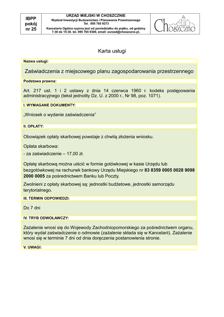 IBPP pokój nr 25 URZĄD ĄD MIEJSKI W CHOSZCZNIE Wydział Inwestycji Budownictwa i Planowania Przestrzennego Tel. 095 765 9373 Kancelaria Ogólna czynna jest od poniedziałku do piątku, pi od godziny 7:30 do 15:30. tel. 095 765 9300, email: [email protected], www.choszczno.pl Karta usługi Nazwa usługi: Zaświadczenia wiadczenia z miejscowego planu zagospodarowania przestrzennego Podstawa prawna: Art. 217 ust. 1 i 2 ustawy z dnia 14 czerwca 1960 r. kodeks postępowania administracyjnego (tekst jednolity Dz. U. z 2000 r., Nr 98, poz. 1071). I. WYMAGANE DOKUMENTY: „Wniosek o wydanie zaświadczenia” świadczenia” II. OPŁATY: Obowiązek zek opłaty skarbowej powstaje z chwilą chwil złożenia wniosku. Opłata skarbowa: - za zaświadczenie – 17,00 zł. Opłatę skarbową można ż uiścić ścić w formie gotówkowej w kasie Urzędu ędu lub bezgotówkowej na rachunek bankowy Urzędu Urz Miejskiego nr 83 8359 0005 0028 9098 2000 0005 za pośrednictwem rednictwem Banku lub Poczty. Zwolnieni z opłaty skarbowej są: są jednostki budżetowe, etowe, jednostki samorządu samorzą terytorialnego. III. TERMIN ODPOWIEDZI: Do 7 dni IV. TRYB ODWOŁAWCZY: Zażalenie wnosi się do Wojewody Zachodniopomorskiego za pośrednictwem pośrednictwem organu, który wydał zaświadczenie wiadczenie o odmowie (zażalenie (za składa się w Kancelarii). Zażalenie Za wnosi się w terminie 7 dni od dnia doręczenia dor postanowienia stronie. V. UWAGI: IBPP pokój nr 25 URZĄD ĄD MIEJSKI W CHOSZCZNIE Wydział Inwestycji Budownictwa i Planowania Przestrzennego Tel. 095 765 9373 Kancelaria Ogólna czynna jest od poniedziałku do piątku, pi od godziny 7:30 do 15:30. tel. 095 765 9300, email: [email protected], www.choszczno.pl 1. Organ administracji państwowej pań obowiązany jest wydaćć zaświadczenie, świadczenie, gdy chodzi o potwierdzenie faktów albo stanu prawnego, wynikających wynikających z prowadzonej przez ten organ ewidencji, rejestrów bądź b innych danych znajdujących się si w jego posiadaniu 2. Organ administracji państwowej, pań przed wydaniem zaświadczenia, świadczenia, może mo przeprowadzić w koniecznym zakresie postępowanie post wyjaśniające.