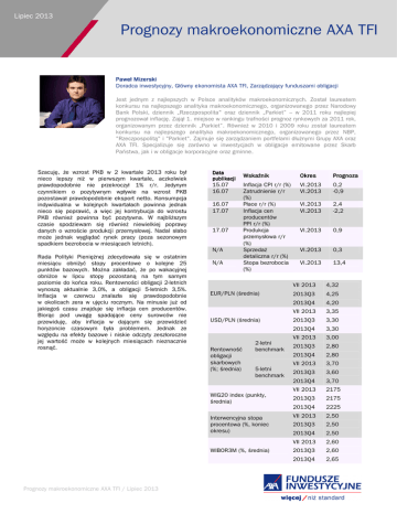 Lipiec 2013 Prognozy makroekonomiczne AXA TFI Paweł Mizerski Doradca inwestycyjny, Główny ekonomista AXA TFI, Zarządzający funduszami obligacji Jest jednym z najlepszych w Polsce analityków makroekonomicznych. Został laureatem konkursu na najlepszego analityka makroekonomicznego, organizowanego przez Narodowy Bank Polski, dziennik „Rzeczpospolita" oraz dziennik „Parkiet” – w 2011 roku najlepiej prognozował inflację. Zajął 1. miejsce w rankingu trafności prognoz rynkowych za 2011 rok, organizowanym przez dziennik „Parkiet”. Również w 2010 i 2009 roku został laureatem konkursu na najlepszego analityka makroekonomicznego, organizowanego przez NBP, "Rzeczpospolitą" i "Parkiet". Zajmuje się zarządzaniem portfelami dłużnymi Grupy AXA oraz AXA TFI. Specjalizuje się zarówno w inwestycjach w obligacje emitowane przez Skarb Państwa, jak i w obligacje korporacyjne oraz gminne. Szacuję, że wzrost PKB w 2 kwartale 2013 roku był nieco lepszy niż w pierwszym kwartale, aczkolwiek prawdopodobnie nie przekroczył 1% r/r. Jedynym czynnikiem o pozytywnym wpływie na wzrost PKB pozostawał prawdopodobnie eksport netto. Konsumpcja indywidualna w kolejnych kwartałach powinna jednak nieco się poprawić, a więc jej kontrybucja do wzrostu PKB również powinna być pozytywna. W najbliższym czasie spodziewam się również niewielkiej poprawy danych o wzroście produkcji przemysłowej. Nadal słabo może jednak wyglądać rynek pracy (poza sezonowym spadkiem bezrobocia w miesiącach letnich). Data publikacji 15.07 16.07 16.07 17.07 17.07 N/A Rada Polityki Pieniężnej zdecydowała się w ostatnim miesiącu obniżyć stopy procentowe o kolejne 25 punktów bazowych. Można zakładać, że po wakacyjnej obniżce w lipcu stopy pozostaną na tym samym poziomie do końca roku. Rentowności obligacji 2-letnich wynoszą aktualnie 3,0%, a obligacji 5-letnich 3,5%. Inflacja w czerwcu znalazła się prawdopodobnie w okolicach zera w ujęciu rocznym. Na minusie już od jakiegoś czasu znajduje się inflacja cen producentów. Biorąc pod uwagę spadające ceny surowców nie przewiduję, aby inflacja w dającym się przewidzieć horyzoncie czasowym była problemem. Jednak ze względu na efekty bazowe i niskie odczyty zeszłoroczne jej wartość może w kolejnych miesiącach nieznacznie rosnąć. N/A Wskaźnik Okres Prognoza Inflacja CPI r/r (%) Zatrudnienie r/r (%) Płace r/r (%) Inflacja cen producentów PPI r/r (%) Produkcja przemysłowa r/r (%) Sprzedaż detaliczna r/r (%) Stopa bezrobocia (%) VI.2013 VI.2013 0,2 -0,9 VI.2013 VI.2013 2,4 -2,2 VI.2013 0,9 VI.2013 0,3 VI.2013 13,4 EUR/PLN (średnia) USD/PLN (średnia) Rentowność obligacji skarbowych (%; średnia) 2-letni benchmark 5-letni benchmark WIG20 index (punkty, średnia) Interwencyjna stopa procentowa (%, koniec okresu) WIBOR3M (%, średnia) Prognozy makroekonomiczne AXA TFI / Lipiec 2013 VII 2013 4,32 2013Q3 4,25 2013Q4 4,20 VII 2013 3,35 2013Q3 3,30 2013Q4 3,30 VII 2013 3,00 2013Q3 2,80 2013Q4 2,80 VII 2013 3,70 2013Q3 3,60 2013Q4 3,70 VII 2013 2175 2013Q3 2175 2013Q4 2225 VII 2013 2,50 2013Q3 2,50 2013Q4 2,50 VII 2013 2,60 2013Q3 2,60 2013Q4 2,65