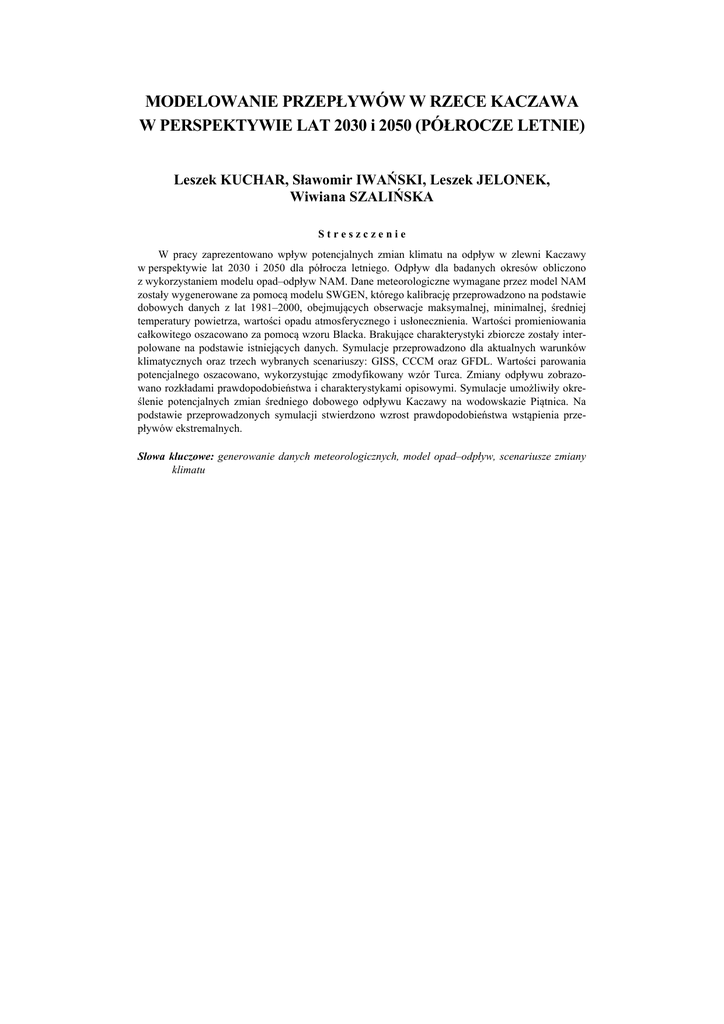 MODELOWANIE PRZEPŁYWÓW W RZECE KACZAWA W PERSPEKTYWIE LAT 2030 i 2050 (PÓŁROCZE LETNIE) Leszek KUCHAR, Sławomir IWAŃSKI, Leszek JELONEK, Wiwiana SZALIŃSKA Streszczenie W pracy zaprezentowano wpływ potencjalnych zmian klimatu na odpływ w zlewni Kaczawy w perspektywie lat 2030 i 2050 dla półrocza letniego. Odpływ dla badanych okresów obliczono z wykorzystaniem modelu opad–odpływ NAM. Dane meteorologiczne wymagane przez model NAM zostały wygenerowane za pomocą modelu SWGEN, którego kalibrację przeprowadzono na podstawie dobowych danych z lat 1981–2000, obejmujących obserwacje maksymalnej, minimalnej, średniej temperatury powietrza, wartości opadu atmosferycznego i usłonecznienia. Wartości promieniowania całkowitego oszacowano za pomocą wzoru Blacka. Brakujące charakterystyki zbiorcze zostały interpolowane na podstawie istniejących danych. Symulacje przeprowadzono dla aktualnych warunków klimatycznych oraz trzech wybranych scenariuszy: GISS, CCCM oraz GFDL. Wartości parowania potencjalnego oszacowano, wykorzystując zmodyfikowany wzór Turca. Zmiany odpływu zobrazowano rozkładami prawdopodobieństwa i charakterystykami opisowymi. Symulacje umożliwiły określenie potencjalnych zmian średniego dobowego odpływu Kaczawy na wodowskazie Piątnica. Na podstawie przeprowadzonych symulacji stwierdzono wzrost prawdopodobieństwa wstąpienia przepływów ekstremalnych. Słowa kluczowe: generowanie danych meteorologicznych, model opad–odpływ, scenariusze zmiany klimatu