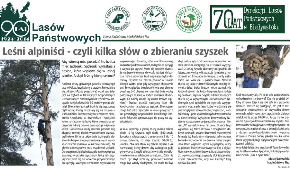 Strona Nadleśnictw Maskulińskie i Pisz Leśni alpiniści - czyli kilka słów o zbieraniu szyszek Aby wiosną móc posadzić las trzeba mieć sadzonki. Sadzonki wyrastają z nasion, które wysiewa się w leśnej szkółce. A skąd leśnicy biorą nasiona? Nasiona sosny, głównego gatunku tworzącego lasy w Polsce, uzyskujemy z szyszek, które zbiera się z drzew. Można pozyskiwać je z drzew ściętych na zrębach w tak zwanych Gospodarczych Drzewostanach Nasiennych lub też z drzew stojących. Ale jak dostać się 30 metrów ponad ziemię? Zbieraniem szyszek trudnią się szyszkarze, czyli ludzie, którzy wspinają się na drzewa – leśni alpiniści. Podstawowym elementem ekwipunku szyszkarza są drzewołazy - specjalne kolce nakładane na buty, które pozwalają zaczepić się o korę drzewa oraz uprząż wspinaczkowa. Dodatkowo każdy zbieracz posiada linę długości równej dwóm wysokościom drzewa, czyli około 60 m, a także dwie ląże (pętle służące do bezpiecznego poruszania się na wysokości wśród konarów w koronie drzewa). Na głowie obowiązkowo musi znajdować się kask. Do przyginania gałęzi używa się zagiętego pręta zwanego w języku szyszkarzy kulką lub lagą. Szyszki zbiera się do woreczka przyczepionego do uprzęży. Ważnym elementem wyposażenia wspinacza jest lornetka, która umożliwia ocenę konkretnego drzewa zanim podejmie on decyzję o wejściu po szyszki. Może się bowiem okazać, że na drzewie nie ma ich wcale lub jest ich bardzo mało i wówczas trud wspinacza byłby daremny. Szyszek nie można zbierać w trakcie silnego wiatru oraz gdy występuje oblodzenie pni. Ze względów bezpieczeństwa przy zbiorze powinny być obecne co najmniej dwie osoby pozostające ze sobą w stałym kontakcie słuchowym. Co należy zrobić, by zostać leśnym alpinistą? Trzeba przejść specjalny kurs dla kandydatów na zbieraczy szyszek. Zbieraczami mogą być tylko mężczyźni w wieku powyżej 18 lat, posiadający odpowiednie kwalifikacje i badania lekarskie uprawniające do pracy na wysokościach. W roku urodzaju z jednej sosny można zebrać około 10 kg szyszek, czyli około 1500 sztuk. Szyszkarz zbiera szyszki z przeciętnie 5 do 10 drzew dziennie, co daje średnio 50-60 kg urobku. Zbieracz stara się zebrać szyszki z jak największej liczby drzew, aby wzbogacić pulę genetyczną. Szyszki zbiera się w ściśle określonym terminie w zależności od gatunku. Zbiór nie może być zbyt wczesny, ponieważ nasiona mogą być wtedy niedojrzałe, nie może też być zbyt późny, gdyż od pewnego momentu dojrzałe nasiona zaczynają się z szyszek wysypywać. Z sosny szyszki zbieramy od grudnia do lutego, ze świerka w listopadzie i grudniu, z modrzewia od listopada do lutego, z jodły natomiast we wrześniu i październiku. Nasiona zbiera się także z drzew liściastych, między innymi z dębu, buka, brzozy i olszy czarnej. Nie każde drzewo i nie każdy fragment lasu nadaje się do zbioru szyszek. Szyszki z drzew rosnących zbiera się w Wyłączonych Drzewostanach Nasiennych, czyli specjalnie do tego celu wytypowanych obszarach lasu, które wyróżniają się pod względem zdrowotności, wysokości, jakości korony i pnia spośród innych drzewostanów w danej okolicy. Wyłączone Drzewostany Nasienne rozpoznamy po jasnożółtej opasce i literze „N” wymalowanej na pniu. Oprócz tego wyróżnia się także drzewa o wyjątkowo dobrych cechach, zwane drzewami matecznymi. Te mają już konkretny niepowtarzalny numer. Technika wchodzenia na drzewa mateczne jest inna. Przed wejściem używa się specjalnej kuszy, za pomocą której wstrzeliwuje się linę z ciężarkiem na wierzchołek drzewa. Na drzewo wchodzi się wykorzystując przyrządy alpinistyczne bez użycia drzewołazów, aby nie kaleczyć kory drzewa kolcami. Ktoś może zapytać: „Po co to całe zamieszanie z wchodzeniem na drzewa? Czy nie prościej byłoby drzewo ściąć i szyszki zebrać z poziomu ziemi?!”. Tak też się postępuje, ale jest to rozwiązanie jednorazowe. W przypadku drzew cennych zależy nam, aby szyszki móc zbierać wielokrotnie przez 30-50 lat. A czy ma to znaczenie z jakiego drzewa zbierzemy szyszki? Tak. Drzewa dziedziczą pewne cechy genetycznie, co oznacza, że z nasion drzew o dobrej jakości pnia z dużym prawdopodobieństwem wyrosną drzewa o równie dobrej jakości. Nauka leśna, która się tym zajmuje nazywana jest nasiennictwem i selekcją. A co dalej dzieje się z szyszkami? Tego dowiedzą się Państwo za dwa tygodnie, w kolejnym artykule z cyklu „Rok z życia lasu”. Maciej Domański Nadleśnictwo Pisz 6814piwp-a-M