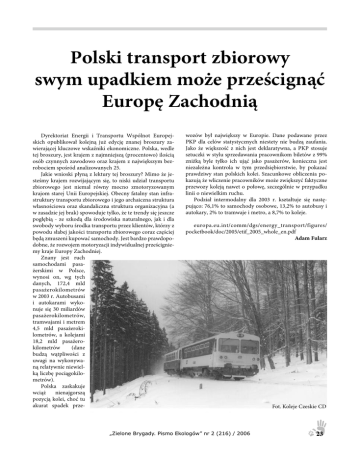 Polski transport zbiorowy swym upadkiem może prześcignąć Europę Zachodnią Dyrektoriat Energii i Transportu Wspólnot Europejskich opublikował kolejną już edycję znanej broszury zawierającej kluczowe wskaźniki ekonomiczne. Polska, wedle tej broszury, jest krajem z najmniejszą (procentowo) ilością osób czynnych zawodowo oraz krajem z największym bezrobociem spośród analizowanych 25. Jakie wnioski płyną z lektury tej broszury? Mimo że jesteśmy krajem rozwijającym się, to niski udział transportu zbiorowego jest niemal równy mocno zmotoryzowanym krajom starej Unii Europejskiej. Obecny fatalny stan infrastruktury transportu zbiorowego i jego archaiczna struktura własnościowa oraz skandaliczna struktura organizacyjna (a w zasadzie jej brak) spowoduje tylko, że te trendy się jeszcze pogłębią - ze szkodą dla środowiska naturalnego, jak i dla swobody wyboru środka transportu przez klientów, którzy z powodu słabej jakości transportu zbiorowego coraz częściej będą zmuszeni kupować samochody. Jest bardzo prawdopodobne, że rozwojem motoryzacji indywidualnej prześcigniemy kraje Europy Zachodniej. Znany jest ruch samochodami pasażerskimi w Polsce, wynosi on, wg tych danych, 172,4 mld pasażerokilometrów w 2003 r. Autobusami i autokarami wykonuje się 30 miliardów pasażerokilometrów, tramwajami i metrem 4,5 mld pasażerokilometrów, a kolejami 18,2 mld pasażerokilometrów (dane budzą wątpliwości z uwagi na wykonywaną relatywnie niewielką liczbę pociągokilometrów). Polska zaskakuje wciąż nienajgorszą pozycją kolei, choć tu akurat spadek prze- wozów był największy w Europie. Dane podawane przez PKP dla celów statystycznych niestety nie budzą zaufania. Jako że większość z nich jest deklaratywna, a PKP stosuje sztuczki w stylu sprzedawania pracownikom biletów z 99% zniżką byle tylko ich ująć jako pasażerów, konieczna jest niezależna kontrola w tym przedsiębiorstwie, by pokazać prawdziwy stan polskich kolei. Szacunkowe obliczenia pokazują że wliczenie pracowników może zwiększyć faktyczne przewozy koleją nawet o połowę, szczególnie w przypadku linii o niewielkim ruchu. Podział intermodalny dla 2003 r. kształtuje się następująco: 76,1% to samochody osobowe, 13,2% to autobusy i autokary, 2% to tramwaje i metro, a 8,7% to koleje. europa.eu.int/comm/dgs/energy_transport/figures/ pocketbook/doc/2005/etif_2005_whole_en.pdf Adam Fularz „Zielone Brygady. Pismo Ekologów” nr 2 (216) / 2006 Fot. Koleje Czeskie CD 23