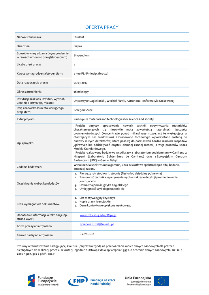 OFERTA PRACY Nazwa stanowiska: Student Dziedzina: Fizyka Sposób wynagradzania (wynagrodzenie w ramach umowy o pracę/stypendium): Stypendium Liczba ofert pracy: 2 Kwota wynagrodzenia/stypendium: 2 500 PLN/miesiąc (brutto) Data rozpoczęcia pracy: 01.03.2017 Okres zatrudnienia: 16 miesięcy Instytucja (zakład / instytut / wydział / uczelnia / instytucja, miasto): Uniwersytet Jagielloński, Wydział Fizyki, Astronomii i Informatyki Stosowanej Imię i nazwisko laureata kierującego projektem: Grzegorz Zuzel Tytuł projektu: Radio-pure materials and technologies for science and society Opis projektu: Zadania badawcze: Oczekiwania wobec kandydatów: Lista wymaganych dokumentów: Dodatkowe informacje o rekrutacji (np. strona www): Adres przesyłania zgłoszeń: Termin nadsyłania zgłoszeń: Projekt dotyczy opracowania nowych technik otrzymywania materiałów charakteryzujących się niezwykle małą zawartością naturalnych izotopów promieniotwórczych (koncentracje ponad miliard razy niższe, niż te występujące w otaczającym nas środowisku). Opracowane technologie wykorzystane zostaną do budowy dużych detektorów, które posłużą do poszukiwań bardzo rzadkich rozpadów jądrowych lub oddziaływań cząstek ciemnej zimnej materii, a więc procesów spoza Modelu Standardowego. Projekt realizowany będzie we współpracy z laboratorium podziemnym w Canfranc w Hiszpanii (Laboratorio Subterráneo de Canfranc) oraz z Europejskim Centrum Badawczym (JRC) w Geel w Belgii. Wysokoczuła spektroskopia gamma, ultra-niskotłowa spektroskopia alfa, badania emanacji radonu 1. Pierwszy rok studiów II. stopnia (fizyka lub dziedzina pokrewna) 2. Znajomość technik eksperymentalnych w zakresie detekcji promieniowania jonizującego 3. Dobra znajomość języka angielskiego 4. Umiejętność szybkiego uczenia się 1. List motywacyjny i życiorys 2. Kopia pracy licencjackiej 3. Dane kontaktowe opiekuna naukowego www.zdfk.if.uj.edu.pl/?p=51 [email protected] 24.02.2017 Prosimy o zamieszczenie następującej klauzuli: „Wyrażam zgodę na przetwarzanie moich danych osobowych dla potrzeb niezbędnych do realizacji procesu rekrutacji zgodnie z Ustawą z dnia 29 sierpnia 1997 r. o ochronie danych osobowych ( Dz. U. z 2016 r. poz. 922 z późń. zm.)”