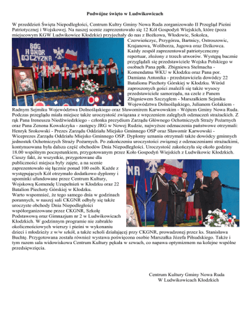 Podwójne święto w Ludwikowicach W przeddzień Święta Niepodległości, Centrum Kultry Gminy Nowa Ruda zorganizowało II Przegląd Pieśni Patriotycznej i Wojskowej. Na naszej scenie zaprezentowało się 12 Kół Gospodyń Wiejskich, które (poza miejscowym KGW Ludwikowice Kłodzkie) przyjechały do nas z Bożkowa, Włodowic, Sokolca, Czerwieńczyc, Przygórza, Bartnicy, Ostroszowic, Krajanowa, Woliborza, Jugowa oraz Dzikowca. Każdy zespół zaprezentował patriotycznczny repertuar, złożony z trzech utworów. Występą bacznie przyglądali się przedstawiciele Wojska Polskiego w osobach Pana ppłk. Zbigniewa Stelmacha Komendatna WKU w Kłodzku oraz Pana por. Damiana Antonika - przedstawiciela dowódcy 22 Batalionu Piechoty Górskiej w Kłodzku. Wśród zaproszonych gości znaleźli się także wysocy przedstawiciele samorządu, na czele z Panem Zbigniewem Szczygłem - Marszałkiem Sejmiku Województwa Dolnośląskiego, Julianem Golakiem Radnym Sejmiku Województwa Dolnośląskiego oraz Sławomirem Karwowskim - Wójtem Gminy Nowa Ruda. Podczas przeglądu miała miejsce także uroczystość związana z wręczeniem zaległych odznaczeń strażackich. Z rąk Pana Ireneusza Niedźwiedzkiego - członka prezydium Zarządu Głównego Ochotniczych Straży Pożarnych oraz Pana Zenona Kowalczyka - zastępcy JRG w Nowej Rudzie, najwyższe odznaczenia państwowe otrzymali: Henryk Srokowski - Prezes Zarządu Oddziału Miejsko Gminnego OSP oraz Sławomir Karwowski Wiceprezes Zarządu Oddziału Miejsko Gminnego OSP. Dyplomy uznania otrzymali także dowódcy gminnych jednostek Ochotniczych Straży Pożarnych. Po zakończeniu uroczystości związnej z odznaczeniami strażackimi, kontynuowana była dalsza część obchodów Dnia Niepodległości. Uroczystość zakończyła się około godziny 18.00 wspólnym poczęstunkiem, przygotowanym przez Koło Gospodyń Wiejskich z Ludwikowic Kłodzkich. Cieszy fakt, że wszystkie, przygotowane dla publiczności miejsca były zajęte, a na scenie zaprezentowało się łącznie ponad 100 osób. Każde z występujących Kół otrzymało dodatkowo dyplomy i upominki ufundowane przez Centrum Kultury, Wojskową Komendę Uzupełnień w Kłodzku oraz 22 Batalion Piechoty Górskiej w Kłodzku. Warto wspomnieć, że tego samego dnia w godzinach porannych, w naszej sali CKGNR odbyły się także uroczyste obchody Dnia Niepodległości współorganizowane przez CKGNR, Szkołę Podstawową oraz Gimnazjum nr 2 w Ludwikowicach Kłodzkich. W godzinnym programie nie zabrakło okolicznościowych wierszy i pieśni w wykonaniu dzieci i młodzieży z w/w szkół, a także scholi działającej przy CKGNR, prowadzonej przez ks. Stanisława Buchtę. Przygotowana została również wystawa poświęcona osobie Marszałka Józefa Piłsudskiego. Także i tym razem sala widowiskowa Centrum Kultury pękała w szwach, co napawa optymizmem na kolejne wspólne przedsięwzięcia. Centrum Kultury Gminy Nowa Ruda W Ludwikowicach Kłodzkich