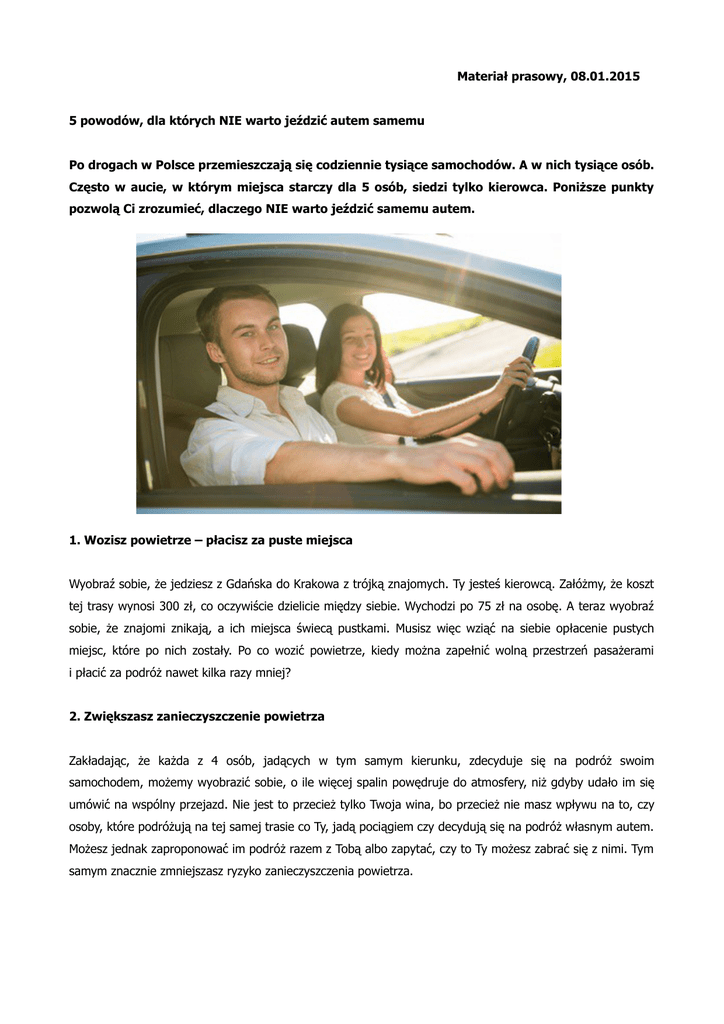 Materiał prasowy, 08.01.2015 5 powodów, dla których NIE warto jeździć autem samemu Po drogach w Polsce przemieszczają się codziennie tysiące samochodów. A w nich tysiące osób. Często w aucie, w którym miejsca starczy dla 5 osób, siedzi tylko kierowca. Poniższe punkty pozwolą Ci zrozumieć, dlaczego NIE warto jeździć samemu autem. 1. Wozisz powietrze – płacisz za puste miejsca Wyobraź sobie, że jedziesz z Gdańska do Krakowa z trójką znajomych. Ty jesteś kierowcą. Załóżmy, że koszt tej trasy wynosi 300 zł, co oczywiście dzielicie między siebie. Wychodzi po 75 zł na osobę. A teraz wyobraź sobie, że znajomi znikają, a ich miejsca świecą pustkami. Musisz więc wziąć na siebie opłacenie pustych miejsc, które po nich zostały. Po co wozić powietrze, kiedy można zapełnić wolną przestrzeń pasażerami i płacić za podróż nawet kilka razy mniej? 2. Zwiększasz zanieczyszczenie powietrza Zakładając, że każda z 4 osób, jadących w tym samym kierunku, zdecyduje się na podróż swoim samochodem, możemy wyobrazić sobie, o ile więcej spalin powędruje do atmosfery, niż gdyby udało im się umówić na wspólny przejazd. Nie jest to przecież tylko Twoja wina, bo przecież nie masz wpływu na to, czy osoby, które podróżują na tej samej trasie co Ty, jadą pociągiem czy decydują się na podróż własnym autem. Możesz jednak zaproponować im podróż razem z Tobą albo zapytać, czy to Ty możesz zabrać się z nimi. Tym samym znacznie zmniejszasz ryzyko zanieczyszczenia powietrza. 3. Przyczyniasz się do powstawania korków na drogach O ile zanieczyszczenie powietrza trudniej sobie wyobrazić, o tyle korki na drogach są problemem, który łatwo zauważyć na polskich drogach. O ile lepiej jeździłoby się na najbardziej uczęszczanych trasach w kraju, gdyby zamiast 10 samochodów, które wiozą w sumie np. 20 osób, wypuścić na drogi 5 aut, które będą pełne? I pomyśl, że to Ty możesz być inżynierem tego jakże łatwego, a skutecznego rozwiązania problemu korków drogowych! 4. Jedyną osobą, z którą możesz porozmawiać, jesteś Ty sam Najbardziej prozaiczny powód – nuda. Możesz mówić, że inteligentni ludzie nie nudzą się w swoim własnym towarzystwie, ale nie zaprzeczysz, że długa podróż w samotności będzie trwała wieczność, natomiast urozmaicona rozmową minie jak z bicza trzasł. Nawet jeśli nie jesteś zbyt rozmowny, to dobrze mieć świadomość, że obok jest ktoś, do kogo w razie czego można się odezwać. 5. Jesteś zdany tylko na siebie Być może uważasz się za osobę samodzielną i samowystarczalną, ale prawda jest taka, że nikt nie jest. Jesteśmy stworzeni do życia w grupie. Nie chodzi tylko o to, że czas szybciej mija, ale w stresującej lub kłopotliwej sytuacji dobrze mieć przy boku kogoś, kto pomoże lub doradzi. Złapałeś gumę, ale nigdy nie wymieniałeś opony? A może utknąłeś w korku i potrzebujesz kogoś, kto ostudzi Twoje nerwy? Towarzysz u boku z pewnością przyda się w niespodziewanych sytuacjach. Jeśli nie sam, to z kim? Oczywiste jest, że nie zawsze znajdziesz znajomych, którzy wybierają się tego samego dnia, co Ty w daną trasę. Mądre głowy wymyśliły jednak, jak sprawić, żebyś jak najczęściej mógł zabierać ze sobą kogoś w podróż i dzielić z nim koszty paliwa. W tym celu powstają rozwiązania znane pod nazwą capooling – Grupowe przejazdy nie istnieją od wczoraj. Ludzie zawsze umawiali się, ale tylko w grupie najbliższych znajomych. Dzisiaj dla naszej wygody powstają portale i aplikacje, na których znajdziemy ludzi podobnych do nas, który chcą jeździć taniej i przyjemniej. Carpooling to nie tylko sposób na oszczędność, ale też zawarcie nowych znajomości – przekonuje Adam Tychmanowicz, twórca Yanosik Autostop – aplikacji do wspólnych przejazdów. ........................................ Dystrybucja materiałów: Joanna Ciemny [email protected] tel. 730 311 112