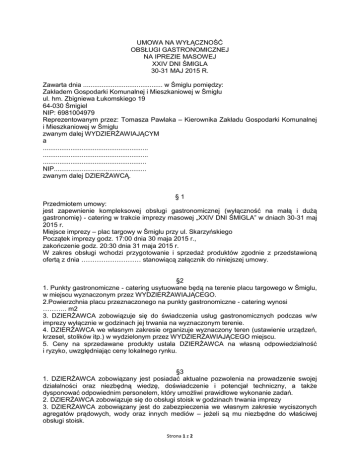 UMOWA NA WYŁĄCZNOŚĆ OBSŁUGI GASTRONOMICZNEJ NA IPREZIE MASOWEJ XXIV DNI ŚMIGLA 30-31 MAJ 2015 R. Zawarta dnia ........................................... w Śmiglu pomiędzy: Zakładem Gospodarki Komunalnej i Mieszkaniowej w Śmiglu ul. hm. Zbigniewa Łukomskiego 19 64-030 Śmigiel NIP: 6981004979 Reprezentowanym przez: Tomasza Pawlaka – Kierownika Zakładu Gospodarki Komunalnej i Mieszkaniowej w Śmiglu zwanym dalej WYDZIERŻAWIAJĄCYM a ......................................................... ......................................................... ........................................................ NIP.................................................. zwanym dalej DZIERŻAWCĄ. §1 Przedmiotem umowy: jest zapewnienie kompleksowej obsługi gastronomicznej (wyłączność na małą i dużą gastronomię) - catering w trakcie imprezy masowej „XXIV DNI ŚMIGLA” w dniach 30-31 maj 2015 r. Miejsce imprezy – plac targowy w Śmiglu przy ul. Skarzyńskiego Początek imprezy godz. 17:00 dnia 30 maja 2015 r., zakończenie godz. 20:30 dnia 31 maja 2015 r. W zakres obsługi wchodzi przygotowanie i sprzedaż produktów zgodnie z przedstawioną ofertą z dnia ……………………… stanowiącą załącznik do niniejszej umowy. §2 1. Punkty gastronomiczne - catering usytuowane będą na terenie placu targowego w Śmiglu, w miejscu wyznaczonym przez WYDZIERŻAWIAJĄCEGO. 2.Powierzchnia placu przeznaczonego na punkty gastronomiczne - catering wynosi ……….. m2 3. DZIERŻAWCA zobowiązuje się do świadczenia usług gastronomicznych podczas w/w imprezy wyłącznie w godzinach jej trwania na wyznaczonym terenie. 4. DZIERŻAWCA we własnym zakresie organizuje wyznaczony teren (ustawienie urządzeń, krzeseł, stolików itp.) w wydzielonym przez WYDZIERŻAWIAJĄCEGO miejscu. 5. Ceny na sprzedawane produkty ustala DZIERŻAWCA na własną odpowiedzialność i ryzyko, uwzględniając ceny lokalnego rynku. §3 1. DZIERŻAWCA zobowiązany jest posiadać aktualne pozwolenia na prowadzenie swojej działalności oraz niezbędną wiedzę, doświadczenie i potencjał techniczny, a także dysponować odpowiednim personelem, który umożliwi prawidłowe wykonanie zadań. 2. DZIERŻAWCA zobowiązuje się do obsługi stoisk w godzinach trwania imprezy 3. DZIERŻAWCA zobowiązany jest do zabezpieczenia we własnym zakresie wyciszonych agregatów prądowych, wody oraz innych mediów – jeżeli są mu niezbędne do właściwej obsługi stoisk. Strona 1 z 2 4. DZIERŻAWCA zobowiązuje się do zachowania czystości na obszarze objętym wyłącznością podczas trwania imprezy oraz posprzątanie tego terenu po zakończeniu imprezy. 5. DZIERŻAWCA zobowiązany jest do ustawienia urządzeń sprawnych technicznie, czystych i estetycznych oraz zapewnienia bezpiecznego korzystania z nich, 6. DZIERŻAWCA zobowiązany jest do przestrzegania postanowień WYDZIERŻAWIAJĄCEGO i Organizatora imprezy w zakresie zapewnienia porządku i bezpieczeństwa przebiegu imprezy, 7. Za wszelkie szkody wynikające z niewłaściwego użytkowania przez DZIERŻAWCĘ udostępnionego terenu odpowiada DZIERŻAWCA, 8. WYDZIERŻAWIAJĄCY nie ponosi odpowiedzialności za szkody w mieniu DZIERŻAWCY oraz osób, którymi ewentualnie DZIERŻAWCA się posługuje przy wykonaniu umowy zawartej z ZGKiM w Śmiglu wyrządzonej w szczególności przez uczestników imprezy, 9. WYDZIERŻAWIAJĄCY nie ponosi odpowiedzialności za odwołanie imprezy z przyczyn od niego niezależnych, 10. W przypadku odwołania imprezy kwota dzierżawy zostanie zwrócona DZIERŻAWCY. §4 1.DZIERŻAWCA uiści na rzecz WYDZIERŻAWIAJĄCEGO kwotę ....................................../netto (słownie: .........................................................................) plus należny podatek VAT tytułem opłaty za dzierżawę i wyznaczenie stoiska płatne w całości w kasie Zakładu Gospodarki Komunalnej i Mieszkaniowej w Śmiglu lub przedpłatą na rachunek bankowy 02866700030011137320000010 co najmniej 7 (siedem) dni przed planowaną imprezą. 2. W przypadku odstąpienia od wykonania umowy przez DZIERŻAWCĘ wpłacona kwota nie podlega zwrotowi. 3. W przypadku podpisania umowy przez DZIERŻAWCĘ i braku zapłaty w wyznaczonym terminie, należność z tytułu podpisania umowy będzie fakturowana i wymagana zgodnie z umową. §5 1. Obie strony niniejszej umowy zapewniają, że realizować będą swoje obowiązki wynikające z tej umowy z najwyższą starannością. 2. Wszelkie zmiany niniejszej umowy wymagają dla swej ważności formy pisemnego aneksu podpisanego przez obie strony. 3. Wszelkie spory mogące wyniknąć z niniejszej umowy będzie rozstrzygać sąd właściwy miejscowo dla WYDZIERŻAWIAJĄCEGO 4. Umowa została sporządzona w dwóch jednobrzmiących egzemplarzach po jednym dla każdej ze stron DZIERŻAWCA WYDZIERŻAWIAJĄCY Strona 2 z 2