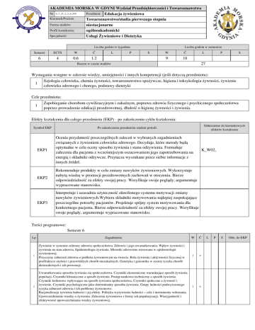 AKADEMIA MORSKA W GDYNI Wydział Przedsiębiorczości i Towaroznawstwa Nr 4_7_37_2_5_6_939 Przedmiot: Edukacja żywieniowa Kierunek/Poziom Towaroznawstwo/studia pierwszego stopnia Forma studiów: niestacjonarne Profil kształcenia: ogólnoakademicki Specjalność: Usługi Żywieniowe i Dietetyka Liczba godzin w tygodniu Semestr ECTS W Ć 6 4 0.6 1.2 L P Liczba godzin w semestrze S W Ć 9 18 L P S 27 Razem w czasie studiów Wymagania wstępne w zakresie wiedzy, umiejętności i innych kompetencji (jeśli dotyczą przedmiotu): 1 fizjologia człowieka, chemia żywności, towaroznawstwo spożywcze, higiena i toksykologia żywności, żywienie człowieka zdrowego i chorego, podstawy dietetyki Cele przedmiotu: 1 Zapobieganie chorobom cywilizacyjnym i zakaźnym, poprawa zdrowia fizycznego i psychicznego społeczeństwa poprzez prowadzenie edukacji prozdrowotnej, dbałość o higienę żywności i żywienia. Efekty kształcenia dla całego przedmiotu (EKP) - po zakończeniu cyklu kształcenia: Symbol EKP Odniesienie do kierunkowych efektów kształcenia Po zakończeniu przedmiotu student potrafi: EKP1 Ocenia przydatność poszczególnych zaleceń w wybranych zagadnieniach związanych z żywieniem człowieka zdrowego. Decyduje, które metody będą optymalne w celu oceny sposobu żywienia i stanu odżywienia. Formułuje zalecenia dla pacjenta z wcześniejszym oszacowaniem jego zapotrzebowania na energię i składniki odżywcze. Przytacza wyszukane przez siebie informacje z innych źródeł. EKP2 Rekomenduje produkty w celu zmiany nawyków żywieniowych. Wykorzystuje nabytą wiedzę w promocji prozdrowotnych zachowań w otoczeniu. Bierze odpowiedzialność za efekty swojej pracy. Weryfikuje swoje poglądy, argumentuje wypracowane stanowisko. EKP3 Interpretuje i uzasadnia użyteczność określonego systemu motywacji zmiany nawyków żywieniowych.Wybiera składniki motywowania najlepiej zaspokajające poszczególne potrzeby pacjentów. Projektuje spójny system motywowania dla konkretnego pacjenta. Bierze odpowiedzialność za efekty swojej pracy. Weryfikuje swoje poglądy, argumentuje wypracowane stanowisko. K_W02, Treści programowe: Semestr 6 Lp Zagadnienia W Ć 1 Żywienie w systemie ochrony zdrowia społeczeństwa. Zdrowie i jego uwarunkowania. Wpływ żywności i żywienia na stan zdrowia. Epidemiologia żywienia. Mierniki zdrowotne stosowane w epidemiologii żywieniowej. Przyczyny zaburzeń zdrowia o podłożu żywieniowym na świecie. Rola żywienia i aktywności fizycznej w profilaktyce otyłości i przewlekłych chorób niezakaźnych. Genetyka i genomika w ocenie ryzyka chorób dietozależnych i ich prewencji. 2 6 2 Uwarunkowania sposobu żywienia się społeczeństwa. Czynniki ekonomiczne warunkujące sposób żywienia populacji. Czynniki klimatyczne a sposób żywienia. Postęp naukowo-techniczny a sposób żywienia. Czynniki kulturowe wpływające na sposób żywienia społeczeństwa. Czynniki społeczne a żywność i żywienie. Czynniki psychologiczne jako determinanty sposobu żywienia. Grupy ludności podwyższonego ryzyka zaburzeń zdrowia i ich problemy żywieniowe. Racjonalizacja żywienia ludności i jej efekty. Polityka wyżywienia ludności – cele i instrumenty wdrażania. Upowszechnianie wiedzy o żywieniu. Zalecenia żywieniowe i formy ich popularyzacji. Wiarygodność i efektywność upowszechniania wiedzy żywieniowej. 2 6 L P S Odn. do EKP 3 Diety alternatywne w świetle nauki o żywieniu. Charakterystyka popularnych diet alternatywnych. Ogólna ocena racjonalności odchudzających diet alternatywnych. Wzbogacanie żywności jako instrument optymalizacji sposobu żywienia społeczeństwa. Wzbogacanie obligatoryjne i dobrowolne. Rynek żywności wzbogacanej. Efektywność i bezpieczeństwo wzbogacania żywności. Rola wzbogacania w poprawie sytuacji zdrowotnej społeczeństwa. Suplementy diety i ich rola w poprawie stanu odżywienia i stanu zdrowia ludności. 2 4 Bezpieczeństwo żywności i żywienia. Zatrucia pokarmowe jako problem społeczny. Działania prewencyjne mające na celu zmniejszenie ryzyka zatruć pokarmowych. Wdrażanie systemów zarzadzania bezpieczeństwem zdrowotnym żywności. Regulacje prawne zapewniające bezpieczeństwo żywności. Przepisy dotyczące znakowania żywności. Żywienie a zdrowie społeczne w perspektywie XXI wieku. Cechy charakterystyczne żywienia w XXI wieku. Przewidywane problemy żywieniowo-zdrowotne w XXI wieku. Nowa żywność jako źródło składników o działaniu fizjologicznym. Żywność genetycznie modyfikowana jako potencjalne źródło składników odżywczych w diecie. 2 5 Żywienie w systemie ochrony zdrowia społeczeństwa. Zdrowie i jego uwarunkowania. Wpływ żywności i żywienia na stan zdrowia. Epidemiologia żywienia. Mierniki zdrowotne stosowane w epidemiologii żywieniowej. Przyczyny zaburzeń zdrowia o podłożu żywieniowym na świecie. Rola żywienia i aktywności fizycznej w profilaktyce otyłości i przewlekłych chorób niezakaźnych. Genetyka i genomika w ocenie ryzyka chorób dietozależnych i ich prewencji. 1 6 Metody weryfikacji efektów kształcenia (w odniesieniu do poszczególnych efektów): Symbol EKP Test Egzamin ustny Egzamin pisemny Kolokwium Sprawozdanie EKP1 X X EKP2 X X EKP3 X X Projekt Prezentacja Zaliczenie praktyczne Inne Kryteria zaliczenia przedmiotu: Semestr 6 Ocena pozytywna (min. dostateczny) uzyskanie zakładanych efektów kształcenia, 100% obecność na zajęciach, przystąpienie i pozytywna ocena z kolokwiów cząstkowych - próg zaliczenia 60%,wykonanie ćwiczeń praktycznych i ich zaliczenie na pozytywną ocenę - próg zaliczenia 60% Uwaga: student otrzymuje ocenę powyżej dostatecznej, jeżeli uzyskane efekty kształcenia przekraczają wymagane minimum. Nakład pracy studenta: Forma aktywności Godziny kontaktowe Czytanie literatury Przygotowanie do zajęć laboratoryjnych, projektowych Przygotowanie do egzaminu, zaliczenia Opracowanie dokumentacji projektu/sprawozdania U