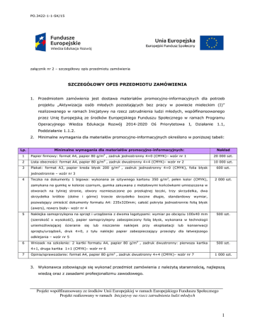 PO.3422-1-1-SK/15 załącznik nr 2 – szczegółowy opis przedmiotu zamówienia SZCZEGÓŁOWY OPIS PRZEDMIOTU ZAMÓWIENIA 1. Przedmiotem zamówienia jest dostawa materiałów promocyjno-informacyjnych dla potrzeb projektu „Aktywizacja osób młodych pozostających bez pracy w powiecie mieleckim (I)” realizowanego w ramach Inicjatywy na rzecz zatrudnienia ludzi młodych, współfinansowanego przez Unię Europejską ze środków Europejskiego Funduszu Społecznego w ramach Programu Operacyjnego Wiedza Edukacja Rozwój 2014-2020 Oś Priorytetowa I, Działanie 1.1, Poddziałanie 1.1.2. 2. Minimalne wymagania dla materiałów promocyjno-informacyjnych określono w poniższej tabeli: Lp. Minimalne wymagania dla materiałów promocyjno-informacyjnych: Nakład 1 Papier firmowy: format A4, papier 80 g/m2 , zadruk jednostronny 4+0 (CMYK)– wzór nr 1 20 000 szt. 2 Lista obecności: format A4, papier 80 g/m2 , zadruk dwustronny 4+4 (CMYK)– wzór nr 2 10 000 szt. 3 2 600 szt. Teczka na dokumenty 1 bigowa: wykonana ze sztywnego kartonu 350 g/m2, pełen kolor (CMYK), 2 000 szt. Plakat: format A3, papier kreda błysk 200 g/m , zadruk jednostronny 4+0 (CMYK), folia błysk jednostronnie – wzór nr 3 4 zamykana na gumkę w kolorze czarnym, gumka zakuwana z metalowymi końcówkami umieszczona w otworach na tylniej stronie, otwory rozmieszczone po przekątnej teczki, trzy skrzydełka, dwa skrzydełka krótkie (dolne i górne) trzecie skrzydełko boczne długie, standardowy wymiar, pozwalający zmieścić dokumenty formatu A4: 235x320mm; całość pokryta jednostronnie folią błysk (awers), rewers biały– wzór nr 4 5 Naklejka samoprzylepna na sprzęt i urządzenia z dwoma logotypami: wymiar po obcięciu 100x40 mm 500 szt. (szerokość x wysokość), papier samoprzylepny zabezpieczony folią błysk, wykonana w technologii uniemożliwiającej ścieranie się lub niszczenie naklejek przy eksploatacji lub konserwacji sprzętu/urządzeń, druk 4+0, z tyłu naklejki papier zabezpieczający przecięty dla łatwiejszego odklejania – wzór nr 5 6 Wniosek na szkolenie: 2 kartki formatu A4, papier 80 g/m2 , zadruk dwustronny: pierwsza kartka 500 szt. 4+1, druga kartka 1+1 (CMYK)– wzór nr 6 7 Opinia/sprawozdanie: format A4, papier 80 g/m2 , zadruk dwustronny 4+4 (CMYK)– wzór nr 7 1 000 szt. 3. Wykonawca zobowiązuje się wykonać przedmiot zamówienia z należytą starannością, najlepszą wiedzą oraz z zasadami profesjonalizmu zawodowego. __________________________________________________________________________________________ Projekt współfinansowany ze środków Unii Europejskiej w ramach Europejskiego Funduszu Społecznego Projekt realizowany w ramach Inicjatywy na rzecz zatrudnienia ludzi młodych 1 PO.3422-1-1-SK/15 4. Zamawiający wymaga wykonania materiałów promocyjno-informacyjnych według wzorów i kolorystyki zawartych w załącznikach do szczegółowego opisu przedmiotu zamówienia. 5. Zamawiający wymaga, aby dostawa materiałów promocyjnych-informacyjno nastąpiła w pudełkach zabezpieczających przed zniszczeniem. 6. Zamawiający wymaga udzielenia 12 miesięcznej gwarancji jakości na przedmiot zamówienia. Załączniki: 1) Wzór nr 1 – papier firmowy, 2) Wzór nr 2 – lista obecności, 3) Wzór nr 3 - plakat, 4) Wzór nr 4 – teczka na dokumenty, 5) Wzór nr 5 – naklejka samoprzylepna, 6) Wzór nr 6 – wniosek na szkolenie, 7) Wzór nr 7 – opinia/sprawozdanie Podpisał: Stanisław Stachowicz Dyrektor Powiatowego Urzędu Pracy w Mielcu 2