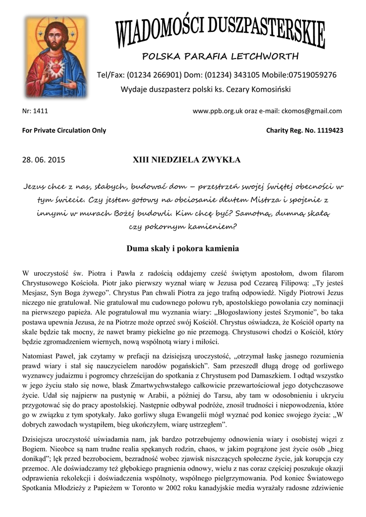POLSKA PARAFIA LETCHWORTH Tel/Fax: (01234 266901) Dom: (01234) 343105 Mobile:07519059276 Wydaje duszpasterz polski ks. Cezary Komosiński Nr: 1411 www.ppb.org.uk oraz e-mail: [email protected] For Private Circulation Only 28. 06. 2015 Charity Reg. No. 1119423 XIII NIEDZIELA ZWYKŁA Jezus chce z nas, słabych, budować dom – przestrzeń swojej świętej obecności w tym świecie. Czy jestem gotowy na obciosanie dłutem Mistrza i spojenie z innymi w murach Bożej budowli. Kim chcę być? Samotną, dumną skałą czy pokornym kamieniem? Duma skały i pokora kamienia W uroczystość św. Piotra i Pawła z radością oddajemy cześć świętym apostołom, dwom filarom Chrystusowego Kościoła. Piotr jako pierwszy wyznał wiarę w Jezusa pod Cezareą Filipową: „Ty jesteś Mesjasz, Syn Boga żywego”. Chrystus Pan chwali Piotra za jego trafną odpowiedź. Nigdy Piotrowi Jezus niczego nie gratulował. Nie gratulował mu cudownego połowu ryb, apostolskiego powołania czy nominacji na pierwszego papieża. Ale pogratulował mu wyznania wiary: „Błogosławiony jesteś Szymonie”, bo taka postawa upewnia Jezusa, że na Piotrze może oprzeć swój Kościół. Chrystus oświadcza, że Kościół oparty na skale będzie tak mocny, że nawet bramy piekielne go nie przemogą. Chrystusowi chodzi o Kościół, który będzie zgromadzeniem wiernych, nową wspólnotą wiary i miłości. Natomiast Paweł, jak czytamy w prefacji na dzisiejszą uroczystość, „otrzymał łaskę jasnego rozumienia prawd wiary i stał się nauczycielem narodów pogańskich”. Sam przeszedł długą drogę od gorliwego wyznawcy judaizmu i pogromcy chrześcijan do spotkania z Chrystusem pod Damaszkiem. I odtąd wszystko w jego życiu stało się nowe, blask Zmartwychwstałego całkowicie przewartościował jego dotychczasowe życie. Udał się najpierw na pustynię w Arabii, a później do Tarsu, aby tam w odosobnieniu i ukryciu przygotować się do pracy apostolskiej. Następnie odbywał podróże, znosił trudności i niepowodzenia, które go w związku z tym spotykały. Jako gorliwy sługa Ewangelii mógł wyznać pod koniec swojego życia: „W dobrych zawodach wystąpiłem, bieg ukończyłem, wiarę ustrzegłem”. Dzisiejsza uroczystość uświadamia nam, jak bardzo potrzebujemy odnowienia wiary i osobistej więzi z Bogiem. Nieobce są nam trudne realia spękanych rodzin, chaos, w jakim pogrążone jest życie osób „bieg donikąd”; lęk przed bezrobociem, bezradność wobec zjawisk niszczących społeczne życie, jak korupcja czy przemoc. Ale doświadczamy też głębokiego pragnienia odnowy, wielu z nas coraz częściej poszukuje okazji odprawienia rekolekcji i doświadczenia wspólnoty, wspólnego pielgrzymowania. Pod koniec Światowego Spotkania Młodzieży z Papieżem w Toronto w 2002 roku kanadyjskie media wyrażały radosne zdziwienie bardzo wielu osób i całych środowisk, że jest możliwe życie sensowniejsze, bogatsze w treści, niż im się wydawało jeszcze kilkanaście dni wcześniej. Chrystus potrafił budować Kościół na różnorodności swoich uczniów. Patrząc na drogę wiary św. Piotra i dochodzenie do bliskości z Panem w życiu św. Pawła możemy stwierdzić, że Bóg wciąż gromadzi swoich wyznawców w jeden Kościół. I wciąż wybiera do głoszenia Ewangelii i posyła w świat nowe zastępy świadków, wśród których jest również miejsce dla każdego z nas. Pytanie o naszą przynależność do Kościoła, o naszą chrześcijańską tożsamość, to pytanie o naszą wiarę w Chrystusa i miłość do Boga i bliźnich. Dziś chcemy razem z Piotrem wyznać: „Ty jesteś Mesjasz, Syn Boga żywego”. I powtórzyć za św. Pawłem: „Jemu chwała na wieki wieków. Amen”. PORZĄDEK MSZY ŚWIĘTYCH 13.00. UROCZYSTOŚĆ ŚW. APOSTOŁÓW PIOTRA I PAWŁA Za śp. Aleksandra i Emilię, Rodziców Poleszuk oraz rodzeństwo, śp. Kazimierza Borowskiego i Rodziców (int. p. E. Borowskiej) WTOREK 30.06.15 18.30. O zdrowie i Boże błog. dla ks. Sebastiana Kuś (int. Siostry) NIEDZIELA 05.07.15 13.00. Za śp. Józefa Dyrdzińskiego oraz Rodziców i rodzeństwo i śp. Marię Dąbek (int. p. Heleny Dyrdzińskiej) WTOREK 07.07.15 18.30. O Boże błog. i opiekę Matki Bożej dla Tobiasza w rocznicę urodzin. NIEDZIELA 28.06.15 XIV NIEDZIELA ZWYKŁA OGŁOSZENIA PARAFIALNE 1. Uroczystości i wspomnienia liturgiczne: Poniedziałek- 29.06- Świętych Apostołów Piotra i Pawław Anglii i Walii Uroczystość przeniesiona na 28.06. Piątek- 03.07- Św. Tomasza Apostoła- Święto Poniedziałek- 06.07- Bł. Marii Teresy Ledóchowskiej- wspomnienie Sobota- 11.07- Św. Benedykta opata, patrona Europy- Święto 2. W każdy wtorek zapraszamy na Mszę Św. o godz. 18.30. Po Mszy Nowenna do Matki Bożej Nieustającej Pomocy. W miesiącu czerwcu wraz z Litanią do N. S. P. Jezusa. Zapraszamy. 3. Okazja do spowiedzi św. w każdą niedzielę i wtorek przed Mszą św. oraz w razie potrzeby po Mszy świętej 4. Zebrane ofiary za miesiąc maj, to £ 481,44 minus £ 208 za wynajęcie kościoła. Gift Aid za maj - £ 317,5.Bóg zapłać za każde wsparcie. 5. W dniu dzisiejszym dodatkowa kolekta- Świętopietrze. Ofiary zebrane na całym świecie przeznaczone są na charytatywną działalność Ojca Świętego. 6. W poniedziałek, 22.06, w wieku 89 lat zmarł nasz parafianin, Pan Marcin Majdan. Uroczystości pogrzebowe rozpoczną się o godz. 13.45, w środę 01.07. w kościele St Hugh of L. w Letchworth. Dobry Jezu a nasz Panie, daj mu wieczne spoczywanie. SKARB W Krakowie żył ubogi żebrak. Bieda była stałym gościem w jego domu. Zimą w maleńkim mieszkaniu panował chłód, gdyż nie miał on czym napalić w piecu. Pewnej nocy żebrak miał sen o skarbie, który jest ukryty w Pradze pod mostem. Sen tak przemówił do jego wyobraźni, że postanowił wyruszyć na jego poszukiwanie. Po przybyciu do Pragi zobaczył most ze swego snu. Rozpoczął poszukiwania. Obcym przybyszem zainteresowali się policjanci.