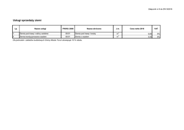Załącznik nr 6 do ZW 8/2016 Usługi sprzedaży ziemi Lp. Nazwa usługi Nazwa skrócona PKWiU 2008 J.m. VAT Cena netto 2016 1 Ziemia pod trawę i rośliny ozdobne 08.91 Ziemia pod trawę i kwiaty m3 9,80 8% 2 Ziemia kondycjonowana osadem 08.91 Ziemia z osadem m3 5,50 8% Dla jednostek i zakładów budżetowych Gminy Miasta Toruń obowiązuje 16 % rabatu.