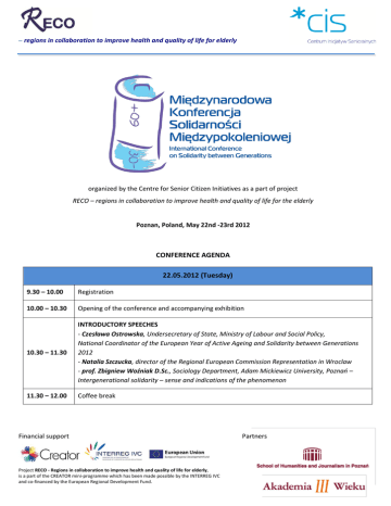 – regions in collaboration to improve health and quality of life for elderly organized by the Centre for Senior Citizen Initiatives as a part of project RECO – regions in collaboration to improve health and quality of life for the elderly Poznan, Poland, May 22nd -23rd 2012 CONFERENCE AGENDA 22.05.2012 (Tuesday) 9.30 – 10.00 Registration 10.00 – 10.30 Opening of the conference and accompanying exhibition 10.30 – 11.30 INTRODUCTORY SPEECHES - Czesława Ostrowska, Undersecretary of State, Ministry of Labour and Social Policy, National Coordinator of the European Year of Active Ageing and Solidarity between Generations 2012 - Natalia Szczucka, director of the Regional European Commission Representation in Wroclaw - prof. Zbigniew Woźniak D.Sc., Sociology Department, Adam Mickiewicz University, Poznań – Intergenerational solidarity – sense and indications of the phenomenon 11.30 – 12.00 Coffee break Financial support Project RECO - Regions in collaboration to improve health and quality of life for elderly, is a part of the CREATOR mini-programme which has been made possible by the INTERREG IVC and co-financed by the European Regional Development Fund. Partners – regions in collaboration to improve health and quality of life for elderly 12.00 – 13.30 PANEL DISCUSSION I - Intergenerational solidarity and the elderly care Introducing and moderating: Andrzej Stogowski Ph.D., Regional Center of Social Policy in Poznań, Polish Society of Gerontology Themes: - the role of families in the care system - home care volunteering - intergenerational homesharing - aging population and care services Panelists: - Mieczysław Augustyn, Senator of the Republic of Poland, chairman of the Family and Social Policy Committee - Typhaine oraz Alain de Penfentenyo, ensemble2generations, Paris, member of Homeshare International - Paivi Sanerma EdD, Senior Lecturer, HAMK University of Applied Sciences, Hameenlinna, Finland - prof. Zbigniew Woźniak D.Sc., Sociology Department, Adam Mickiewicz University, Poznań - Jean Paul de Rudder and Agnieszka Basińska, International Cooperation CM, Belgium/The Association of Mutual Help „Flandria”, Poznań 13.30 – 14.30 Lunch 14.30 – 16.00 PANEL DISCUSSION II - Intergenerational solidarity, economic development and the labor market Introducing and moderating: prof. Józef Orczyk D.Sc., Poznań University of Economics, president of the Committee on Labor and Social Policy Sciences of the Polish Academy of Sciences Themes: - mentoring - intergenerational solidarity and the economic growth - challenges for the labor market related to increasing retirement age Panelists: - Elwira Gross-Gołacka Ph.D. , Director of Department of Economic Analyses and Forecasts, Ministry of Labour and Social Policy - Małgorzata Domagała, Fundacja Promocji Inicjatyw Społecznych POLPROM, Warsaw, project „Mature Enterprise Incubator” - Monika Zembrzycka, Regional Center of Social Policy in Poznań, ENSURE project - Giovanni Bongioanni, Italian Senior Expert Service, Torino, Italy 16.00 Closing of the first day Financial support Project RECO - Regions in collaboration to improve health and quality of life for elderly, is a part of the CREATOR mini-programme which has been made possible by the INTERREG IVC and co-financed by the European Regional Development Fund. Partners – regions in collaboration to improve health and quality of life for elderly 23.05.2012 (Wednesday) 10.00 – 11.30 PANEL DISCUSSION III – Intergenerational solidarity and social activity of the elderly Introducing and moderating: Beata Tokarz-Kamińska, “Seniors in action”, the Association of Creative Initiatives „ę”, Warsaw Themes: - review of intergenerational projects - intergenerational solidarity and creating a culture - impact on the local community Panelists: - Bernard Żołyniak, The Center of Reasearch and Sociocultural Activities (CBDeSK), Adam Mickiewicz University Foundation - Monika Szelągiewicz, director of the Centre for Senior Citizens Initiatives, Poznań - Paweł Cebula and Halina Pisarek, Park Academy of Volunteering, Silesia Park, Chorzów - Marie Lundin, Cultural Activities for Senior Citizens, Culture and Health project, Umea, Sweden - Maria Grabiec-Zybura, Stowarzyszenie Żywa, „Equal ladies” project, Kalisz 11.30 – 12.00 Coffee break 12.00 – 13.30 PARALLEL WORKSHOPS Aging - needs, expectations and stereotypes – Edyta Rosenkiewicz, SIC! Foundation Youth - needs, expectations and stereotypes – Małgorzata Łuczak-Sibilska, psychologist, speech therapist, lecturer at the Academy of the Third Age What, where, how and why we buy? Consumer behavior of generations - Agnieszka Figiel Ph.D., Sociology Department, Adam Mickiewicz University, Poznań 13.30 – 14.30 Lunch 14.30 – 16.00 CONCLUDING SESSION - Intergenerational debate Moderating: Wanda Wasilewska, Journalist of the Polish Radio 16.00 Closing of the conference Financial support Project RECO - Regions in collaboration to improve health and quality of life for elderly, is a part of the CREATOR mini-programme which has been made possible by the INTERREG IVC and co-financed by the European Regional Development Fund. Partners – regions in collaboration to improve health and quality of life for elderly Photographic exhibition accompanying the conference: "You’ll be a senior one day" - social action organized by the Park Academy of Volunteering in Silesia Park, Chorzów The conference venue: The School of Humanities and Journalism (Wyższa Szkoła Nauk Humanistycznych i Dziennikarstwa) Street: gen. Tadeusza Kutrzeby 10 Floor 3 Lecture hall - room 340 The conference under the honorary patronage of the Marshal of the Wielkopolska Region and the Mayor of the City of Poznań The conference was entered into the National Action Plan for the European Year of Active Ageing and Solidarity between Generations in Poland in 2012. Media partners Financial support Project RECO - Regions in collaboration to improve