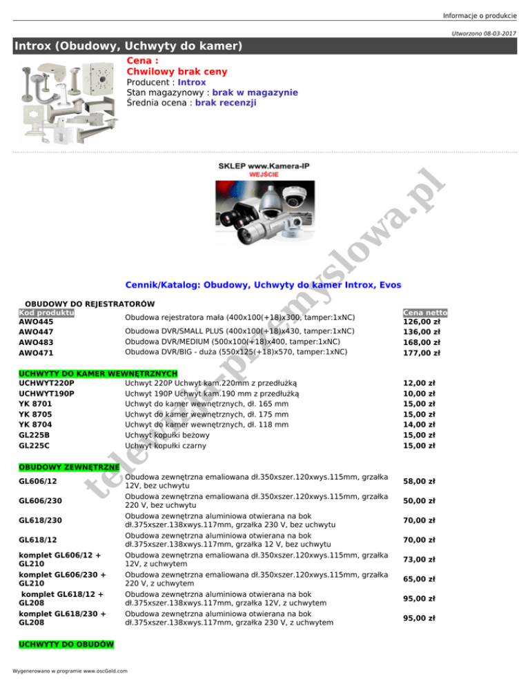 Informacje o produkcie Utworzono 08-03-2017 Introx (Obudowy, Uchwyty do kamer) Cena : Chwilowy brak ceny ze m ys lo w a. pl Producent : Introx Stan magazynowy : brak w magazynie Średnia ocena : brak recenzji Cennik/Katalog: Obudowy, Uchwyty do kamer Introx, Evos Cena netto 126,00 zł 136,00 zł 168,00 zł 177,00 zł UCHWYTY DO KAMER WEWNĘTRZNYCH UCHWYT220P Uchwyt 220P Uchwyt kam.220mm z przedłużką UCHWYT190P Uchwyt 190P Uchwyt kam.190 mm z przedłużką YK 8701 Uchwyt do kamer wewnętrznych, dł. 165 mm YK 8705 Uchwyt do kamer wewnętrznych, dł. 175 mm YK 8704 Uchwyt do kamer wewnętrznych, dł. 118 mm GL225B Uchwyt kopułki beżowy GL225C Uchwyt kopułki czarny 12,00 10,00 15,00 15,00 14,00 15,00 15,00 le w iz ja -p r OBUDOWY DO REJESTRATORÓW Kod produktu Obudowa rejestratora mała (400x100(+18)x300, tamper:1xNC) AWO445 Obudowa DVR/SMALL PLUS (400x100(+18)x430, tamper:1xNC) AWO447 Obudowa DVR/MEDIUM (500x100(+18)x400, tamper:1xNC) AWO483 Obudowa DVR/BIG - duża (550x125(+18)x570, tamper:1xNC) AWO471 zł zł zł zł zł zł zł GL606/12 GL606/230 te OBUDOWY ZEWNĘTRZNE GL618/230 GL618/12 komplet GL606/12 + GL210 komplet GL606/230 + GL210 komplet GL618/12 + GL208 komplet GL618/230 + GL208 Obudowa zewnętrzna emaliowana dł.350xszer.120xwys.115mm, grzałka 12V, bez uchwytu Obudowa zewnętrzna emaliowana dł.350xszer.120xwys.115mm, grzałka 220 V, bez uchwytu Obudowa zewnętrzna aluminiowa otwierana na bok dł.375xszer.138xwys.117mm, grzałka 230 V, bez uchwytu Obudowa zewnętrzna aluminiowa otwierana na bok dł.375xszer.138xwys.117mm, grzałka 12 V, bez uchwytu Obudowa zewnętrzna emaliowana dł.350xszer.120xwys.115mm, grzałka 12V, z uchwytem Obudowa zewnętrzna emaliowana dł.350xszer.120xwys.115mm, grzałka 220 V, z uchwytem Obudowa zewnętrzna aluminiowa otwierana na bok dł.375xszer.138xwys.117mm, grzałka 12V, z uchwytem Obudowa zewnętrzna aluminiowa otwierana na bok dł.375xszer.138xwys.117mm, grzałka 230 V, z uchwytem UCHWYTY DO OBUDÓW Wygenerowano w programie www.oscGold.com 58,00 zł 50,00 zł 70,00 zł 70,00 zł 73,00 zł 65,00 zł 95,00 zł 95,00 zł L-1100/40x25 L-1100/40x40 Uchwyt do obudowy zewnętrznej emaliowanej GL-606 lub GL-607, obciąż. 10kg. Uchwyt do obudowy zewnętrznej aluminiowej GL-618 z przepustem kablowym Uniwersalny uchwyt do obudów zewnętrznych, emaliowany dł. 60 cm Uniwersalny uchwyt do obudów zewnętrznych, emaliowany dł. 80 cm Uniwersalny uchwyt do obudów zewnętrznych, emaliowany długość regulowana 100 cm - 130 cm Uniwersalny uchwyt do obudów zewnętrznych, Uniwersalny uchwyt do obudów zewnętrznych, GRZAŁKI DO OBUDÓW GRZAŁKA 12/24V GRZAŁKA 220V Grzałka 12 V/24V do obudowy GL-601 Grzałka 220 V do obudowy GL-601 GL210 GL208 L-600 L-800 31,00 zł 112,00 zł 116,00 zł 130,00 zł 92,00 zł 92,00 zł 20,00 zł 20,00 zł te le w iz ja -p r ze m ys lo w zadzwoń i zapytaj o rabat (22 672-36-36) (505-130-571) a. pl L-1000/1300 20,00 zł