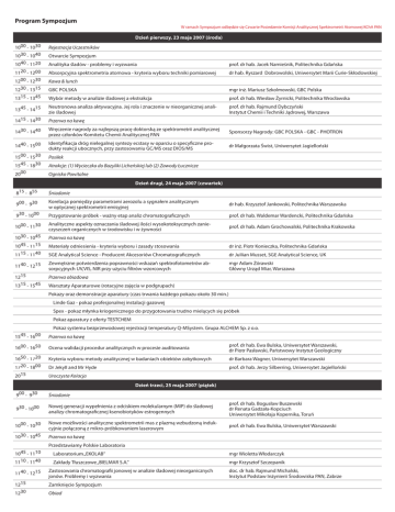 Program Sympozjum W ramach Sympozjum odbędzie się Czwarte Posiedzenie Komisji Analitycznej Spektrometrii Atomowej KChA PAN Dzień pierwszy, 23 maja 2007 (środa) 1000 - 1030 1030 - 1040 Rejestracja Uczestników Otwarcie Sympozjum 1040 - 1120 1120 - 1200 Analityka śladów - problemy i wyzwania prof. dr hab. Jacek Namieśnik, Politechnika Gdańska Absorpcyjna spektrometria atomowa - kryteria wyboru techniki pomiarowej dr hab. Ryszard Dobrowolski, Uniwersytet Marii Curie-Skłodowskiej 1200 - 1230 1230 - 1315 Kawa & lunch GBC POLSKA mgr inż. Mariusz Szkolmowski, GBC Polska 1315 - 1345 Wybór metody w analizie śladowej a ekstrakcja prof. dr hab. Wiesław Żyrnicki, Politechnika Wrocławska 1345 - 1415 Neutronowa analiza aktywacyjna. Jej rola i znaczenie w nieorganicznej analizie śladowej prof. dr hab. Rajmund Dybczyński Instytut Chemii i Techniki Jądrowej, Warszawa 1415 - 1430 Przerwa na kawę 1430 - 1440 Wręczenie nagrody za najlepszą pracę doktorską ze spektrometrii analitycznej przez członków Komitetu Chemii Analitycznej PAN Sponsorzy Nagrody: GBC POLSKA - GBC - PHOTRON 1440 - 1500 Identyfikacja dróg nielegalnej syntezy ecstasy w oparciu o specyficzne produkty reakcji ubocznych, przy zastosowaniu GC/MS oraz DIOS/MS dr Małgorzata Świst, Uniwersytet Jagielloński 1500 - 1530 1545 - 1830 Posiłek 2000 Ognisko Powitalne Atrakcje: (1) Wycieczka do Bazyliki Licheńskiej lub (2) Zawody Łucznicze Dzień drugi, 24 maja 2007 (czwartek) 815 - 855 Śniadanie 900 - 930 Korelacja pomiędzy parametrami aerozolu a sygnałem analitycznym w optycznej spektrometrii emisyjnej dr hab. Krzysztof Jankowski, Politechnika Warszawska 930 - 1000 Przygotowanie próbek - ważny etap analiz chromatograficznych prof. dr hab. Waldemar Wardencki, Politechnika Gdańska 1000 - 1130 Analityczne aspekty oznaczania śladowej ilości wysokotoksycznych zanieczyszczeń organicznych w środowisku i w żywności prof. dr hab. Adam Grochowalski, Politechnika Krakowska 1030 - 1045 1045 - 1115 Przerwa na kawę Materiały odniesienia - kryteria wyboru i zasady stosowania dr inż. Piotr Konieczka, Politechnika Gdańska 1115 - 1140 SGE Analytical Science - Producent Akcesoriów Chromatograficznych dr Jullian Musset, SGE Analytical Science, UK 1140 - 1215 Zewnętrzne potwierdzenia poprawności wskazań spektrofotometrów absorpcyjnych UV,VIS, NIR przy użyciu filtrów wzorcowych mgr Adam Żórawski Główny Urząd Miar, Warszawa 1215 1315 - 1545 Przerwa obiadowa Warsztaty Aparaturowe (rotacyjne zajęcia w podgrupach) Pokazy oraz demonstracje aparatury (czas trwania każdego pokazu około 30 min.) Linde Gaz - pokaz profesjonalnej instalacji gazowej Spex - pokaz młynka kriogenicznego do przygotowania trudno mielących się próbek Pokaz aparatury z oferty TESTCHEM Pokaz systemu bezprzewodowej rejestracji temperatury Q-MSystem. Grupa ALCHEM Sp. z o.o. 1545 - 1600 Przerwa na kawę 1600 - 1650 Ocena walidacji procedur analitycznych w procesie auditowania prof. dr hab. Ewa Bulska, Uniwersytet Warszawski, dr Piotr Pasławski, Państwowy Instytut Geologiczny 1650 - 1720 1720 - 1800 Kryteria wyboru metody analitycznej w badaniach obiektów zabytkowych dr Barbara Wagner, Uniwersytet Warszawski Dr Jekyll and Mr Hyde prof. dr hab. Jerzy Silberring, Uniwersytet Jagielloński 2015 Uroczysta Kolacja Dzień trzeci, 25 maja 2007 (piątek) 900 - 930 Śniadanie 930 - 1000 Nowej generacji wypełnienia z odciskiem molekularnym (MIP) do śladowej analizy chromatograficznej ksenobiotyków estrogennych prof. dr hab. Bogusław Buszewski dr Renata Gadzała-Kopciuch Uniwersytet Mikołaja Kopernika, Toruń 1000 - 1030 Nowe możliwości analityczne spektrometrii mas z plazmą wzbudzoną indukcyjnie połączoną z mikro-próbkowaniem laserowym prof. dr hab. Ewa Bulska, Uniwersytet Warszawski 1030 - 1045 Przerwa na kawę Przedstawiamy Polskie Laboratoria 1045 - 1110 1110 - 1140 Laboratorium „EKOLAB” mgr Wioletta Włodarczyk Zakłady Tłuszczowe „BIELMAR S.A.” mgr Krzysztof Szczepanik 1140 - 1215 Zastosowania chromatografii jonowej w analizie śladowej nieorganicznych jonów. Problemy i wyzwania 1215 1230 Zamknięcie Sympozjum Obiad doc. dr hab. Rajmund Michalski, Instytut Podstaw Inżynierii Środowiska PAN, Zabrze