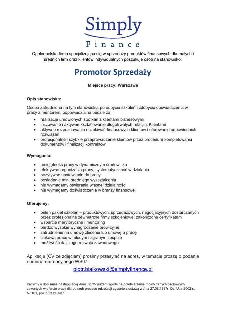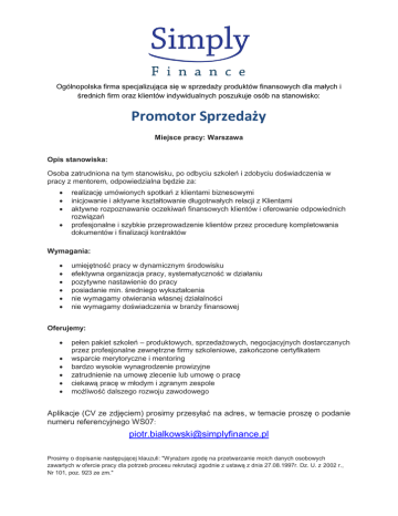 Ogólnopolska firma specjalizująca się w sprzedaży produktów finansowych dla małych i średnich firm oraz klientów indywidualnych poszukuje osób na stanowisko: Promotor Sprzedaży Miejsce pracy: Warszawa Opis stanowiska: Osoba zatrudniona na tym stanowisku, po odbyciu szkoleń i zdobyciu doświadczenia w pracy z mentorem, odpowiedzialna będzie za: realizację umówionych spotkań z klientami biznesowymi inicjowanie i aktywne kształtowanie długotrwałych relacji z Klientami aktywne rozpoznawanie oczekiwań finansowych klientów i oferowanie odpowiednich rozwiązań profesjonalne i szybkie przeprowadzenie klientów przez procedurę kompletowania dokumentów i finalizacji kontraktów Wymagania: umiejętność pracy w dynamicznym środowisku efektywna organizacja pracy, systematyczność w działaniu pozytywne nastawienie do pracy posiadanie min. średniego wykształcenia nie wymagamy otwierania własnej działalności nie wymagamy doświadczenia w branży finansowej Oferujemy: pełen pakiet szkoleń – produktowych, sprzedażowych, negocjacyjnych dostarczanych przez profesjonalne zewnętrzne firmy szkoleniowe, zakończone certyfikatem wsparcie merytoryczne i mentoring bardzo wysokie wynagrodzenie prowizyjne zatrudnienie na umowę zlecenie lub umowę o pracę ciekawą pracę w młodym i zgranym zespole możliwość dalszego rozwoju zawodowego Aplikacje (CV ze zdjęciem) prosimy przesyłać na adres, w temacie proszę o podanie numeru referencyjnego WS07: [email protected] Prosimy o dopisanie następującej klauzuli: "Wyrażam zgodę na przetwarzanie moich danych osobowych zawartych w ofercie pracy dla potrzeb procesu rekrutacji zgodnie z ustawą z dnia 27.08.1997r. Dz. U. z 2002 r., Nr 101, poz. 923 ze zm."