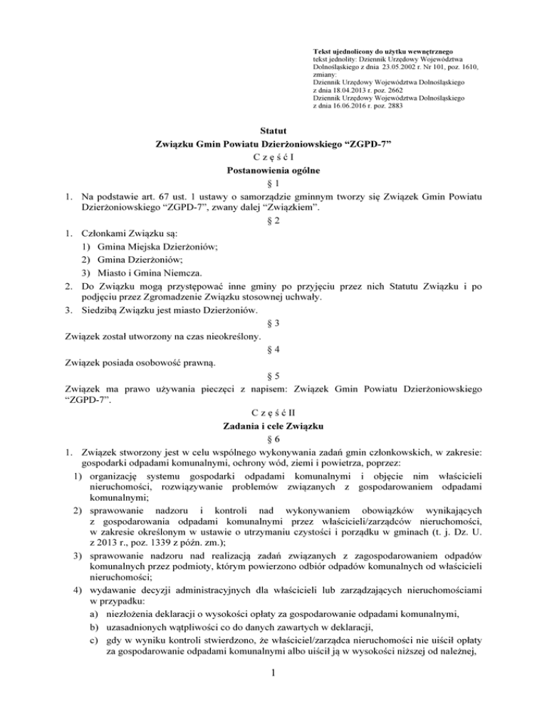 Tekst ujednolicony do użytku wewnętrznego tekst jednolity: Dziennik Urzędowy Województwa Dolnośląskiego z dnia 23.05.2002 r. Nr 101, poz. 1610, zmiany: Dziennik Urzędowy Województwa Dolnośląskiego z dnia 18.04.2013 r. poz. 2662 Dziennik Urzędowy Województwa Dolnośląskiego z dnia 16.06.2016 r. poz. 2883 Statut Związku Gmin Powiatu Dzierżoniowskiego “ZGPD-7” CzęśćI Postanowienia ogólne §1 1. Na podstawie art. 67 ust. 1 ustawy o samorządzie gminnym tworzy się Związek Gmin Powiatu Dzierżoniowskiego “ZGPD-7”, zwany dalej “Związkiem”. §2 1. Członkami Związku są: 1) Gmina Miejska Dzierżoniów; 2) Gmina Dzierżoniów; 3) Miasto i Gmina Niemcza. 2. Do Związku mogą przystępować inne gminy po przyjęciu przez nich Statutu Związku i po podjęciu przez Zgromadzenie Związku stosownej uchwały. 3. Siedzibą Związku jest miasto Dzierżoniów. §3 Związek został utworzony na czas nieokreślony. §4 Związek posiada osobowość prawną. §5 Związek ma prawo używania pieczęci z napisem: Związek Gmin Powiatu Dzierżoniowskiego “ZGPD-7”. C z ę ś ć II Zadania i cele Związku §6 1. Związek stworzony jest w celu wspólnego wykonywania zadań gmin członkowskich, w zakresie: gospodarki odpadami komunalnymi, ochrony wód, ziemi i powietrza, poprzez: 1) organizację systemu gospodarki odpadami komunalnymi i objęcie nim właścicieli nieruchomości, rozwiązywanie problemów związanych z gospodarowaniem odpadami komunalnymi; 2) sprawowanie nadzoru i kontroli nad wykonywaniem obowiązków wynikających z gospodarowania odpadami komunalnymi przez właścicieli/zarządców nieruchomości, w zakresie określonym w ustawie o utrzymaniu czystości i porządku w gminach (t. j. Dz. U. z 2013 r., poz. 1339 z późn. zm.); 3) sprawowanie nadzoru nad realizacją zadań związanych z zagospodarowaniem odpadów komunalnych przez podmioty, którym powierzono odbiór odpadów komunalnych od właścicieli nieruchomości; 4) wydawanie decyzji administracyjnych dla właścicieli lub zarządzających nieruchomościami w przypadku: a) niezłożenia deklaracji o wysokości opłaty za gospodarowanie odpadami komunalnymi, b) uzasadnionych wątpliwości co do danych zawartych w deklaracji, c) gdy w wyniku kontroli stwierdzono, że właściciel/zarządca nieruchomości nie uiścił opłaty za gospodarowanie odpadami komunalnymi albo uiścił ją w wysokości niższej od należnej, 1 d) nie posiadania umów na odbiór odpadów komunalnych przez właścicieli nieruchomości, którzy nie są obowiązani do ponoszenia opłat za gospodarowanie odpadami komunalnymi na rzecz Związku; 5) tworzenie możliwości do zagospodarowywania, w ramach działań Związku, także innych niż niebezpieczne odpadów poprodukcyjnych, powstających w wyniku prowadzonej działalności gospodarczej na obszarze gmin zrzeszonych w Związku; 6) przyjmowanie sprawozdań sporządzonych przez podmioty prowadzące działalność w zakresie odbierania odpadów komunalnych od właścicieli nieruchomości; 7) sporządzenia rocznych sprawozdań z realizacji zadań z zakresu gospodarowania odpadami komunalnymi; 8) organizacja i nadzór nad systemem selektywnego zbierania odpadów komunalnych, w tym tworzenie punktów selektywnego zbierania odpadów komunalnych i ich zagospodarowanie; 9) prowadzenie rejestru działalności regulowanej w zakresie odbierania odpadów komunalnych od właścicieli nieruchomości, zgodnie z ustawą o utrzymaniu czystości i porządku w gminach (t.j. Dz. U. z 2013 r., poz. 1339 z późn. zm.); 10) zapewnienie osiągnięcia odpowiednich poziomów recyklingu, przygotowania do ponownego użycia i odzysku innymi metodami oraz ograniczenia masy odpadów komunalnych ulegających biodegradacji przekazywanych do składowania oraz nadzór nad tą działalnością; 11) przygotowanie i prowadzenie strony internetowej, na której udostępniane będą informacje o: a) podmiotach odbierających odpady komunalne od właścicieli nieruchomości z terenu poszczególnych gmin zrzeszonych w Związku, b) miejscach zagospodarowania zmieszanych odpadów komunalnych, odpadów zielonych oraz pozostałości z sortowania odpadów komunalnych przeznaczonych do składowania, c) osiągniętych poziomach recyklingu, przygotowaniu do ponownego użycia i odzysku innymi metodami oraz o ograniczeniach masy odpadów komunalnych ulegających biodegradacji, przekazywanych do składowania, d) adresach i godzinach działalności punktów selektywnego zbierania odpadów komunalnych oraz punktów zbierających zużyty sprzęt elektryczny i elektroniczny, pochodzący z gospodarstw domowych; 12) przygotowywanie i przedstawianie gminom zrzeszonym w związku corocznej analizy stanu gospodarki odpadami komunalnymi, w celu weryfikacji możliwości technicznych i organizacyjnych związku w zakresie gospodarowania odpadami komunalnymi, w tym: a) możliwości przetwarzania zmieszanych odpadów komunalnych, odpadów zielonych oraz pozostałości z sortowania odpadów komunalnych przeznaczonych do składowania, b) potrzeb inwestycyjnych związanych z gospodarowaniem odpadami komunalnymi, c) kosztów poniesionych w związku z odbieraniem, odzyskiem, recyklingiem i unieszkodliwianiem odpadów komunalnych, d) liczby mieszkańców na terenie gmin zrzeszonych w związku, e) ilości odpadów komunalnych wytwarzanych na terenie gminy, w tym ilości zmieszanych odpadów komunalnych, odpadów zielonych oraz pozostałości z sortowania odpadów komunalnych przeznaczonych do składowania odbieranych z terenu gminy; 13) stanowienie uchwał, w tym aktów prawa miejscowego w zakresie gospodarowania odpadami komunalnymi; 14) zorganizowanie i prowadzenie systemu zbierania opłat z tytułu wytwarzania odpadów komunalnych wraz z windykacją zaległych opłat od właścicieli lub zarządzających nieruchomościami, na których wytwarzane są odpady komunalne; 15) przygotowywanie i prowadzenie postępowań przetargowych, mających na celu wyłonienie 