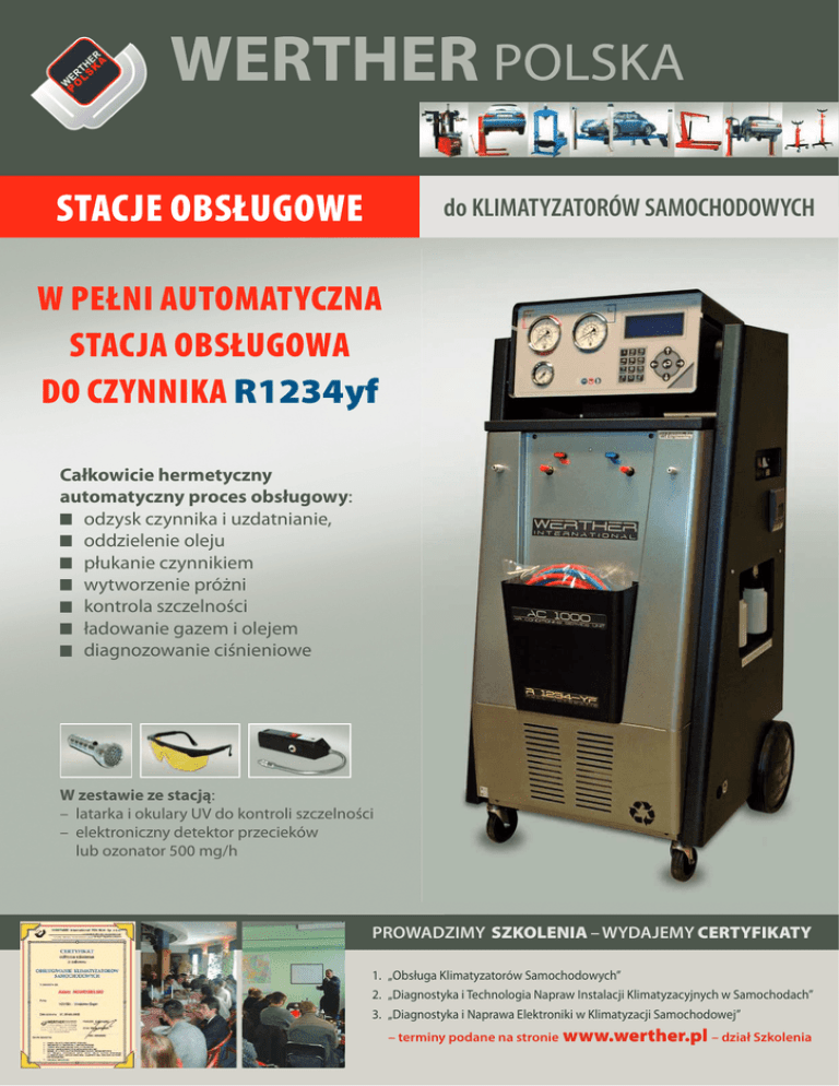 STACJE OBSŁUGOWE do KLIMATYZATORÓW SAMOCHODOWYCH W PEŁNI AUTOMATYCZNA STACJA OBSŁUGOWA DO CZYNNIKA R1234yf Całkowicie hermetyczny automatyczny proces obsługowy: odzysk czynnika i uzdatnianie, oddzielenie oleju płukanie czynnikiem wytworzenie próżni kontrola szczelności ładowanie gazem i olejem diagnozowanie ciśnieniowe W zestawie ze stacją: – latarka i okulary UV do kontroli szczelności – elektroniczny detektor przecieków lub ozonator 500 mg/h PROWADZIMY SZKOLENIA – WYDAJEMY CERTYFIKATY 1. „Obsługa Klimatyzatorów Samochodowych” 2. „Diagnostyka i Technologia Napraw Instalacji Klimatyzacyjnych w Samochodach” 3. „Diagnostyka i Naprawa Elektroniki w Klimatyzacji Samochodowej” – terminy podane na stronie www.werther.pl – dział Szkolenia WERTHER AC1000 Urządzenie AC1000 jest specjalnie skonstruowaną stacją do obsługi samochodowych instalacji klimatyzacyjnych stosujących czynnik R1234yf Spełnia wszystkie wymagania prawne, bezpieczeństwa i efektywności Wyświetlacz LCD 123×42 mm z instrukcjami w języku polskim W pełni zautomatyzowana praca Baza danych pozwala na szybkie i łatwe ustawienie parametrów obsługowych Aktualizacja bazy danych przez port USB Drukarka termiczna w standardzie Automatyczne sprawdzenie szczelności Funkcja próżni ustawiona na 30 minut może być zmieniana w przedziale 10-250 min Elektroniczna waga czynnika chłodniczego, odzyskanego oleju, dozowanego oleju 24 bitowe przetworniki analogowo-cyfrowe dla maksymalnej dokładności działania 300 cm przewody przyłączeniowe Funkcja płukania czynnikiem do usuwania pozostałości oleju i innych płynów Pamięć wykonanych cykli z możliwością transmisji danych przez port USB Oprogramowanie zarządzające umożliwia operatorowi wybór dwóch różnych trybów: Automatycznego i Ręcznego Tryb automatyczny wykorzystuje bazę danych z informacją o ilości czynnika do napełnienia oraz ilości oleju – informacja może być okresowo aktualizowana, gdy nowe modele samochodów pojawiają się na rynku Tryb ręczny pozwala na wybór krokowy poszczególnych operacji i umożliwia indywidualny dobór parametrów DANE TECHNICZNE: czynnik chłodniczy R1234yf duży zbiornik 22 kg pompa próżniowa 130 l/min. ustawianie czasu próżni 10-255 minut szybki odzysk 300 g/min. funkcja płukania czynnikiem dokładne 24-bitowe wagi baza danych pamięć usług drukarka długie przewody 300 cm dostępny port USB do transmisji danych duży wyświetlacz 132×42 | INTUICYJNA obsługa | PROSTE komunikaty | PRECYZYJNE manometry | CZYTELNE oznakowanie | ZŁĄCZE USB i drukarka | ŁATWY DOSTĘP do filtrów i oleju pompy próżniowej | SAMODZIELNA wymiana | SPRAWDZONE podzespoły | NOWOCZESNA konstrukcja | DŁUGA I NIEZAWODNA praca IDENTYFIKATOR CZYNNIKA CHŁODNICZEGO DEGA 05 DANE TECHNICZNE: – zakres pomiarowy: 0÷20 000 ppm – progi czułości: 10, 20 ppm – typ czujnika: półprzewodnikowy – wymiary: 225×125×57 mm – masa: 0,6 kg – zasilanie: 230V Urządzenie do wykrywania i identyfikacji czynnika chłodniczego znajdującego się w instalacji klimatyzatora samochodowego oraz w otoczeniu Standardowo podaje stężenie R1234yf Alarm optyczny i dźwiękowy 5 wyjść przekaźnikowych Sondy opcjonalne: 1) czynnik chłodniczy R134a 2) czynniki R401A, R404A, R407C, R32, R410A, R12, R22 3) propan-butan, LPG Urządzenie bezobsługowe oparte na czujnikach półprzewodnikowych Zakupiony czynnik chłodniczy może posiadać domieszki innych gazów. W samochodowej instalacji klimatyzatora może znajdować się zupełnie inny gaz niż na to wskazują złącza serwisowe. Identyfikator gazów uchroni przed uszkodzeniami stacji obsługowych i nieprawidłową pracą klimatyzacji.