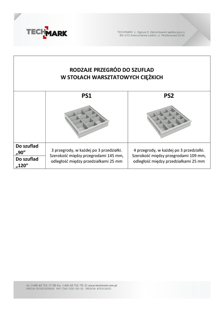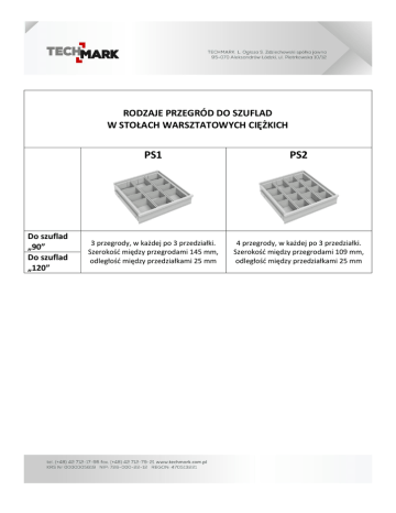 RODZAJE PRZEGRÓD DO SZUFLAD W STOŁACH WARSZTATOWYCH CIĘŻKICH Do szuflad „90” Do szuflad „120” PS1 PS2 3 przegrody, w każdej po 3 przedziałki. Szerokość między przegrodami 145 mm, odległość między przedziałkami 25 mm 4 przegrody, w każdej po 3 przedziałki. Szerokość między przegrodami 109 mm, odległość między przedziałkami 25 mm