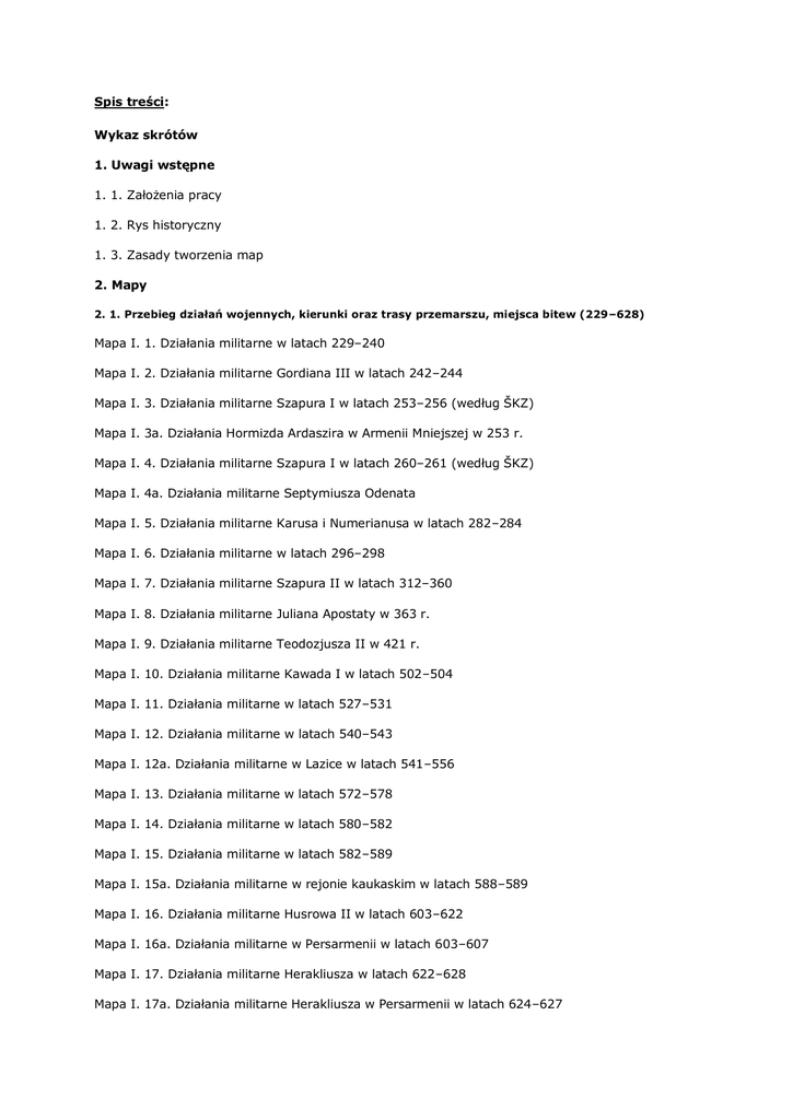 Spis treści: Wykaz skrótów 1. Uwagi wstępne 1. 1. Założenia pracy 1. 2. Rys historyczny 1. 3. Zasady tworzenia map 2. Mapy 2. 1. Przebieg działań wojennych, kierunki oraz trasy przemarszu, miejsca bitew (229–628) Mapa I. 1. Działania militarne w latach 229–240 Mapa I. 2. Działania militarne Gordiana III w latach 242–244 Mapa I. 3. Działania militarne Szapura I w latach 253–256 (według ŠKZ) Mapa I. 3a. Działania Hormizda Ardaszira w Armenii Mniejszej w 253 r. Mapa I. 4. Działania militarne Szapura I w latach 260–261 (według ŠKZ) Mapa I. 4a. Działania militarne Septymiusza Odenata Mapa I. 5. Działania militarne Karusa i Numerianusa w latach 282–284 Mapa I. 6. Działania militarne w latach 296–298 Mapa I. 7. Działania militarne Szapura II w latach 312–360 Mapa I. 8. Działania militarne Juliana Apostaty w 363 r. Mapa I. 9. Działania militarne Teodozjusza II w 421 r. Mapa I. 10. Działania militarne Kawada I w latach 502–504 Mapa I. 11. Działania militarne w latach 527–531 Mapa I. 12. Działania militarne w latach 540–543 Mapa I. 12a. Działania militarne w Lazice w latach 541–556 Mapa I. 13. Działania militarne w latach 572–578 Mapa I. 14. Działania militarne w latach 580–582 Mapa I. 15. Działania militarne w latach 582–589 Mapa I. 15a. Działania militarne w rejonie kaukaskim w latach 588–589 Mapa I. 16. Działania militarne Husrowa II w latach 603–622 Mapa I. 16a. Działania militarne w Persarmenii w latach 603–607 Mapa I. 17. Działania militarne Herakliusza w latach 622–628 Mapa I. 17a. Działania militarne Herakliusza w Persarmenii w latach 624–627 2. 2. Zmiany terytorialne ustalone w traktatach pokojowych Mapa II. 1. Zmiany terytorialne ustalone traktatem w 298 r. Mapa II. 2. Zmiany terytorialne ustalone traktatem w 363 r. Mapa II. 3. Zmiany terytorialne ustalone traktatem w 562 r. Mapa II. 4. Zmiany terytorialne ustalone traktatem w 591 r. 2. 3. Zmiany przebiegu granicy rzymsko-perskiej w latach 224–591 Mapa III. 1. Granica rzymsko-perska w 226 r. Mapa III. 2. Granica rzymsko-perska w 298 r. Mapa III. 3. Granica rzymsko-perska w 363 r. Mapa III. 4. Granica rzymsko-perska w 387 r. Mapa III. 5. Granica rzymsko-perska w 565 r. Mapa III. 6. Granica rzymsko-perska w 591 r. Mapa III. 7. Granica południowa Mapa III. 8. Strata Diocletiana Mapa III. 9. Mezopotamia i Syria, rzeźba terenu Mapa III. 10. Bliski Wschód, ukształtowanie powierzchni 3. Indeks nazw geograficznych 4. Wykaz cytowanych tekstów źródłowych 5. Aneks: listy władców rzymskich i perskich 6. Zdjęcia Mapy cz.-b.: 37 Zdjęcia cz.-b.: 6