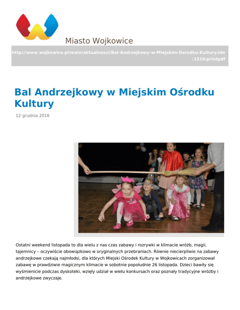 Miasto Wojkowice http://www.wojkowice.pl/main/aktualnosci/Bal-Andrzejkowy-w-Miejskim-Osrodku-Kultury/idn :1519/printpdf Bal Andrzejkowy w Miejskim Ośrodku Kultury 12 grudnia 2016 kategoria: Wojkowice Ostatni weekend listopada to dla wielu z nas czas zabawy i rozrywki w klimacie wróżb, magii, tajemnicy – oczywiście obowiązkowo w oryginalnych przebraniach. Równie niecierpliwie na zabawy andrzejkowe czekają najmłodsi, dla których Miejski Ośrodek Kultury w Wojkowicach zorganizował zabawę w prawdziwie magicznym klimacie w sobotnie popołudnie 26 listopada. Dzieci bawiły się wyśmienicie podczas dyskoteki, wzięły udział w wielu konkursach oraz poznały tradycyjne wróżby i andrzejkowe zwyczaje. Imprezę dzieciom z Wojkowic oraz okolic zapewniła Agencja Artystyczna Estrada Tyska Andrzej Misz. W trakcie prawie dwugodzinnej zabawy dzieci w fantazyjnych przebraniach tańczyły w rytm znanych przebojów takich jak np. „Kaczuszki” i to właśnie dyskoteka wprawiła wszystkich w doskonałe nastroje. Do tańca zachęcały małych uczestników dwa sympatyczne motylki, które również prowadziły całe wydarzenie, w tym konkursy, w których dzieci z dużym zaangażowaniem brały udział. Bal Andrzejkowy odbył się na sali widowiskowej MOK-u, gdzie oprócz dyskoteki przygotowano również szereg tradycyjnych andrzejkowych zabaw. Dla wielu dzieci wyjątkową atrakcją było lanie wosku, bez którego trudno wyobrazić sobie prawdziwy andrzejkowy wieczór wróżb. Z abstrakcyjnych kształtów powstałych ze stopionego wosku dzieci odczytywały znaczenie i przyszłe zdarzenia. W tak magicznej atmosferze zakończyła się tegoroczna odsłona Balu Andrzejkowego. Każdy uczestnik dostał również słodki poczęstunek. Magdalena Pasternak Bal Andrzejkowy w MOK-u 12 grudzień 2016 Bal Andrzejkowy w MOK Bal Andrzejkowy w MOK Bal Andrzejkowy w MOK Bal Andrzejkowy w MOK Bal Andrzejkowy w MOK