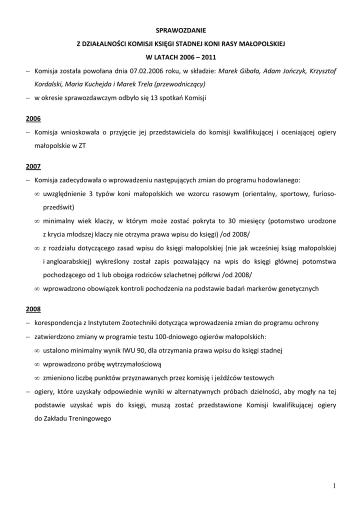 SPRAWOZDANIE Z DZIAŁALNOŚCI KOMISJI KSIĘGI STADNEJ KONI RASY MAŁOPOLSKIEJ W LATACH 2006 – 2011 − Komisja została powołana dnia 07.02.2006 roku, w składzie: Marek Gibała, Adam Jończyk, Krzysztof Kordalski, Maria Kuchejda i Marek Trela (przewodniczący) − w okresie sprawozdawczym odbyło się 13 spotkań Komisji 2006 − Komisja wnioskowała o przyjęcie jej przedstawiciela do komisji kwalifikującej i oceniającej ogiery małopolskie w ZT 2007 − Komisja zadecydowała o wprowadzeniu następujących zmian do programu hodowlanego: • uwzględnienie 3 typów koni małopolskich we wzorcu rasowym (orientalny, sportowy, furiosoprzedświt) • minimalny wiek klaczy, w którym może zostać pokryta to 30 miesięcy (potomstwo urodzone z krycia młodszej klaczy nie otrzyma prawa wpisu do księgi) /od 2008/ • z rozdziału dotyczącego zasad wpisu do księgi małopolskiej (nie jak wcześniej ksiąg małopolskiej i angloarabskiej) wykreślony został zapis pozwalający na wpis do księgi głównej potomstwa pochodzącego od 1 lub obojga rodziców szlachetnej półkrwi /od 2008/ • wprowadzono obowiązek kontroli pochodzenia na podstawie badań markerów genetycznych 2008 − korespondencja z Instytutem Zootechniki dotycząca wprowadzenia zmian do programu ochrony − zatwierdzono zmiany w programie testu 100-dniowego ogierów małopolskich: • ustalono minimalny wynik IWU 90, dla otrzymania prawa wpisu do księgi stadnej • wprowadzono próbę wytrzymałościową • zmieniono liczbę punktów przyznawanych przez komisję i jeźdźców testowych − ogiery, które uzyskały odpowiednie wyniki w alternatywnych próbach dzielności, aby mogły na tej podstawie uzyskać wpis do księgi, muszą zostać przedstawione Komisji kwalifikującej ogiery do Zakładu Treningowego 1 2009 − zatwierdzono do druku VII tom Księgi Stadnej Koni małopolskich (łącznie 3 części) − po wydaniu części zawierającej dział koni angloarabskich spełniających warunki C.I.A.A. odbyła się kontrola księgi oraz bazy danych PZHK, przeprowadzona przez Xavier Guibert’a (Francja) i Raffaele Cherchi (Włochy). Pozytywny wynik kontroli pozwolił Polsce otrzymać status pełnoprawnego członka C.I.A.A. (członka Księgi Stadnej). − w październiku, członkowie Komisji wzięli udział w Walnym Zjeździe C.I.A.A., który odbył się w Janowie Podlaskim 2010 − wprowadzono zmiany do regulaminu Narodowego Młodzieżowego Pokazu Koni Małopolskich, obowiązujące od 2011r., ustalając następujący system ocen: typ, głowa, szyja – max. 10 pkt., kłoda - 10, nogi – 10, stęp – 10, kłus – 10 (razem max. 50 pkt.) − ustalono zasady wpisu do Księgi Stadnej na podstawie wyników w rajdach długodystansowych (dla koni 6, 7-letnich) − zatwierdzono zmiany w programie próby dzielności ogierów (zrównanie wag indeksowych za ocenę skoków luzem i skoków pod jeźdźcem) − ustalono warunki kategoryzacji ogierów małopolskich, przedłużając ich licencje z końca 2009 do końca 2010r. , aby do tego czasu zdołały przedłużyć kategorię B. − wprowadzono ocenę bonitacyjną ogierów, bezpośrednio po zakończeniu MPMK, w których ogiery te zdobyły wynik pozwalający na wpis do księgi stadnej. − zatwierdzono zmiany dotyczące IWU w wierzchowym ZT, obowiązujące od stycznia 2011r. Zrównano wagi indeksowe Komisji i Kierownika za skoki luzem i skoki pod jeźdźcem (Komisja i Kierownik po 40 pkt., obcy jeźdźcy 20 pkt.) oraz ustalono, że ogiery małopolskie, aby mogły być użyte do krycia klaczy sp i wlkp, muszą uzyskać wynik min. 100 pkt. IWU (ogólnego). − zaakceptowano projekt powstania Narodowego Centrum Hodowli i Promocji Koni Rasy Małopolskiej przy SO w Białce. − zatwierdzono organizację wspólnego testu 100-dniowego w Bogusławicach dla ogierów szlachetnych (m, sp, wlkp, zagranicznych) w 2011 r. − wprowadzono zmiany dotyczące wyników prób dzielności ogierów obowiązujące od 1.06.2011r.: • ogiery małopolskie zdające test 100-dniowy (zarówno w oddzielnym jak i we wspólnym ZT z ogierami sp i wlkp), aby otrzymać prawo wpisu do księgi małopolskiej, muszą uzyskać min. 100 pkt. jednego z indeksów (ogólny, skokowy lub ujeżdżeniowy) 2 • ogiery małopolskie zdające test 100-dniowy w oddzielnym ZT, aby otrzymać prawo krycia w rasie sp lub wlkp, muszą uzyskać min. 120 pkt. jednego z indeksów. Użycie takiego ogiera wymaga także zgody Komisji Księgi sp i wlkp. • ogier kończący ZT o profilu zaprzęgowym, aby uzyskać wpis do księgi musi ukończyć próbę dzielności z wynikiem minimalnym 75 pkt. • minimalne wyniki MPMK w skokach i ujeżdżeniu, pozwalające na wpis do księgi stadnej uległy następującym zmianom: SKOKI: 4-latki – 16 p.b.(bez płyty), 5-latki – 24 p.b., 6-latki – do 1 błędu, 7-latki – do 4 p.k., UJEŻDŻENIE: 4-latki – 14,5 p.b.(bez płyty), 5-latki – 21,5 p.b., 6-latki – 22 p.b. − wprowadzono zmiany dotyczące zasad kategoryzacji ogierów: • ogiery z kat. C mogą być używane w rozrodzie maksymalnie do 9 roku życia, chyba, że od momentu wpisu do księgi nie upłynęło 5 lat użytkowania w rozrodzie i sporcie; • ogiery, które uzyskały kategorię B, aby nie zostały wycofane z rozrodu, powinny uzyskać wymaganą liczbę punktów w okresie kolejnych 4 lat (a nie 4 sezonów); • ogiery czynne w hodowli, wpisane do ksiąg stadnych przed 1 stycznia 2004 r., zostaną poddane weryfikacji, zgodnie z obowiązującymi obecnie zasadami kategoryzacji, bez konsekwencji ewentualnego wykluczenia z rozrodu; • o nadanie ogierowi wyższej kategorii nie wnioskuje właściciel, ale jest on zobowiązany do przedstawienia prowadzącemu księgę w terminie do 31 października informacji o startach ogiera w zawodach ogólnopolskich i wyższej rangi (dyscyplina, rok, miejsce i rodzaj zawodów – nie dotyczy MPMK). • ogiery pełnej i czystej krwi podlegają zasadom kategoryzacji, ale bez ewentualnego eliminowania z roz
