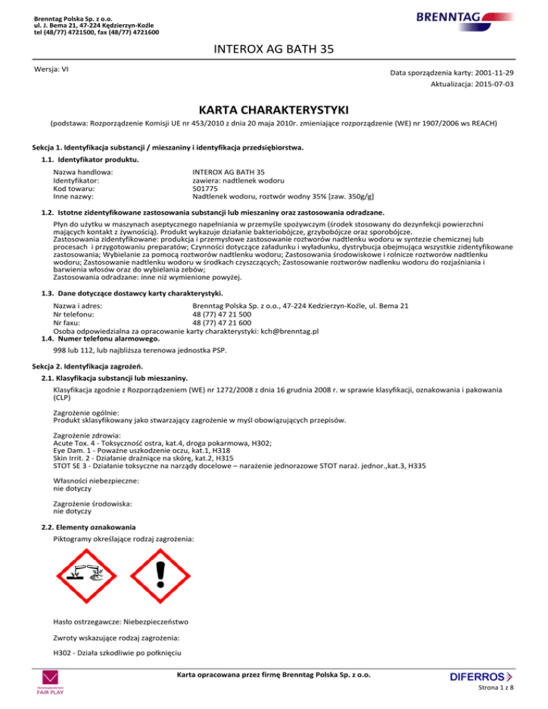 Brenntag Polska Sp. z o.o. ul. J. Bema 21, 47-224 Kędzierzyn-Koźle tel (48/77) 4721500, fax (48/77) 4721600 INTEROX AG BATH 35 Wersja: VI Data sporządzenia karty: 2001-11-29 Aktualizacja: 2015-07-03 KARTA CHARAKTERYSTYKI (podstawa: Rozporządzenie Komisji UE nr 453/2010 z dnia 20 maja 2010r. zmieniające rozporządzenie (WE) nr 1907/2006 ws REACH) Sekcja 1. Identyfikacja substancji / mieszaniny i identyfikacja przedsiębiorstwa. 1.1. Identyfikator produktu. Nazwa handlowa: Identyfikator: Kod towaru: Inne nazwy: INTEROX AG BATH 35 zawiera: nadtlenek wodoru 501775 Nadtlenek wodoru, roztwór wodny 35% [zaw. 350g/g] 1.2. Istotne zidentyfikowane zastosowania substancji lub mieszaniny oraz zastosowania odradzane. Płyn do użytku w maszynach aseptycznego napełniania w przemyśle spożywczym (środek stosowany do dezynfekcji powierzchni mających kontakt z żywnością). Produkt wykazuje działanie bakteriobójcze, grzybobójcze oraz sporobójcze. Zastosowania zidentyfikowane: produkcja i przemysłowe zastosowanie roztworów nadtlenku wodoru w syntezie chemicznej lub procesach i przygotowaniu preparatów; Czynności dotyczące załadunku i wyładunku, dystrybucja obejmująca wszystkie zidentyfikowane zastosowania; Wybielanie za pomocą roztworów nadtlenku wodoru; Zastosowania środowiskowe i rolnicze roztworów nadtlenku wodoru; Zastosowanie nadtlenku wodoru w środkach czyszczących; Zastosowanie roztworów nadlenku wodoru do rozjaśniania i barwienia włosów oraz do wybielania zebów; Zastosowania odradzane: inne niż wymienione powyżej. 1.3. Dane dotyczące dostawcy karty charakterystyki. Nazwa i adres: Brenntag Polska Sp. z o.o., 47-224 Kedzierzyn-Koźle, ul. Bema 21 Nr telefonu: 48 (77) 47 21 500 Nr faxu: 48 (77) 47 21 600 Osoba odpowiedzialna za opracowanie karty charakterystyki: [email protected] 1.4. Numer telefonu alarmowego. 998 lub 112, lub najbliższa terenowa jednostka PSP. Sekcja 2. Identyfikacja zagrożeń. 2.1. Klasyfikacja substancji lub mieszaniny. Klasyfikacja zgodnie z Rozporządzeniem (WE) nr 1272/2008 z dnia 16 grudnia 2008 r. w sprawie klasyfikacji, oznakowania i pakowania (CLP) Zagrożenie ogólnie: Produkt sklasyfikowany jako stwarzający zagrożenie w myśl obowiązujących przepisów. Zagrożenie zdrowia: Acute Tox. 4 - Toksyczność ostra, kat.4, droga pokarmowa, H302; Eye Dam. 1 - Poważne uszkodzenie oczu, kat.1, H318 Skin Irrit. 2 - Działanie drażniące na skórę, kat.2, H315 STOT SE 3 - Działanie toksyczne na narządy docelowe – narażenie jednorazowe STOT naraż. jednor.,kat.3, H335 Własności niebezpieczne: nie dotyczy Zagrożenie środowiska: nie dotyczy 2.2. Elementy oznakowania Piktogramy określające rodzaj zagrożenia: Hasło ostrzegawcze: Niebezpieczeństwo Zwroty wskazujące rodzaj zagrożenia: H302 - Działa szkodliwie po połknięciu Karta opracowana przez firmę Brenntag Polska Sp. z o.o. Strona 1 z 8 Brenntag Polska Sp. z o.o. ul. J. Bema 21, 47-224 Kędzierzyn-Koźle tel (48/77) 4721500, fax (48/77) 4721600 INTEROX AG BATH 35 H318 - Powoduje poważne uszkodzenie oczu H315 - Działa drażniąco na skórę H335 - Może powodować podrażnienie dróg oddechowych Zwroty określające warunki bezpiecznego stosowania: P280 - Stosować rękawice ochronne/odzież ochronną/ochronę oczu/ochronę twarzy. P261 - Unikać wdychania pyłu/dymu/gazu/mgły/par/rozpylonej cieczy. P305+P351+P338 - W przypadku dostania się do oczu: Ostrożnie płukać wodą przez kilka minut.Wyjąć soczewki kontaktowe, jeżeli są i można je łatwo usunąć. nadal płukać. P304+P340 - W przypadku dostania się do dróg oddechowych: wyprowadzić lub wynieść poszkodowanego na świeże powietrze i zapewnić warunki do odpoczynku w pozycji umozliwiającej swobodne oddychanie P302+P352 - W przypadku kontaktu ze skórą: Umyć dużą ilością wody z mydłem. P301+P312 - W przypadku połknięcia: W przypadku złego samopoczucia skontaktować się z Ośrodkiem Zatruć lub z lekarzem. 2.3. Inne zagrożenia. Produkt jest silnym utleniaczem. Niebezpieczeństwo rozkladu w razie działania nadmiernego ciepła. Niebezpieczeństwo rozpadu przy zetknięciu z substancjami niezgodnymi, zanieczyszczeniami, metalami, alkaliami, środkami redukującymi. Niebezpieczeństwo wybuchu w kontakcie z rozpuszczalnikami organicznymi. Produkt nie spełnia kryteriów PBT lub vPvB zgodnie z załącznikiem XIII. Sekcja 3. Skład / informacja o składnikach. Skład wg Rozporządzenia 1272/2008. >=35 - <50% nadtlenek wodoru, roztwór (Ox. Liq. 1; H271, Skin Corr. 1A; H314, Eye Dam. 1; H318, Acute Tox. 4; H302, Acute Tox. 4; H332, STOT SE 3; H335, Aquatic Chronic 3; H412; CAS: 7722-84-1; WE: 231-765-0; nr indeksu: 008-003-00-9) Numer rejestracji: 01-2119485845-22-XXXX O ile wymienione są składniki niebezpieczne, znaczenie zwrotów H podane jest w p. 16 karty charakterystyki. Sekcja 4. Środki pierwszej pomocy. 4.1. Opis środków pierwszej pomocy. Wdychanie: W razie narażenia inhalacyjnego wyprowadzić poszkodowanego na świeże powietrze, zapewnić warunki do odpoczynku w pozycji umożliwiające swobodne oddychanie. Przy utrzymujących się dolegliwościach zapewnić pomoc medyczną. Kontakt ze skórą: W razie skażenia skóry zdjąć zanieczyszczoną odzież, narażone miejsca umyć wodą z mydłem. Przy utrzymujących się dolegliwościach zapewnić pomoc medyczną. Kontakt z oczami: W razie kontaktu z oczami natychmiast płukać dużą ilością wody przez co najmniej 15 minut przy szeroko otwartych powiekach. W przypadku trudności z otwieraniem powiek, zastosować znieczulające płukanie oczu (oksybuprokaina). Natychmiast zapewnić pomoc medyczną. Spożycie: W razie połknięcia wypłukać usta, natychmiast podać dużą ilość wody do picia, niezwłocznie wezwać pomoc medyczną. 4.2. Najważniejsze ostre i opóźnione objawy oraz skutki narażenia. wdychanie - podrażnienie górnych dróg oddechowych; objawy: krwotok z nosa, zapalenie gardła, kaszel kontakt ze skórą - powoduje pow