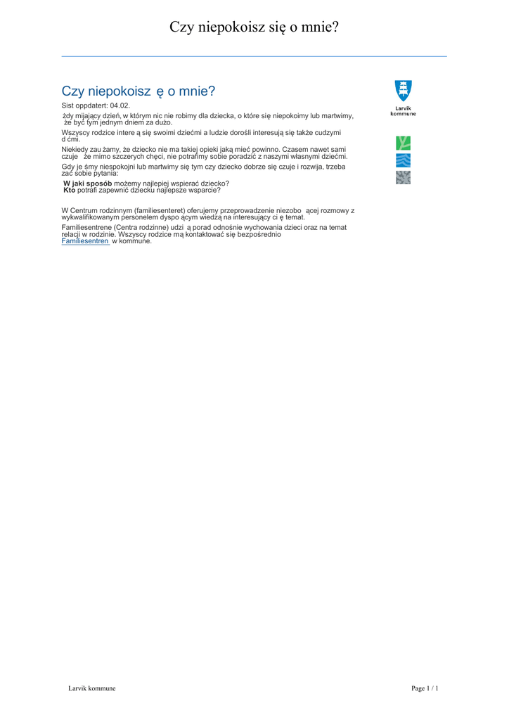 Czy niepokoisz się o mnie? Czy niepokoisz ę o mnie? Sist oppdatert: 04.02. żdy mijający dzień, w którym nic nie robimy dla dziecka, o które się niepokoimy lub martwimy, że być tym jednym dniem za dużo. Wszyscy rodzice intere ą się swoimi dziećmi a ludzie dorośli interesują się także cudzymi d ćmi. Niekiedy zau żamy, że dziecko nie ma takiej opieki jaką mieć powinno. Czasem nawet sami czuje że mimo szczerych chęci, nie potrafimy sobie poradzić z naszymi własnymi dziećmi. Gdy je śmy niespokojni lub martwimy się tym czy dziecko dobrze się czuje i rozwija, trzeba zać sobie pytania: W jaki sposób możemy najlepiej wspierać dziecko? Kto potrafi zapewnić dziecku najlepsze wsparcie? W Centrum rodzinnym (familiesenteret) oferujemy przeprowadzenie niezobo ącej rozmowy z wykwalifikowanym personelem dyspo ącym wiedzą na interesujący ci ę temat. Familiesentrene (Centra rodzinne) udzi ą porad odnośnie wychowania dzieci oraz na temat relacji w rodzinie. Wszyscy rodzice mą kontaktować się bezpośrednio Familiesentren w kommune. Larvik kommune Page 1 / 1