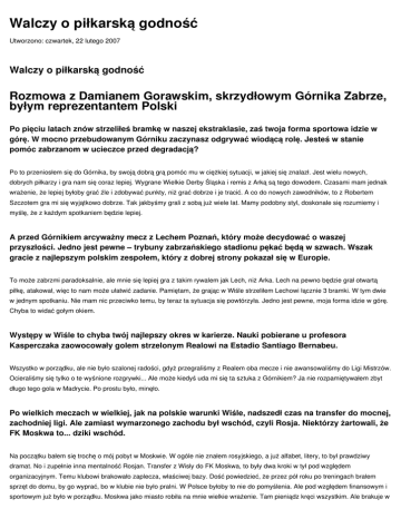 Walczy o piłkarską godność Utworzono: czwartek, 22 lutego 2007 Walczy o piłkarską godność Rozmowa z Damianem Gorawskim, skrzydłowym Górnika Zabrze, byłym reprezentantem Polski Po pięciu latach znów strzeliłeś bramkę w naszej ekstraklasie, zaś twoja forma sportowa idzie w górę. W mocno przebudowanym Górniku zaczynasz odgrywać wiodącą rolę. Jesteś w stanie pomóc zabrzanom w ucieczce przed degradacją? Po to przeniosłem się do Górnika, by swoją dobrą grą pomóc mu w ciężkiej sytuacji, w jakiej się znalazł. Jest wielu nowych, dobrych piłkarzy i gra nam się coraz lepiej. Wygrane Wielkie Derby Śląska i remis z Arką są tego dowodem. Czasami mam jednak wrażenie, że lepiej byłoby grać źle i zdobywać punkty, niż grać dobrze i je tracić. A co do nowych zawodników, to z Robertem Szczotem gra mi się wyjątkowo dobrze. Tak jakbyśmy grali z sobą już wiele lat. Mamy podobny styl, doskonale się rozumiemy i myślę, że z każdym spotkaniem będzie lepiej. A przed Górnikiem arcyważny mecz z Lechem Poznań, który może decydować o waszej przyszłości. Jedno jest pewne – trybuny zabrzańskiego stadionu pękać będą w szwach. Wszak gracie z najlepszym polskim zespołem, który z dobrej strony pokazał się w Europie. To może zabrzmi paradoksalnie, ale mnie się lepiej gra z takim rywalem jak Lech, niż Arka. Lech na pewno będzie grał otwartą piłkę, atakował, więc to nam może ułatwić zadanie. Pamiętam, że grając w Wiśle strzeliłem Lechowi łącznie 3 bramki. W tym dwie w jednym spotkaniu. Nie mam nic przeciwko temu, by teraz ta sytuacja się powtórzyła. Jedno jest pewne, moja forma idzie w górę. Chyba to widać gołym okiem. Występy w Wiśle to chyba twój najlepszy okres w karierze. Nauki pobierane u profesora Kasperczaka zaowocowały golem strzelonym Realowi na Estadio Santiago Bernabeu. Wszystko w porządku, ale nie było szalonej radości, gdyż przegraliśmy z Realem oba mecze i nie awansowaliśmy do Ligi Mistrzów. Ocieraliśmy się tylko o te wyśnione rozgrywki... Ale może kiedyś uda mi się ta sztuka z Górnikiem? Ja nie rozpamiętywałem zbyt długo tego gola w Madrycie. Po prostu było, minęło. Po wielkich meczach w wielkiej, jak na polskie warunki Wiśle, nadszedł czas na transfer do mocnej, zachodniej ligi. Ale zamiast wymarzonego zachodu był wschód, czyli Rosja. Niektórzy żartowali, że FK Moskwa to... dziki wschód. Na początku bałem się trochę o mój pobyt w Moskwie. W ogóle nie znałem rosyjskiego, a już alfabet, litery, to był prawdziwy dramat. No i zupełnie inna mentalność Rosjan. Transfer z Wisły do FK Moskwa, to były dwa kroki w tył pod względem organizacyjnym. Temu klubowi brakowało zaplecza, właściwej bazy. Dość powiedzieć, że przez pół roku po treningach brałem sprzęt do domu, by go wyprać, bo w klubie nie było pralni. W Polsce byłoby to nie do pomyślenia. Ale pod względem finansowym i sportowym już było w porządku. Moskwa jako miasto robiła na mnie wielkie wrażenie. Tam pieniądz kręci wszystkim. Ale brakuje w tym mieście średniej klasy, na każdym kroku widać wielkie bogactwo i jeszcze większą biedę, czyli ogromne kontrasty. Moskwa „by night” zapewne kusiła kawalera z Polski? Rzeczywiście, życie nocne tam kusi, ale ja znam umiar i wiem, co mi wolno, a czego już nie. Chodziłem do pubów i restauracji, ale bez szaleństw. Z czasem miałem w Moskwie wielu przyjaciół, z którymi bardzo dobrze się rozumiałem. Szynnik to raczej nie był krok do przodu w twojej karierze. To była lekka stagnacja, ale pod względem sportowym na pewno zyskałem. Było dużo treningów, dużo taktyki, no i cały czas byłem podstawowym graczem tej drużyny. Cały czas byliśmy skoszarowani w ośrodku treningowym. Na życie prywatne nie było czasu. Cały dzień treningi i omawianie taktyki. Dopiero wieczorem można było wyrwać się do domu z tych „koszar”. Tyle poświęcenia, silny skład i wszystko na darmo. Zespół został zdegradowany do pierwszej ligi, ale o tym, że tak się stanie, wiedzieliśmy dużo wcześniej. Przeciwko nam byli sędziowie, którzy w niemal każdym spotkaniu gwizdali karne dla rywali. Wróciłeś do Polski już jako ukształtowany piłkarz i człowiek. Koniec z romansami i beztroskim życiem playboy’a? To co gazety pisały o moim życiu prywatnym, to głównie bzdury wyssane z palca. Tylko moje spotkania z Natalią, znaną modelką, to była prawdziwa historia. Inne rzeczy były zwyczajnie przekręcane, ewentualnie wymyślane. Po powrocie z Rosji walczę o swoje nazwisko, o piłkarską godność. Cały czas muszę grać na wysokim poziomie, to dla mnie sprawa najważniejsza. Postaram się udowodnić wszystkim niedowiarkom, że „Gora” jeszcze wiele potrafi. Rozmawiał Jerzy Mucha