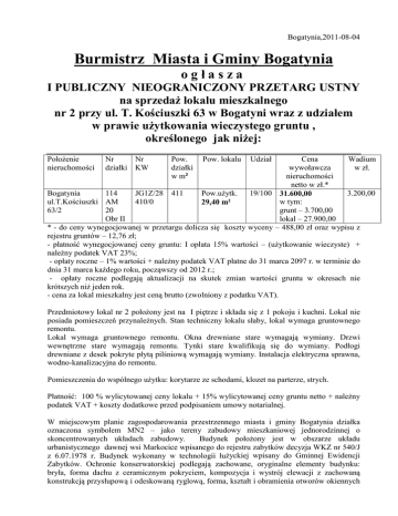 Bogatynia,2011-08-04 Burmistrz Miasta i Gminy Bogatynia ogłasza I PUBLICZNY NIEOGRANICZONY PRZETARG USTNY na sprzedaż lokalu mieszkalnego nr 2 przy ul. T. Kościuszki 63 w Bogatyni wraz z udziałem w prawie użytkowania wieczystego gruntu , określonego jak niżej: Położenie nieruchomości Cena Wadium wywoławcza w zł. nieruchomości netto w zł.* 114 JG1Z/28 411 Pow.użytk. 3.200,00 Bogatynia 19/100 31.600,00 410/0 w tym: ul.T.Kościuszki AM 29,40 m² 63/2 20 grunt – 3.700,00 lokal – 27.900,00 Obr II * - do ceny wynegocjowanej w przetargu dolicza się koszty wyceny – 488,00 zł oraz wypisu z rejestru gruntów – 12,76 zł; - płatność wynegocjowanej ceny gruntu: I opłata 15% wartości – (użytkowanie wieczyste) + należny podatek VAT 23%; - opłaty roczne – 1% wartości + należny podatek VAT płatne do 31 marca 2097 r. w terminie do dnia 31 marca każdego roku, począwszy od 2012 r.; - opłaty roczne podlegają aktualizacji na skutek zmian wartości gruntu w okresach nie krótszych niż jeden rok. - cena za lokal mieszkalny jest ceną brutto (zwolniony z podatku VAT). Nr Nr działki KW Pow. działki w m² Pow. lokalu Udział Przedmiotowy lokal nr 2 położony jest na I piętrze i składa się z 1 pokoju i kuchni. Lokal nie posiada pomieszczeń przynależnych. Stan techniczny lokalu słaby, lokal wymaga gruntownego remontu. Lokal wymaga gruntownego remontu. Okna drewniane stare wymagają wymiany. Drzwi wewnętrzne stare wymagają remontu. Tynki stare kwalifikują się do wymiany. Podłogi drewniane z desek pokryte płytą pilśniową wymagają wymiany. Instalacja elektryczna sprawna, wodno-kanalizacyjna do remontu. Pomieszczenia do wspólnego użytku: korytarze ze schodami, klozet na parterze, strych. Płatność: 100 % wylicytowanej ceny lokalu + 15% wylicytowanej ceny gruntu netto + należny podatek VAT + koszty dodatkowe przed podpisaniem umowy notarialnej. W miejscowym planie zagospodarowania przestrzennego miasta i gminy Bogatynia działka oznaczona symbolem MN2 – jako tereny zabudowy mieszkaniowej jednorodzinnej o skoncentrowanych układach zabudowy. Budynek położony jest w obszarze układu urbanistycznego dawnej wsi Markocice wpisanego do rejestru zabytków decyzja WKZ nr 540/J z 6.07.1978 r. Budynek wykonany w technologii łużyckiej wpisany do Gminnej Ewidencji Zabytków. Ochronie konserwatorskiej podlegają zachowane, oryginalne elementy budynku: bryła, forma dachu z ceramicznym pokryciem, kompozycja i wystrój elewacji z zachowaną konstrukcją przysłupową i odeskowaną ryglową, forma, kształt i obramienia otworów okiennych i drzwiowych, drewniana stolarka okienna i drzwiowa. Ochronie podlega zachowany, oryginalny układ przestrzenny wnętrz oraz elementy wyposażenia i wystroju takie jak stropy belkowe, sklepienia, piece kaflowe, itp. Wymagane przywrócenie historycznych podziałów drewnianej stolarki okiennej z pełnoplastycznymi elementami konstrukcyjnymi ramiaków, tzn. profilowanie słupka i ślemienia oraz odtworzenie szprosów (wykluczony podział międzyszybowy). Wymagane wydobycie, wzmocnienie (m.in. narożnika ), uzupełnienie i impregnacja wszystkich drewnianych elementów konstrukcji przysłupowej, zrębowej i odeskowanej ryglowej. Wymagany remont kapitalny z remontem elewacji i nieszczelnego dachu oraz likwidacją zawilgocenia. Stan techniczny budynku słaby. Budynek zalany w wyniku powodzi. Przetarg odbędzie się w dniu 08 września 2011 r. o godzinie 10.00 w siedzibie Urzędu Miasta i Gminy w Bogatyni pok. nr 12. Wadium w gotówce, w wysokości określonej jak wyżej należy wpłacić na rachunek bankowy Gminy Bogatynia znajdujący się w: Powszechnej Kasie Oszczędności Bank Polski S.A. Oddział w Bogatyni, numer rachunku: 21 1020 2137 0000 9902 0118 2005 do dnia 02 września 2011 r. Wadium wpłacone przez uczestnika, który wygrał przetarg zalicza się na poczet kupna nieruchomości, pozostałym uczestnikom wadium zwraca się po zakończeniu przetargu. Wadium przepada na rzecz sprzedającego, w przypadku uchylenia się przez osobę wyłonioną w przetargu jako nabywca nieruchomości od zawarcia umowy, bądź nie stawienia się bez usprawiedliwienia w terminie i miejscu zawarcia umowy, o którym wcześniej została powiadomiona przez organizatora przetargu. Uczestnicy przetargu zobowiązani są posiadać dokumenty: tożsamości, potwierdzenie wniesienia wadium, a podmioty inne niż osoby fizyczne dodatkowo wyciąg z właściwego rejestru oraz pełnomocnictwo do udziału w przetargu. Dowodem wniesienia wadium jest potwierdzenie z banku, poczty lub kasy Urzędu. Bliższych informacji na temat przetargu udziela Wydział Gospodarki Gruntami i Handlu (pokój 25 a), tel. 75 77 25183 lub 75 77 25182. Zastrzega się prawo odwołania przetargu z uzasadnionej przyczyny. Informacja o odwołaniu przetargu zostanie ogłoszona w formie właściwej dla ogłoszenia o przetargu. Przyszły nabywca będzie zobowiązany do złożenia oświadczenia, iż zapoznał się ze stanem prawnym i technicznym nieruchomości i w przyszłości nie będzie występował przeciwko Gminie Bogatynia z żadnymi roszczeniami z tego tytułu. Niniejszy zapis zostanie zawarty w umowie sprzedaży przedmiotowej nieruchomości. Na nabywcy spoczywają koszty związane z przeniesieniem własności nieruchomości. Z up. Burmistrza Sekretarz Gminy mgr Daniel Fryc