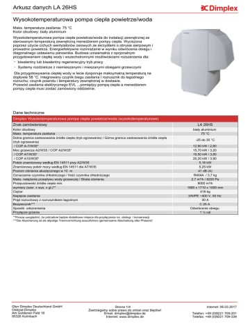 Arkusz danych LA 26HS Wysokotemperaturowa pompa ciepła powietrze/woda Maks. temperatura zasilania: 75 °C Kolor obudowy: biały aluminium Wysokotemperaturowa pompa ciepła powietrze/woda do instalacji zewnętrznej ze sterowanym temperaturą zewnętrzną menedżerem pompy ciepła. Wyciszona poprzez użycie cichych wentylatorów osiowych ze skrzydłami o obrysie sierpowym i prowadnic powietrza. Energoefektywne rozmrażanie w wyniku odwrócenia obiegu i diagonalnego ustawieniu parownika. Budowa uniwersalna z opcjonalnym przygotowaniem ciepłej wody i wszechstronnymi możliwościami rozszerzenia dla: - biwalentny lub biwalentny regeneracyjny tryb pracy - Systemy rozdzielcze z niemieszanymi i mieszanymi obiegami grzewczymi Dla przygotowywania ciepłej wody w lecie dysponuje maksymalną temperaturą na dopływie 58 °C. Integrowany czujnik biegu zasilania i rozrusznik do łagodnego rozruchu; czujnik powrotu i temperatury zewnętrznej w dostawie. Przewód zasilania elektrycznego EVL ...pomiędzy pompą ciepła a menedżerem pompy ciepła musi zostać zamówiony oddzielnie. Dane techniczne Dimplex Wysokotemperaturowa pompa ciepła powietrze/woda (wysokotemperaturowe) Znak zamówieniowy LA 26HS Kolor obudowy Maks. temperatura zasilania Dolna granica zastosowania źródła ciepła (tryb ogrzewania) / Górna granica zastosowania źródła ciepła (tryb ogrzewania) / COP A-7/W35* Moc grzewcza A2/W35 / COP A2/W35* / COP A7/W35* / COP A10/W35* Pobór znamionowy według EN 14511 przy A2/W35 Znamionowy pobór mocy według EN 14511 dla A7/W35 Poziom ciśnienia akustycznego w 10 m Oznaczenie czynnika chłodniczego / Ilość czynnika chłodniczego Maks. natężenie przepływu wody grzewczej / Strata ciśnienia Przepustowość źródła ciepła min. wymiary (szer. x wys. x gł.)** Ciężar Napięcie zasilania Prąd rozruchowy z rozrusznikiem łagodnym Bezpiecznik*** Sposób odszraniania Przyłącze grzania biały aluminium 75 °C -25 do 35 °C 12,90 kW / 2,80 15,70 kW / 3,20 19,50 kW / 3,80 20,20 kW / 3,90 5,16 kW 5,25 kW 41 dB (A) R404A / 3,7 kg 2,7 m³/h / 8200 Pa 8000 m³/h 1680 x 1710 x 1000 mm 418 kg 3/N/PE ~400 V, 50 Hz 30 A C 25 A Odwrócenie obiegu 1 ¼ cal **Proszę uwzględnić, że potrzebne będzie dodatkowe miejsce dla przyłączenia rur, obsługi i konserwacji. ***Die Absicherung ist als allpolige Trennvorrichtung auszuführen (gemeinsame Abschaltung aller Phasen)! Glen Dimplex Deutschland GmbH Oddział Dimplex Am Goldenen Feld 18 95326 Kulmbach Strona 1/4 Zastrzegamy sobie prawo do zmian oraz błędów! Email: [email protected] Internet: www.dimplex.de Internet: 06.03.2017 Telefon: +49 (0)9221 709-201 Telefax: +49 (0)9221 709-339 Wyposażenie urządzenia Opis Typ-nr Numer Ilości artykułu przykładowe Sztuk Cena Pompa ciepła * Dodatkowe szczególne wyposażenie do dyspozycji / wymagane Ważna wskazówka: Kombinacja komponentów i podana ilość przedstawia niewiążące przykładowe urządzenie, które musi być sprawdzone i dopasowane według indywidualnych potrzeb. Wielkość pompy powinna zostać sprawdzona według spadku ciśnienia urządzenia i minimalnego przepływu wody grzewczej pompy ciepła. Glen Dimplex Deutschland GmbH Oddział Dimplex Am Goldenen Feld 18 95326 Kulmbach Strona 2/4 Zastrzegamy sobie prawo do zmian oraz błędów! Email: [email protected] Internet: www.dimplex.de Internet: 06.03.2017 Telefon: +49 (0)9221 709-201 Telefax: +49 (0)9221 709-339 Pompa ciepła powietrze/woda, schemat połączeń, Pompa ciepła i grzałka nurnikowa Adnotacje: Hydrauliczne połączenie obrazuje schematyczne przedstawienie niezbędnych do działania elementów i powinno służyć jako pomoc do przeprowadzenia własnych projektów. Aktualną wersję można w każdej chwili ściągnąć pod adresem www.dimplex.de/nc/pl/professional/plan owanie-online/schematy-po3-czen.html. Nie zawiera ono wszystkich koniecznych zgodnie z normą DIN EN 12828 instalacji bezpieczeństwa, elementów utrzymania stałego ciśnienia oraz ewentualnie koniecznych dodatkowych urządzeń zamykających do prac konserwacyjnych i serwisowych. Nastawienia sterownika pompy ciepła i istniejącego ewentualnie zewnętrznego urządzenia regulującego muszą zostać dostosowane do przedłożonego schematu połączeń. Może wystąpić konieczność dokonania aktualizacji oprogramowania! Glen Dimplex Deutschland GmbH Oddział Dimplex Am Goldenen Feld 18 95326 Kulmbach Strona 3/4 Zastrzegamy sobie prawo do zmian oraz błędów! Email: [email protected] Internet: www.dimplex.de Internet: 06.03.2017 schemat połączeń: 10241020 Telefon: +49 (0)9221 709-201 Telefax: +49 (0)9221 709-339 Pompa ciepła powietrze/woda, schemat połączeń, Pompa ciepła i grzałka nurnikowa Legenda: 1. 1.1 1.2 1.3 1.4 1.5 1.6 1.7 2. 3. 3.1 4. 5. 6. 7. 8. 9. 10. 13. 15. 16. 17. Pompa ciepła Pompa ciepła powietrze/woda Pompa ciepła solanka/woda Pompa ciepła woda/woda Rewersyjna pompa ciepła powietrze/woda Rewersyjna pompa ciepła solanka/woda Rewersyjna pompa ciepła woda/woda Pompa ciepła powietrze/woda typu split Menedżer pompy ciepła Równoległy zbiornik buforowy Zbiornik buforowy Zbiornik ciepłej wody Wymiennik ciepła wody w basenie Pasywna stacja chłodzenia z regulatorem N6 Grzanie i ciche lub dynamiczne chłodzenie Konwektor wentylatorowy z podłączeniem 4 litrowym Wyłączny obieg chłodzenia Wyłączny obieg grzania Źródło ciepła Wieża hydrauliczna Ochrona przed oparzeniem Wieża hydrauliczna HWK 332 System rozdziału ciepłej wody: DDV 25 DDV 32 EB KPV KPV 25 MMB 25 MMH 25 VTB 25 WWM 25 Podwójny bezciśnieniowy rozdzielacz (do 2,0 m³/h)* Podwójny bezciśnieniowy rozdzielacz (do 2,5 m³/h)* Moduł rozszerzający dla rozdzielacza kompaktowego (do 2,0 m³/h)* Moduł rozszerzający z zaworem przelewowym (do 1,3 m³/h)* w połączeniu z EB KPV (do 2,0 m³/h)* Biwalentny moduł mieszający (do 2,0 m³/h)* Moduł mieszający obiegu grzewczego Belki rozdzielacza (do 2,5 m³/h)* Moduł ciepłej wody / niemieszalny obieg grzewczy (d