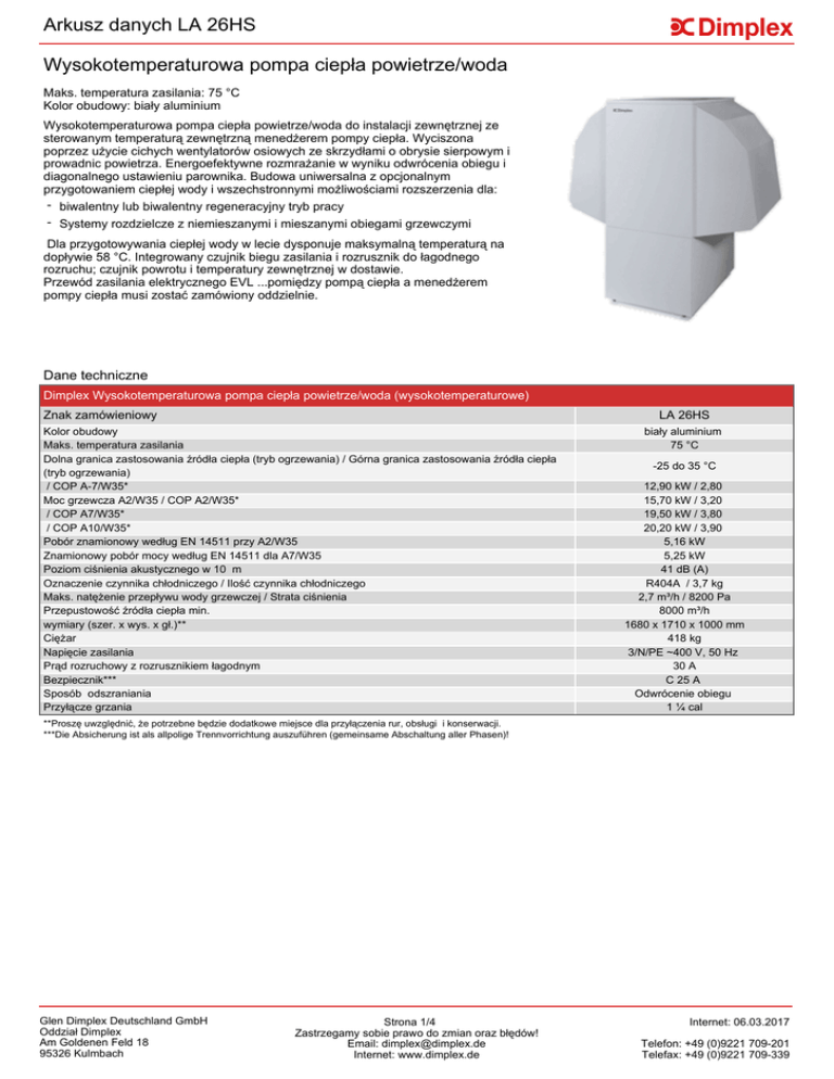Arkusz danych Wysokotemperaturowa pompa ciep³a