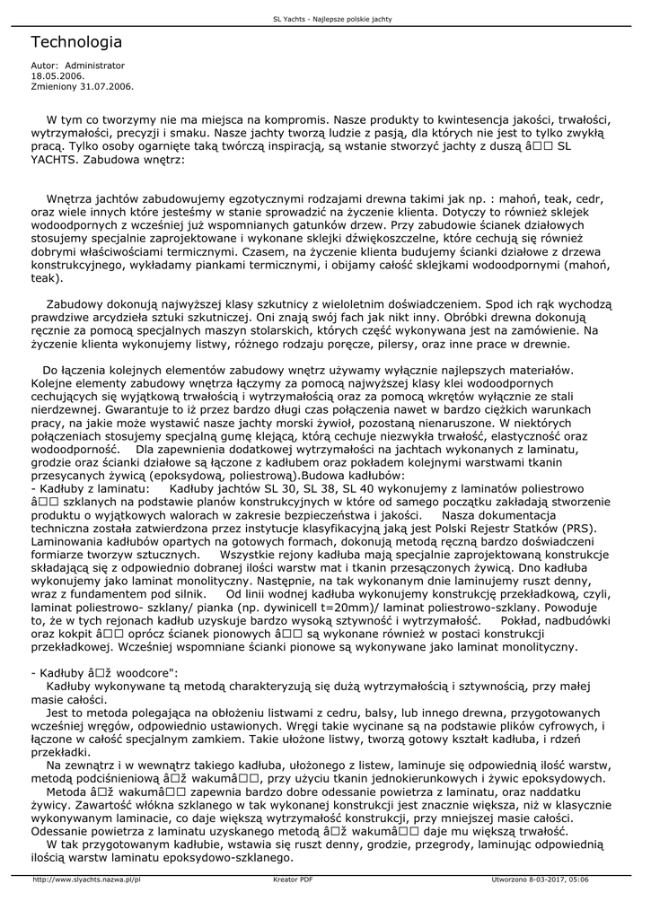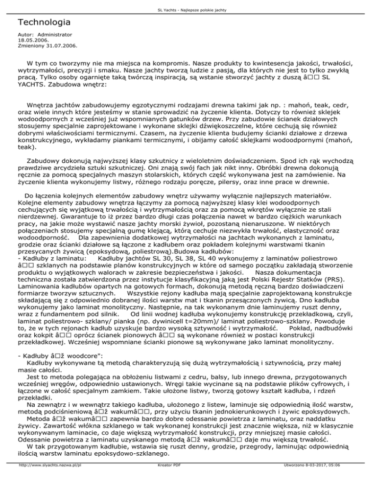 SL Yachts - Najlepsze polskie jachty Technologia Autor: Administrator 18.05.2006. Zmieniony 31.07.2006. W tym co tworzymy nie ma miejsca na kompromis. Nasze produkty to kwintesencja jakości, trwałości, wytrzymałości, precyzji i smaku. Nasze jachty tworzą ludzie z pasją, dla których nie jest to tylko zwykłą pracą. Tylko osoby ogarnięte taką twórczą inspiracją, są wstanie stworzyć jachty z duszą – SL YACHTS. Zabudowa wnętrz: Wnętrza jachtów zabudowujemy egzotycznymi rodzajami drewna takimi jak np. : mahoń, teak, cedr, oraz wiele innych które jesteśmy w stanie sprowadzić na życzenie klienta. Dotyczy to również sklejek wodoodpornych z wcześniej już wspomnianych gatunków drzew. Przy zabudowie ścianek działowych stosujemy specjalnie zaprojektowane i wykonane sklejki dźwiękoszczelne, które cechują się również dobrymi właściwościami termicznymi. Czasem, na życzenie klienta budujemy ścianki działowe z drzewa konstrukcyjnego, wykładamy piankami termicznymi, i obijamy całość sklejkami wodoodpornymi (mahoń, teak). Zabudowy dokonują najwyższej klasy szkutnicy z wieloletnim doświadczeniem. Spod ich rąk wychodzą prawdziwe arcydzieła sztuki szkutniczej. Oni znają swój fach jak nikt inny. Obróbki drewna dokonują ręcznie za pomocą specjalnych maszyn stolarskich, których część wykonywana jest na zamówienie. Na życzenie klienta wykonujemy listwy, różnego rodzaju poręcze, pilersy, oraz inne prace w drewnie. Do łączenia kolejnych elementów zabudowy wnętrz używamy wyłącznie najlepszych materiałów. Kolejne elementy zabudowy wnętrza łączymy za pomocą najwyższej klasy klei wodoodpornych cechujących się wyjątkową trwałością i wytrzymałością oraz za pomocą wkrętów wyłącznie ze stali nierdzewnej. Gwarantuje to iż przez bardzo długi czas połączenia nawet w bardzo ciężkich warunkach pracy, na jakie może wystawić nasze jachty morski żywioł, pozostaną nienaruszone. W niektórych połączeniach stosujemy specjalną gumę klejącą, którą cechuje niezwykła trwałość, elastyczność oraz wodoodporność. Dla zapewnienia dodatkowej wytrzymałości na jachtach wykonanych z laminatu, grodzie oraz ścianki działowe są łączone z kadłubem oraz pokładem kolejnymi warstwami tkanin przesycanych żywicą (epoksydową, poliestrową).Budowa kadłubów: - Kadłuby z laminatu: Kadłuby jachtów SL 30, SL 38, SL 40 wykonujemy z laminatów poliestrowo – szklanych na podstawie planów konstrukcyjnych w które od samego początku zakładają stworzenie produktu o wyjątkowych walorach w zakresie bezpieczeństwa i jakości. Nasza dokumentacja techniczna została zatwierdzona przez instytucje klasyfikacyjną jaką jest Polski Rejestr Statków (PRS). Laminowania kadłubów opartych na gotowych formach, dokonują metodą ręczną bardzo doświadczeni formiarze tworzyw sztucznych. Wszystkie rejony kadłuba mają specjalnie zaprojektowaną konstrukcje składającą się z odpowiednio dobranej ilości warstw mat i tkanin przesączonych żywicą. Dno kadłuba wykonujemy jako laminat monolityczny. Następnie, na tak wykonanym dnie laminujemy ruszt denny, wraz z fundamentem pod silnik. Od linii wodnej kadłuba wykonujemy konstrukcję przekładkową, czyli, laminat poliestrowo- szklany/ pianka (np. dywinicell t=20mm)/ laminat poliestrowo-szklany. Powoduje to, że w tych rejonach kadłub uzyskuje bardzo wysoką sztywność i wytrzymałość. Pokład, nadbudówki oraz kokpit – oprócz ścianek pionowych – są wykonane również w postaci konstrukcji przekładkowej. Wcześniej wspomniane ścianki pionowe są wykonywane jako laminat monolityczny. - Kadłuby „woodcore": Kadłuby wykonywane tą metodą charakteryzują się dużą wytrzymałością i sztywnością, przy małej masie całości. Jest to metoda polegająca na obłożeniu listwami z cedru, balsy, lub innego drewna, przygotowanych wcześniej wręgów, odpowiednio ustawionych. Wręgi takie wycinane są na podstawie plików cyfrowych, i łączone w całość specjalnym zamkiem. Takie ułożone listwy, tworzą gotowy kształt kadłuba, i rdzeń przekładki. Na zewnątrz i w wewnątrz takiego kadłuba, ułożonego z listew, laminuje się odpowiednią ilość warstw, metodą podciśnieniową „wakum―, przy użyciu tkanin jednokierunkowych i żywic epoksydowych. Metoda „wakum― zapewnia bardzo dobre odessanie powietrza z laminatu, oraz naddatku żywicy. Zawartość włókna szklanego w tak wykonanej konstrukcji jest znacznie większa, niż w klasycznie wykonywanym laminacie, co daje większą wytrzymałość konstrukcji, przy mniejszej masie całości. Odessanie powietrza z laminatu uzyskanego metodą „wakum― daje mu większą trwałość. W tak przygotowanym kadłubie, wstawia się ruszt denny, grodzie, przegrody, laminując odpowiednią ilością warstw laminatu epoksydowo-szklanego. http://www.slyachts.nazwa.pl/pl Kreator PDF Utworzono 8-03-2017, 05:06 SL Yachts - Najlepsze polskie jachty Pokład budowany jest na podobnych wręgach, jak kadłub, również wyciętych na podstawie wcześniej przygotowanych plików cyfrowych. Pokład ma konstrukcje przekładkową. Pierwsza warstwa to sklejka wodoodporna, na której układa się piankę oraz w miejscach silnie obciążonych sklejkę odpowiedniej grubości. Kolejną warstwą przekładki jest ponownie sklejka wodoodporna. Ostatnią warstwą jest laminat epoksydowo-szklany. Grubości takiej konstrukcji są różne, i zależne od rejonu na pokładzie.- Kadłuby stalowe i aluminiowe: Jako firma nie budujemy kadłubów stalowych lub aluminiowych, ale zlecamy takie podwykonawcom. Oferujemy dodatkowo wykonanie dokumentacji roboczych i nadzór na budową stalowych, lub aluminiowych kadłubów jachtów. Wyposażamy i zabudowujemy takie natomiast od początku do końca. Nasze konstrukcje są wykonywane na podstawie naszych własnych planów ale również na podstawie najlepszych polskich oraz zagranicznych projektantów. P