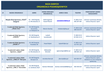 BAZA DANYCH ORGANIZACJI POZARZĄDOWYCH NAZWA ORGANIZACJI ADRES OSOBA KIERUJĄCA ORGANIZACJĄ ADRES E-MAIL TELEFON PODSTAWOWY ZAKRES DZIAŁALNOŚCI 1. Miejski Klub Sportowy ,,PIAST” Żmigród 55 – 140 Żmigród, ul. Wrocławska 12 Rafał Zagórski Paweł Pilarski [email protected] 71 385 27 45 692 297 595 ochrona i promocja zdrowia, kultura fizyczna i sport 2. Uczniowski Klub Sportowy „Młode Orły” 55-140 Żmigród, Korzeosko, ul. Kolejowa 14 Marcin Stochaj mlodeorł[email protected] 71 385 61 68 608 418 074 ochrona i promocja zdrowia, kultura fizyczna i sport 3. Uczniowski Klub Sportowy „SOKÓŁ” 55-140 Żmigród, ul. Sienkiewicza 6 Ludwik Łyczakowski 71 385 35 25 65 546 13 19 kultura fizyczna i sport 4. Uczniowski Klub Sportowy „DEBIUT” 55-140 Żmigród, Powidzko 49 Paweł Bybel [email protected] 71 385 31 34 517 971 126 kultura fizyczna i sport 5. Uczniowski Ludowy Klub Sportowy „Ogień” 55-140 Żmigród, ul. Wrocławska 12 Aleksander Wrooski [email protected] 71 385 31 34 500 585 133 kultura fizyczna i sport 6. Uczniowski Ludowy Klub Sportowy ,,ORKAN” Borzęcin 55-140 Żmigród, Borzęcin 22 Jarosław Barczyk [email protected] 661 835 337 ochrona i promocja zdrowia, kultura fizyczna i sport, działania na rzecz integracji społecznej 7. Uczniowski Ludowy Klub Sportowy ,,ORLA” Korzeńsko 55-140 Żmigród, ul. Zamkowa 2b/2 Damian Michalak [email protected] 692 436 619 ochrona i promocja zdrowia, kultura fizyczna i sport LP. NAZWA ORGANIZACJI ADRES OSOBA KIERUJĄCA ORGANIZACJĄ ADRES E-MAIL TELEFON PODSTAWOWY ZAKRES DZIAŁALNOŚCI 8. Uczniowski Ludowy Klub Sportowy ,,POWIDZKO” 55-140 Żmigród, Powidzko 7a Paweł Bybel [email protected] 71 385 66 93 517 971 126 ochrona i promocja zdrowia, kultura fizyczna i sport 9. Uczniowski Ludowy Klub Sportowy ,,ŻOK” Żmigród 55-140 Żmigród, ul. Lipowa 2d/14 Damian Małys [email protected] 71 385 39 71 ochrona i promocja zdrowia, kultura fizyczna i sport 10. Miejsko-Gminne Zrzeszenie LZS 55-140 Żmigród, ul. Wrocławska 12 Stanisław Chorążyczewski [email protected] 71 385 31 34 696 472 639 ochrona i promocja zdrowia, kultura fizyczna i sport, ochrona dziedzictwa przyrodniczego i turystyka 11. Ludowy Zespół Sportowy ,,POGOŃ” Łapczyce 55-140 Żmigród, ul. Zielona 11/2 Gracjan Lewizorowicz [email protected] 663 261 345 ochrona i promocja zdrowia, kultura fizyczna i sport 12. Ludowy Zespół Sportowy „START” Bychowo 55-140 Żmigród, Bychowo 3, adres do korespondencji: ul. Spółdzielcza 3/3 Rafał Duda [email protected] 665 066 731 ochrona i promocja zdrowia, kultura fizyczna i sport 13. Ludowy Zespół Sportowy ,,LECH” Barkowo 55-140 Żmigród, Barkówko 9 Bogdan Mejor 71 385 64 89 kultura fizyczna i sport 14. Stowarzyszenie św. Wincentego a’Paulo 55-140 Żmigród, ul. Kościelna 1 Maria Cieśla 71 385 35 91 783 502 278 działania na rzecz integracji społecznej 15. Stowarzyszenie Osób Niepełnosprawnych Ich Rodzin i Przyjaciół 55-140 Żmigród, ul. Rybacka 17a Renata Sierakowska 71 385 26 25 działanie na rzecz osób niepełnosprawnych 16. Stowarzyszenie Amazonek „Ewa” 55-140 Żmigród, ul. Rybacka 17 Janina Gall 71 385 33 24 606 552 049 działanie na rzecz osób niepełnosprawnych LP. stowarzyszenie.amazonki@ o2.pl LP. NAZWA ORGANIZACJI ADRES OSOBA KIERUJĄCA ORGANIZACJĄ 17. Stowarzyszenie ,,Nasza Wieś Borek” 55-140 Żmigród, Borek 39 Mariusz Turowski 18. Stowarzyszenie ,,Źródło Natury” 55-140 Żmigród, Ruda Żmigrodzka 2 Krystyna Halat 19. Stowarzyszenie „Borzęcin Od Nowa” 55-140 Żmigród, Borzęcin 54 Anna RosioskaDolik 20. Stowarzyszenie Rozwoju Wsi Barkowo Barkowianie 55-140 Żmigród, Barkowo 30 Krystyna NiedopytalskaKaczmarek 21. Stowarzyszenie Równych Szans ,,FAIRYLINE” 55-140 Żmigród, ul. Wrocławska 12 22. Stowarzyszenie na Rzecz Integracji Społecznej im. Św. Jadwigi Śl. 55-140 Żmigród, ul. Zamkowa 4/3 Andrzej Wiewióra ADRES E-MAIL [email protected] [email protected] [email protected] TELEFON PODSTAWOWY ZAKRES DZIAŁALNOŚCI 71 385 31 57 692 469 148 kultura fizyczna i sport, działania na rzecz integracji społecznej 694 374 453 ochrona dziedzictwa i turystyka 691 272 959 edukacja i nauka, kultura, sztuka, ochrona dóbr kultury i tradycji, kultura fizyczna, ochrona dziedzictwa przyrodniczego i turystyka, działania na rzecz integracji społecznej, inne 71 385 64 77 kultura, sztuka, ochrona dóbr kultury i tradycji 71 385 27 58 działania na rzecz integracji społecznej 23. Stowarzyszenie ,,Radosny Uśmiech” 55-140 Żmigród, ul. Rzeźnicza 20/3 Izabela Adamowicz Marta Możdżeo [email protected] 728 970 134 509 664 921 ochrona i promocja zdrowia, edukacja i nauka, kultura fizyczna i sport LP. NAZWA ORGANIZACJI ADRES OSOBA KIERUJĄCA ORGANIZACJĄ ADRES E-MAIL TELEFON PODSTAWOWY ZAKRES DZIAŁALNOŚCI Stowarzyszenie Klubu Seniora ,,Humorek” 55-140 Żmigród, ul. Wrocławska 12, adres do korespondencji ul. Wiejska 11/4 Zofia Waścioska [email protected] [email protected] 661 742 785 kultura, sztuka, ochrona dóbr kultury i tradycji, działanie na rzecz integracji społecznej 71 385 24 60 ochrona i promocja zdrowia, kultura, sztuka, ochrona dóbr kultury i tradycji, kultura fizyczna i sport, działanie na rzecz integracji społecznej, inne 605 846 661 601 450 956 ochrona dziedzictwa przyrodniczego i turystyka, inne 24. 25. Stowarzyszenie Rozwoju Wsi Żmigródek 55-140 Żmigród, Żmigródek 65 Eugeniusz Buczek 26. Stowarzyszenie Ekologiczna Wieś w Korzeńsku 55-140 Żmigród, Korzeosko, ul. 22 Stycznia 6/1 Grzegorz Lipioski Janusz Atłachowicz Stowarzyszenie ,,Żgama” 55-140 Żmigród, ul. Spółdzielcza 2/4 27. 28. Stowarzyszenie Rozwoju Wsi Korzeńsko 29. Stowarzyszenie Przedsiębiorców w Żmigrodzie [email protected] [email protected] stowarzyszeniegama@ gmail.com 55-140 Żmigród, Korzeosko, ul. Kolejowa 14 55-140 Żmigród, ul. Lipowa 2d/14 Mirosław Kuracioski 71 385 39 71 30. 31. 32. Stowarzyszenie Gmin Turystycznych Wzgórz Trzebnickich i Doli