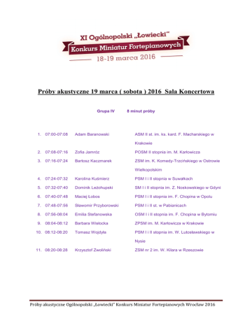 Próby akustyczne 19 marca ( sobota ) 2016 Sala Koncertowa Grupa IV 1. 07:00-07:08 Adam Baranowski 8 minut próby ASM II st. im. ks. kard. F. Macharskiego w Krakowie 2. 07:08-07:16 Zofia Jamróz POSM II stopnia im. M. Karłowicza 3. 07:16-07:24 Bartosz Kaczmarek ZSM im. K. Komedy-Trzcińskiego w Ostrowie Wielkopolskim 4. 07:24-07:32 Karolina Kuśmierz PSM I i II stopnia w Suwałkach 5. 07:32-07:40 Dominik Leżohupski SM I i II stopnia im. Z. Noskowskiego w Gdyni 6. 07:40-07:48 Maciej Łobos PSM I i II stopnia im. F. Chopina w Opolu 7. 07:48-07:56 Sławomir Przyborowski PSM I i II st. w Pabianicach 8. 07:56-08:04 Emilia Stefanowska OSM I i II stopnia im. F. Chopina w Bytomiu 9. 08:04-08:12 Barbara Wisłocka ZPSM im. M. Karłowicza w Krakowie 10. 08:12-08:20 Tomasz Wojdyła PSM I i II stopnia im. W. Lutosławskiego w Nysie 11. 08:20-08:28 Krzysztof Zwoliński ZSM nr 2 im. W. Kilara w Rzeszowie Próby akustyczne Ogólnopolski „Łowiecki” Konkurs Miniatur Fortepianowych Wrocław 2016