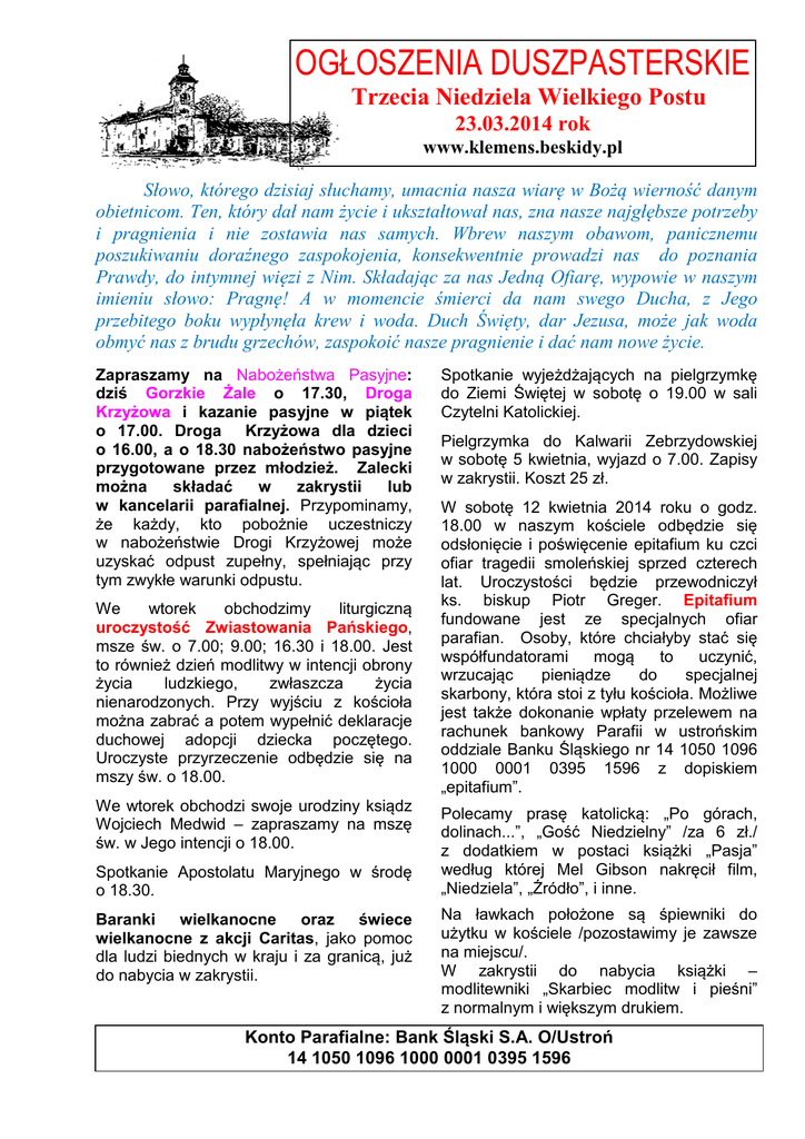 OGŁOSZENIA DUSZPASTERSKIE Trzecia Niedziela Wielkiego Postu 23.03.2014 rok www.klemens.beskidy.pl Słowo, którego dzisiaj słuchamy, umacnia nasza wiarę w Bożą wierność danym obietnicom. Ten, który dał nam życie i ukształtował nas, zna nasze najgłębsze potrzeby i pragnienia i nie zostawia nas samych. Wbrew naszym obawom, panicznemu poszukiwaniu doraźnego zaspokojenia, konsekwentnie prowadzi nas do poznania Prawdy, do intymnej więzi z Nim. Składając za nas Jedną Ofiarę, wypowie w naszym imieniu słowo: Pragnę! A w momencie śmierci da nam swego Ducha, z Jego przebitego boku wypłynęła krew i woda. Duch Święty, dar Jezusa, może jak woda obmyć nas z brudu grzechów, zaspokoić nasze pragnienie i dać nam nowe życie. Zapraszamy na Nabożeństwa Pasyjne: dziś Gorzkie Żale o 17.30, Droga Krzyżowa i kazanie pasyjne w piątek o 17.00. Droga Krzyżowa dla dzieci o 16.00, a o 18.30 nabożeństwo pasyjne przygotowane przez młodzież. Zalecki można składać w zakrystii lub w kancelarii parafialnej. Przypominamy, że każdy, kto pobożnie uczestniczy w nabożeństwie Drogi Krzyżowej może uzyskać odpust zupełny, spełniając przy tym zwykłe warunki odpustu. We wtorek obchodzimy liturgiczną uroczystość Zwiastowania Pańskiego, msze św. o 7.00; 9.00; 16.30 i 18.00. Jest to również dzień modlitwy w intencji obrony życia ludzkiego, zwłaszcza życia nienarodzonych. Przy wyjściu z kościoła można zabrać a potem wypełnić deklaracje duchowej adopcji dziecka poczętego. Uroczyste przyrzeczenie odbędzie się na mszy św. o 18.00. We wtorek obchodzi swoje urodziny ksiądz Wojciech Medwid – zapraszamy na mszę św. w Jego intencji o 18.00. Spotkanie Apostolatu Maryjnego w środę o 18.30. Baranki wielkanocne oraz świece wielkanocne z akcji Caritas, jako pomoc dla ludzi biednych w kraju i za granicą, już do nabycia w zakrystii. Spotkanie wyjeżdżających na pielgrzymkę do Ziemi Świętej w sobotę o 19.00 w sali Czytelni Katolickiej. Pielgrzymka do Kalwarii Zebrzydowskiej w sobotę 5 kwietnia, wyjazd o 7.00. Zapisy w zakrystii. Koszt 25 zł. W sobotę 12 kwietnia 2014 roku o godz. 18.00 w naszym kościele odbędzie się odsłonięcie i poświęcenie epitafium ku czci ofiar tragedii smoleńskiej sprzed czterech lat. Uroczystości będzie przewodniczył ks. biskup Piotr Greger. Epitafium fundowane jest ze specjalnych ofiar parafian. Osoby, które chciałyby stać się współfundatorami mogą to uczynić, pieniądze do specjalnej wrzucając skarbony, która stoi z tyłu kościoła. Możliwe jest także dokonanie wpłaty przelewem na rachunek bankowy Parafii w ustrońskim oddziale Banku Śląskiego nr 14 1050 1096 1000 0001 0395 1596 z dopiskiem „epitafium”. Polecamy prasę katolicką: „Po górach, dolinach...”, „Gość Niedzielny” /za 6 zł./ z dodatkiem w postaci książki „Pasja” według której Mel Gibson nakręcił film, „Niedziela”, „Źródło”, i inne. Na ławkach położone są śpiewniki do użytku w kościele /pozostawimy je zawsze na miejscu/. W zakrystii do nabycia książki – modlitewniki „Skarbiec modlitw i pieśni” z normalnym i większym drukiem. Konto Parafialne: Bank Śląski S.A. O/Ustroń 14 1050 1096 1000 0001 0395 1596