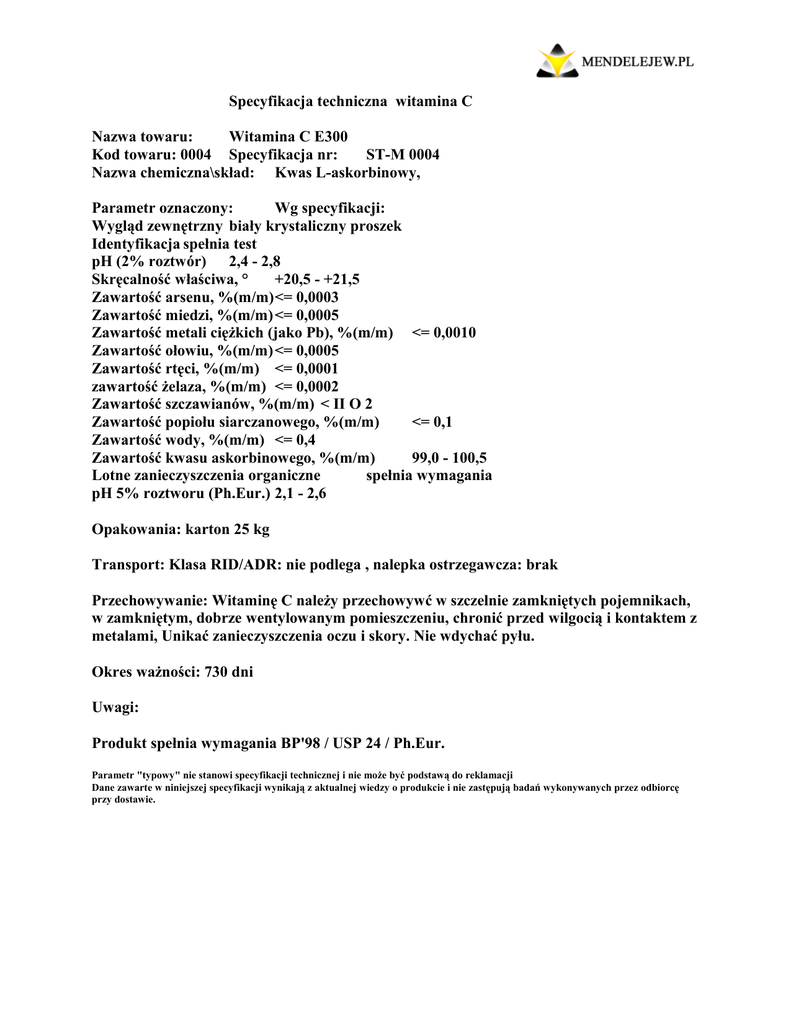 Specyfikacja techniczna witamina C Nazwa towaru: Witamina C E300 Kod towaru: 0004 Specyfikacja nr: ST-M 0004 Nazwa chemiczna\skład: Kwas L-askorbinowy, Parametr oznaczony: Wg specyfikacji: Wygląd zewnętrzny biały krystaliczny proszek Identyfikacja spełnia test pH (2% roztwór) 2,4 - 2,8 Skręcalność właściwa, ° +20,5 - +21,5 Zawartość arsenu, %(m/m)<= 0,0003 Zawartość miedzi, %(m/m) <= 0,0005 Zawartość metali ciężkich (jako Pb), %(m/m) <= 0,0010 Zawartość ołowiu, %(m/m)<= 0,0005 Zawartość rtęci, %(m/m) <= 0,0001 zawartość żelaza, %(m/m) <= 0,0002 Zawartość szczawianów, %(m/m) < II O 2 Zawartość popiołu siarczanowego, %(m/m) <= 0,1 Zawartość wody, %(m/m) <= 0,4 Zawartość kwasu askorbinowego, %(m/m) 99,0 - 100,5 Lotne zanieczyszczenia organiczne spełnia wymagania pH 5% roztworu (Ph.Eur.) 2,1 - 2,6 Opakowania: karton 25 kg Transport: Klasa RID/ADR: nie podlega , nalepka ostrzegawcza: brak Przechowywanie: Witaminę C należy przechowywć w szczelnie zamkniętych pojemnikach, w zamkniętym, dobrze wentylowanym pomieszczeniu, chronić przed wilgocią i kontaktem z metalami, Unikać zanieczyszczenia oczu i skory. Nie wdychać pyłu. Okres ważności: 730 dni Uwagi: Produkt spełnia wymagania BP'98 / USP 24 / Ph.Eur. Parametr "typowy" nie stanowi specyfikacji technicznej i nie może być podstawą do reklamacji Dane zawarte w niniejszej specyfikacji wynikają z aktualnej wiedzy o produkcie i nie zastępują badań wykonywanych przez odbiorcę przy dostawie.