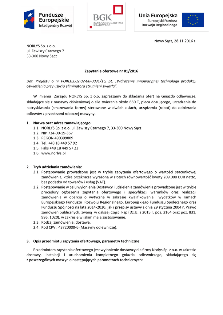 Nowy Sącz, 28.11.2016 r. NORLYS Sp. z o.o. ul. Zawiszy Czarnego 7 33-300 Nowy Sącz Zapytanie ofertowe nr 01/2016 Dot. Projektu o nr POIR.03.02.02-00-0031/16, pt. „Wdrożenie innowacyjnej technologii produkcji oświetlenia przy użyciu eliminatora strumieni światła”. W imieniu Zarządu NORLYS Sp. z o.o. zapraszamy do składania ofert na Gniazdo odlewnicze, składające się z maszyny ciśnieniowej o sile zwierania około 650 T, pieca dozującego, urządzenia do natryskiwania (smarowania formy) sterowane w dwóch osiach, urządzenia (robot) do odbierania odlewów z przestrzeni roboczej maszyny. 1. Nazwa oraz adres zamawiającego: 1.1. NORLYS Sp. z o.o. ul. Zawiszy Czarnego 7, 33-300 Nowy Sącz 1.2. NIP 734-00-19-367 1.3. REGON 490399809 1.4. Tel. +48 18 449 57 92 1.5. Faks +48 18 449 57 23 1.6. www.norlys.pl 2. Tryb udzielania zamówienia: 2.1. Postępowanie prowadzone jest w trybie zapytania ofertowego o wartości szacunkowej zamówienia, które przekracza wyrażoną w złotych równowartość kwoty 209.000 EUR netto, bez podatku od towarów i usług (VAT). 2.2. Postępowanie w celu wyłonienia Dostawcy i udzielenia zamówienia prowadzone jest w trybie procedury ogłoszenia zapytania ofertowego i specyfikacji warunków oraz realizacji zamówienia w oparciu o wytyczne w zakresie kwalifikowania wydatków w ramach Europejskiego Funduszu Rozwoju Regionalnego, Europejskiego Funduszu Społecznego oraz Funduszu Spójności na lata 2014-2020, jak i przepisy ustawy z dnia 29 stycznia 2004 r. Prawo zamówień publicznych, zwaną w dalszej części Pzp (Dz.U. z 2015 r. poz. 2164 oraz poz. 831, 996, 1020), w zakresie w jakim mają zastosowanie. 2.3. Rodzaj zamówienia: dostawa. 2.4. Kod CPV : 43720000-6 (Maszyny odlewnicze). 3. Opis przedmiotu zapytania ofertowego, parametry techniczne: Przedmiotem zapytania ofertowego jest wyłonienie dostawcy dla firmy Norlys Sp. z o.o. w zakresie dostawy, instalacji i uruchomienia kompletnego gniazda odlewniczego, składającego się z poszczególnych maszyn o następujących parametrach technicznych: 3.1. Maszyna odlewnicza ciśnieniowa pozioma o sile zwarcia nie mniejszej niż 650 T i nie większej niż 750 T (wielkości siły zwarcia mogą być podane w kN) z następującymi zespołami: 3.1.1.Zespół zamykania formy z automatyczną regulacją i pomiarem siły zamykania. 3.1.2. Hydrauliczny wypychacz z wyłącznikiem krańcowym. 3.1.3. Wyciąganie hydrauliczne górnej kolumny od strony operatora. 3.1.4. Zespół wyciągania rdzeni: płyta stała 1 szt., płyta ruchoma 2 szt. z płynną regulacją ciśnienia i szybkości ruchu rdzeni. 3.1.5. Automatycznie napędzane drzwi ochronne z obu stron maszyny z systemem zabezpieczeń, sterowane z poziomu maszyny. 3.1.6. Maszyna wtryskowa przystosowana do współpracy z urządzeniem próżniowym, typ urządzenia zostanie podany na etapie dostawy. 3.1.7. Monitorowanie zatarcia tłoka 3.1.8. Test wypełnienia formy 3.1.9. Skok płyty ruchomej nie mniejszy niż 750 mm 3.1.10. Maksymalna siła doprasowania nie mniejsza niż 700 kN 3.1.11. Zespół prasowania, sterowany w czasie rzeczywistym ze wzmacniaczem ciśnienia i systemem zaworów proporcjonalnych. 3.1.12. Zespół prasowania wyposażony w cyfrowy układ sterowania napełnianiem w czasie rzeczywistym dla faz wypełnienia i wzmocnienia z możliwością sterowania krzywą wtrysku i wzmocnienia nie mniej niż w 16 punktach ze sprzężeniem zwrotnym z czasem odpowiedzi hydraulicznych układów sterujących w czasie nie dłuższym niż 5 ms. 3.1.13. Programowalna prędkość tłoka i ciśnienie prasowania w momencie rozpoczynania produkcji w celu oszczędzania formy. 3.1.14. Automatyczne proszkowe smarowanie tłoka prasującego. 3.1.15. Squeze PIN kompletny z elektrozaworem i oddzielną hydrauliką montowany na płycie stałej lub ruchomej. 3.1.16. Interfejs do zdalnej komunikacji serwisowej. 3.1.17. Interfejs do podłączenia urządzenia grzewczo-chłodzącego dwuobiegowego. 3.2. Piec dozujący 3.2.1.Ogrzewany elektrooporowo, bez tyglowy piec podgrzewczo-dozujący, dozowanie roztopionego metalu pneumatyczne przez zanurzoną rurę dozującą. 3.2.2.Pojemność pieca nie mniejsza niż 650 kg 3.2.3.Stabilność temperaturowa nie mniejsza niż: + - 2o C 3.2.4.Dokładność dozowania nie mniejsza niż: + - 1,5 % 3.2.5.Napełnianie pieca płynnym metalem bez przerywania cyklu pracy maszyny. 3.2.6.Kompaktowe sterowanie dozowania ProDos 3 3.2.7.Podstawa podnoszona/przechylna wyposażona w siłownik hydrauliczny, pompę ręczną, wózek jezdniowy z mechanizmem zapadkowym do przesuwu pieca. 3.2.8. DISPO 035 Standard przyłącze Profibus z korektą piętki. 3.3. Urządzenia do natryskiwania ,smarowania formy 3.3.1.Wielkość spryskiwacza dostosowana do ofertowanej maszyny ciśnieniowej. 3.3.2.Zespół z suwami w poszczególnych osiach nie mniejszym niż: poziomym 1000 mm, pionowym 1300mm 3.3.3.Dwa oddzielne obwody do podawania środka smarnego na płytę stałą i ruchomą. 3.3.4.Program do spryskiwania rdzeni i kołków doprasowujących. 3.3.5.Urządzenie do przygotowania mieszanki spryskującej z koncentratu wraz z jednostkami: dozującą, mieszającą i podającą. 3.3.6.Głowica spryskująca modułowa: długość nie mniejsza niż 500 mm, oraz nie mniej niż po 15 dysz spryskujących po każdej stronie głowicy z możliwością regulacji: kierunku natrysku jak i jego natężenia, oddzielne dysze do przedmuchu powietrzem w ilości nie mniejszej niż po 10 z każdej strony. 3.4. Urządzenie, robot odbierający odlewy z przestrzeni roboczej maszyny 3.4.1.Wielkość robota odbierającego dostosowana do ofertowanej maszyny odlewniczej. 3.4.2.Robot ABB 3.4.3.Udźwig nie mniejszy niż 12 kg 3.4.4.Zespół fotokomórek do wykrywania obecności odlewu w ilości nie mniejszej niż: 6 szt. 3.4.5.Chwytak odbierający 3-szczękowy, średnica regulowana dostosowana do zakresu średnic tłoka zgodnej ze specyfikacją oferowanej maszyny. 3.4.6.Interfejs i panel sterujący, oprócz współ